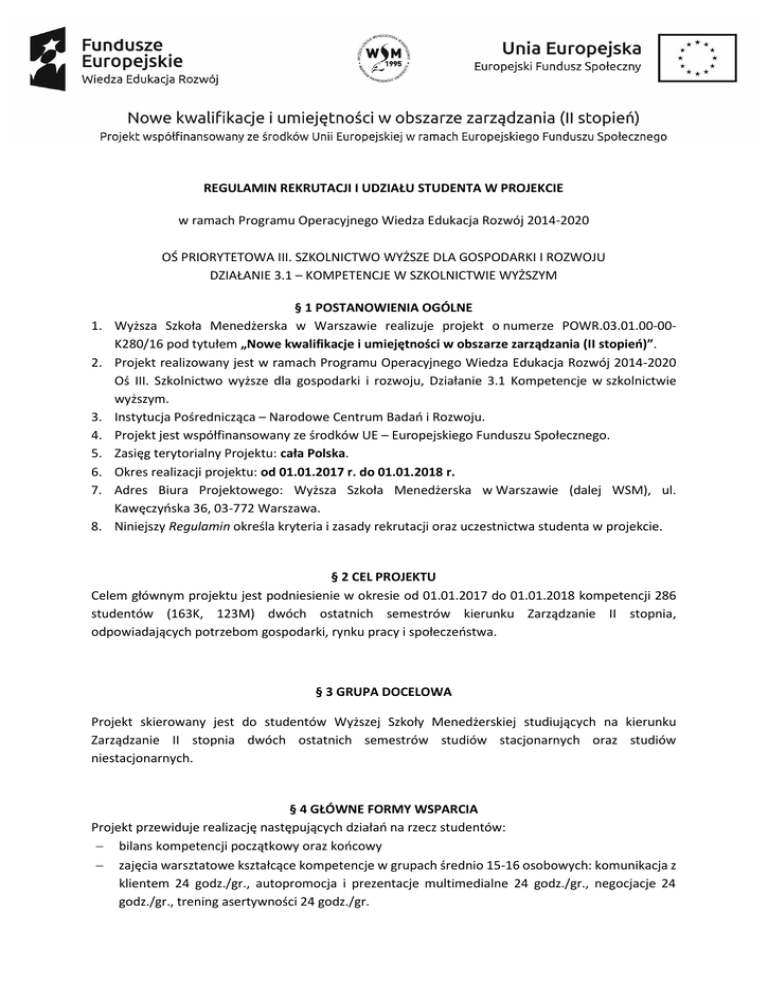 REGULAMIN REKRUTACJI I UDZIAŁU STUDENTA W PROJEKCIE w ramach Programu Operacyjnego Wiedza Edukacja Rozwój 2014-2020 OŚ PRIORYTETOWA III. SZKOLNICTWO WYŻSZE DLA GOSPODARKI I ROZWOJU DZIAŁANIE 3.1 – KOMPETENCJE W SZKOLNICTWIE WYŻSZYM § 1 POSTANOWIENIA OGÓLNE 1. Wyższa Szkoła Menedżerska w Warszawie realizuje projekt o numerze POWR.03.01.00-00K280/16 pod tytułem „Nowe kwalifikacje i umiejętności w obszarze zarządzania (II stopień)”. 2. Projekt realizowany jest w ramach Programu Operacyjnego Wiedza Edukacja Rozwój 2014-2020 Oś III. Szkolnictwo wyższe dla gospodarki i rozwoju, Działanie 3.1 Kompetencje w szkolnictwie wyższym. 3. Instytucja Pośrednicząca – Narodowe Centrum Badań i Rozwoju. 4. Projekt jest współfinansowany ze środków UE – Europejskiego Funduszu Społecznego. 5. Zasięg terytorialny Projektu: cała Polska. 6. Okres realizacji projektu: od 01.01.2017 r. do 01.01.2018 r. 7. Adres Biura Projektowego: Wyższa Szkoła Menedżerska w Warszawie (dalej WSM), ul. Kawęczyńska 36, 03-772 Warszawa. 8. Niniejszy Regulamin określa kryteria i zasady rekrutacji oraz uczestnictwa studenta w projekcie. § 2 CEL PROJEKTU Celem głównym projektu jest podniesienie w okresie od 01.01.2017 do 01.01.2018 kompetencji 286 studentów (163K, 123M) dwóch ostatnich semestrów kierunku Zarządzanie II stopnia, odpowiadających potrzebom gospodarki, rynku pracy i społeczeństwa. § 3 GRUPA DOCELOWA Projekt skierowany jest do studentów Wyższej Szkoły Menedżerskiej studiujących na kierunku Zarządzanie II stopnia dwóch ostatnich semestrów studiów stacjonarnych oraz studiów niestacjonarnych. § 4 GŁÓWNE FORMY WSPARCIA Projekt przewiduje realizację następujących działań na rzecz studentów: bilans kompetencji początkowy oraz końcowy zajęcia warsztatowe kształcące kompetencje w grupach średnio 15-16 osobowych: komunikacja z klientem 24 godz./gr., autopromocja i prezentacje multimedialne 24 godz./gr., negocjacje 24 godz./gr., trening asertywności 24 godz./gr. wizyty studyjne u pracodawców w grupach 12 osobowych, 16 godz./gr., polegające na poznaniu/obserwacji procesów zachodzących w przedsiębiorstwie w warunkach rzeczywistych, spotkania z praktykami, możliwość uczestniczenia w studiach przypadków – rozwiazywanie problemów z obszarów studiów kierunku pojawiających się w rzeczywistych warunkach pracy (nabycie kompetencji zawodowych, komunikacyjnych i analitycznych) dodatkowe zadania praktyczne realizowane wspólnie z pracodawcami w podziale na grupy 10 osobowe 24 godz./gr., zajęcia z zakresu zarządzania sytuacjami kryzysowymi w przedsiębiorstwie oraz zajęcia związane z przepływem informacji w firmie (nabycie kompetencji komunikacyjnych, zawodowych, przedsiębiorczych) dodatkowe zadania praktyczne realizowane w formie projektowej, w tym w ramach zespołów projektowych w podziale na grupy/zespoły projektowe 10-12 osobowe, 30 godz./gr. (plus posumowanie 1 godz./gr.) Tematyka: opracowanie założeń organizacyjnych firmy X: strategia budowania firmy, biznesplan (w tym analiza SWOT), komunikacja marketingowa, promocja przedsiębiorstwa oraz jako wsparcie, sposoby zarządzania projektem, innowacyjne rozwiązania dla branży, wykorzystanie nowoczesnych technologii, gry strategiczne : praktyczne aspekty przedsiębiorczości - praca na case studies: budżetowanie, cash flow, komunikacja w przedsiębiorstwie pełnienie różnych ról (pracownika, kierownika, zarządu, pozyskiwanie finansowania na działalność), (nabycie kompetencji przedsiębiorczych, komunikacyjnych, zawodowych) certyfikowane szkolenia prowadzące do uzyskania kwalifikacji. Zajęcia przygotowujące do egzaminu LCCI IQ English for Business na poziomie wyniku z testu kwalifikacyjnego wypełnionego przez uczestnika/czkę projektu w podziale na grupy maksymalnie 14 osobowych, 100 godz./gr. monitorowanie losów absolwentów w okresie 12 miesięcy od zakończenia udziału w projekcie. § 5 KRYTERIA REKRUTACJI 1. Ogólne kryteria dostępu: posiadanie statusu studenta kierunku Zarządzanie II stopnia Wyższej Szkoły Menedżerskiej ostatniego roku realizowanych studiów (wyłącznie studenci będący aktualnie na ostatnim roku studiów) złożenie kompletu poprawnie uzupełnionych dokumentów rekrutacyjnych w tym Regulaminu, do Biura Projektu. Wszystkie kryteria rekrutacyjne będą sprawdzane podczas weryfikacji formalnej dokumentów rekrutacyjnych przez Asystenta Projektu oraz na podstawie rozmowy wstępnej przeprowadzonej przez Zespół Projektowy: według oceny punktowej skala do 30 pkt na podstawie rozmowy: motywacja do udziału w projekcie i możliwość pełnego udziału w projekcie (1-15 pkt), oraz obszar preferencji zawodowej ( 1-15 pkt). Kryterium uzupełniającym rekrutacji jest kolejność zgłoszeń. Kryteria rekrutacji uwzględniają zasadę równych szans i niedyskryminacji, w tym płci i dostępności dla osób niepełnosprawnych. 2. Dokumenty rekrutacyjne można złożyć osobiście u Asystenta projektu od poniedziałku do piątku w godzinach 09.00-14.30 oraz soboty i niedziele w godz. 08.00-12.00 pokój F111 (lub w dowolnym terminie po wcześniejszym indywidualnym zgłoszeniu takiej potrzeby przez uczestnika projektu), przesłać elektronicznie lub pocztą do siedziby biura projektu. Dokumenty rekrutacyjne wysłane pocztą muszą być wysłane na adres Biura Projektu tj. Wyższa Szkoła Menedżerska w Warszawie, ul. Kawęczyńska 36, 03-772 Warszawa z dopiskiem „projekt K280”. Możliwe jest także przesłanie zgłoszenia faxem (skan mailem) z późniejszym dostarczeniem oryginału. Rekrutacja prowadzona jest w sposób ciągły od 02.01.2017 do 31.05.2017r. § 6 KRYTERIA UCZESTNICTWA W PROJEKCIE 1. Uczestnikami działań, które zostaną przeprowadzone w ramach Projektu mogą być wyłącznie osoby, które łącznie spełniają następujące warunki: zostały zakwalifikowane do udziału w projekcie na podstawie § 5 wypełniły, podpisały i dostarczyły do