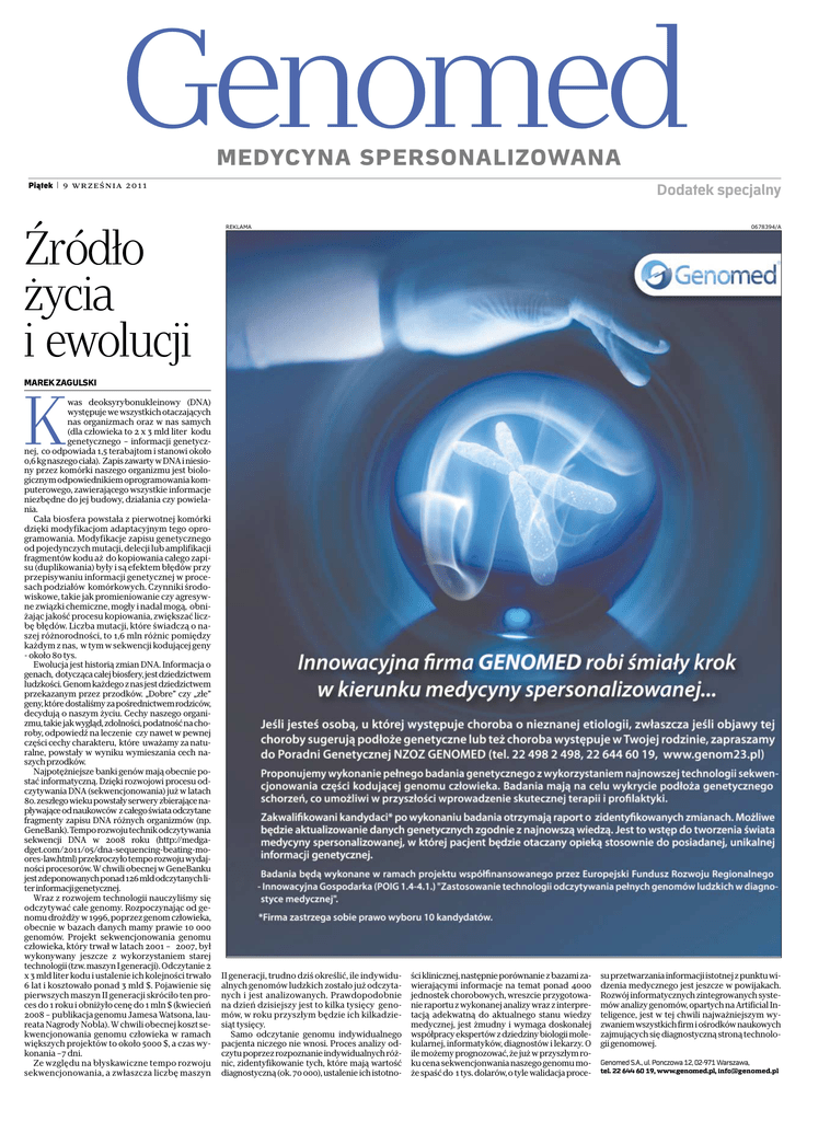 Genomed MEDYCYNA SPERSONALIZOWANA Piątek | 9 września 2011 Źródło życia i ewolucji Dodatek specjalny REKLAMA 0678394/A MAREK ZAGULSKI K was deoksyrybonukleinowy (DNA) występuje we wszystkich otaczających nas organizmach oraz w nas samych (dla człowieka to 2 x 3 mld liter kodu genetycznego – informacji genetycznej, co odpowiada 1,5 terabajtom i stanowi około 0,6 kg naszego ciała). Zapis zawarty w DNA i niesiony przez komórki naszego organizmu jest biologicznym odpowiednikiem oprogramowania komputerowego, zawierającego wszystkie informacje niezbędne do jej budowy, działania czy powielania. Cała biosfera powstała z pierwotnej komórki dzięki modyfikacjom adaptacyjnym tego oprogramowania. Modyfikacje zapisu genetycznego od pojedynczych mutacji, delecji lub amplifikacji fragmentów kodu aż do kopiowania całego zapisu (duplikowania) były i są efektem błędów przy przepisywaniu informacji genetycznej w procesach podziałów komórkowych. Czynniki środowiskowe, takie jak promieniowanie czy agresywne związki chemiczne, mogły i nadal mogą, obniżając jakość procesu kopiowania, zwiększać liczbę błędów. Liczba mutacji, które świadczą o naszej różnorodności, to 1,6 mln różnic pomiędzy każdym z nas, w tym w sekwencji kodującej geny - około 80 tys. Ewolucja jest historią zmian DNA. Informacja o genach, dotycząca całej biosfery, jest dziedzictwem ludzkości. Genom każdego z nas jest dziedzictwem przekazanym przez przodków. „Dobre” czy „złe” geny, które dostaliśmy za pośrednictwem rodziców, decydują o naszym życiu. Cechy naszego organizmu, takie jak wygląd, zdolności, podatność na choroby, odpowiedź na leczenie czy nawet w pewnej części cechy charakteru, które uważamy za naturalne, powstały w wyniku wymieszania cech naszych przodków. Najpotężniejsze banki genów mają obecnie postać informatyczną. Dzięki rozwojowi procesu odczytywania DNA (sekwencjonowania) już w latach 80. zeszłego wieku powstały serwery zbierające napływające od naukowców z całego świata odczytane fragmenty zapisu DNA różnych organizmów (np. GeneBank). Tempo rozwoju technik odczytywania sekwencji DNA w 2008 roku (http://medgadget.com/2011/05/dna-sequencing-beating-moores-law.html) przekroczyło tempo rozwoju wydajności procesorów. W chwili obecnej w GeneBanku jest zdeponowanych ponad 126 mld odczytanych liter informacji genetycznej. Wraz z rozwojem technologii nauczyliśmy się odczytywać całe genomy. Rozpoczynając od genomu drożdży w 1996, poprzez genom człowieka, obecnie w bazach danych mamy prawie 10 000 genomów. Projekt sekwencjonowania genomu człowieka, który trwał w latach 2001 – 2007, był wykonywany jeszcze z wykorzystaniem starej technologii (tzw. maszyn I generacji). Odczytanie 2 x 3 mld liter kodu i ustalenie ich kolejności trwało 6 lat i kosztowało ponad 3 mld $. Pojawienie się pierwszych maszyn II generacji skróciło ten proces do 1 roku i obniżyło cenę do 1 mln $ (kwiecień 2008 – publikacja genomu Jamesa Watsona, laureata Nagrody Nobla). W chwili obecnej koszt sekwencjonowania genomu człowieka w ramach większych projektów to około 5000 $, a czas wykonania –7 dni. Ze względu na błyskawiczne tempo rozwoju sekwencjonowania, a zwłaszcza liczbę maszyn II generacji, trudno dziś określić, ile indywidualnych genomów ludzkich zostało już odczytanych i jest analizowanych. Prawdopodobnie na dzień dzisiejszy jest to kilka tysięcy genomów, w roku przyszłym będzie ich kilkadziesiąt tysięcy. Samo odczytanie genomu indywidualnego pacjenta niczego nie wnosi. Proces analizy odczytu poprzez rozpoznanie indywidualnych różnic, zidentyfikowanie tych, które mają wartość diagnostyczną (ok. 70 000), ustalenie ich istotno- ści klinicznej, następnie porównanie z bazami zawierającymi informacje na temat ponad 4000 jednostek chorobowych, wreszcie przygotowanie raportu z wykonanej analizy wraz z interpretacją adekwatną do aktualnego stanu wiedzy medycznej, jest żmudny i wymaga doskonałej współpracy ekspertów z dziedziny biologii molekularnej, informatyków, diagnostów i lekarzy. O ile możemy prognozować, że już w przyszłym roku cena sekwencjonwania naszego genomu może spaść do 1 tys. dolarów, o tyle walidacja proce- su przetwarzania informacji istotnej z punktu widzenia medycznego jest jeszcze w powijakach. Rozwój informatycznych zintegrowanych systemów analizy genomów, opartych na Artificial Inteligence, jest w tej chwili najważniejszym wyzwaniem wszystkich firm i ośrodków naukowych zajmujących się diagnostyczną stroną technologii genomowej. Genomed S.A., ul. Ponczowa 12, 02-971 Warszawa, tel. 22 644 60 19, www.genomed.pl, [email protected] 2 Piątek | 9 września 2011 Genomed Terabajty danych MAREK ZAWADKA (3) ROZMOWA | Dr hab. Anna Boguszewska-Chachulska, dr Agnieszka Sobczyńska-Tomaszewska i dr hab. Marek Zagulski ≥Anna Boguszewska-Chachulska mikrogramowych i odczytujemy zawarte w nich informacje. Wybieramy geny wywołujące konkretną chorobę, którą u pacjenta podejrzewa lekarz, lub taką, która wystąpiła kiedyś w rodzinie pacjenta. Jest to diagnostyka pojedynczej choroby. Natomiast badanie dwudziestu kilku tysięcy genów człowieka i szukanie, w którym z nich pojawił się błąd, czyli sekwencjonowanie genomu, to z kolei diagnostyka wielu chorób i element profilaktyki. Prowadzą państwo takie badania na zlecenie? ≥Agnieszka Sobczyńska- ≥Marek Zagulski -Tomaszewska Czy poznanie genomu człowieka może wpłynąć na poprawę stanu zdrowia i jakości naszego życia? Dr hab. Marek Zagulski: Tak, ale wej, ten system przestaje właściwie działać i pojawiają się nowotwory. dotąd trudno było to osiągnąć ze względu na ograniczone możliwości technologiczne. Dotychczas badania genetyczne dotyczyły pojedynczych genów lub nawet ich fragmentów, których zmiany (mutacje) wiążą się z występowaniem określonej choroby. Diagnostyka kilkunast