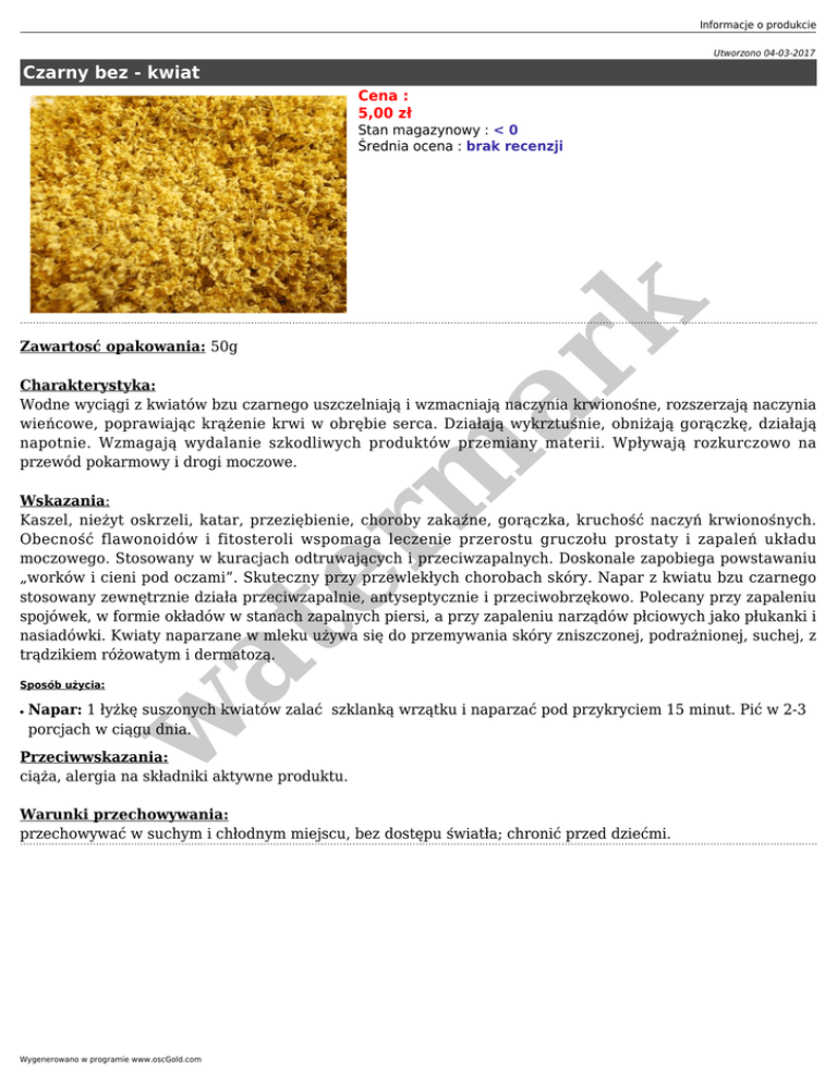 Informacje o produkcie Utworzono 04-03-2017 Czarny bez - kwiat Cena : 5,00 zł er m ar k Stan magazynowy : < 0 Średnia ocena : brak recenzji Zawartosć opakowania: 50g Charakterystyka: Wodne wyciągi z kwiatów bzu czarnego uszczelniają i wzmacniają naczynia krwionośne, rozszerzają naczynia wieńcowe, poprawiając krążenie krwi w obrębie serca. Działają wykrztuśnie, obniżają gorączkę, działają napotnie. Wzmagają wydalanie szkodliwych produktów przemiany materii. Wpływają rozkurczowo na przewód pokarmowy i drogi moczowe. Sposób użycia: Napar: 1 łyżkę suszonych kwiatów zalać szklanką wrzątku i naparzać pod przykryciem 15 minut. Pić w 2-3 porcjach w ciągu dnia. w ● at Wskazania: Kaszel, nieżyt oskrzeli, katar, przeziębienie, choroby zakaźne, gorączka, kruchość naczyń krwionośnych. Obecność flawonoidów i fitosteroli wspomaga leczenie przerostu gruczołu prostaty i zapaleń układu moczowego. Stosowany w kuracjach odtruwających i przeciwzapalnych. Doskonale zapobiega powstawaniu „worków i cieni pod oczami”. Skuteczny przy przewlekłych chorobach skóry. Napar z kwiatu bzu czarnego stosowany zewnętrznie działa przeciwzapalnie, antyseptycznie i przeciwobrzękowo. Polecany przy zapaleniu spojówek, w formie okładów w stanach zapalnych piersi, a przy zapaleniu narządów płciowych jako płukanki i nasiadówki. Kwiaty naparzane w mleku używa się do przemywania skóry zniszczonej, podrażnionej, suchej, z trądzikiem różowatym i dermatozą. Przeciwwskazania: ciąża, alergia na składniki aktywne produktu. Warunki przechowywania: przechowywać w suchym i chłodnym miejscu, bez dostępu światła; chronić przed dziećmi. Wygenerowano w programie www.oscGold.com