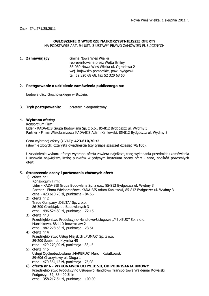 Nowa Wieś Wielka, 1 sierpnia 2011 r. Znak: ZPL.271.25.2011 OGŁOSZENIE O WYBORZE NAJKORZYSTNIEJSZEJ OFERTY NA PODSTAWIE ART. 94 UST. 3 USTAWY PRAWO ZAMÓWIEŃ PUBLICZNYCH 1. Zamawiający: Gmina Nowa Wieś Wielka reprezentowana przez Wójta Gminy 86-060 Nowa Wieś Wielka ul. Ogrodowa 2 woj. kujawsko-pomorskie, pow. bydgoski tel. 52 320 68 68, fax 52 320 68 50 2. Postępowanie o udzielenie zamówienia publicznego na: budowa ulicy Grochowskiego w Brzozie. 3. Tryb postępowania: przetarg nieograniczony. 4. Wybrano ofertę: Konsorcjum Firm: Lider - KADA-BIS Grupa Budowlana Sp. z o.o., 85-812 Bydgoszcz ul. Wydmy 3 Partner - Firma WielobranŜowa KADA-BIS Adam Kaniewski, 85-812 Bydgoszcz ul. Wydmy 3 Cena wybranej oferty (z VAT): 423.610,70 zł (słownie złotych: czterysta dwadzieścia trzy tysiące sześćset dziesięć 70/100). Uzasadnienie wyboru oferty: wybrana oferta zawiera najniŜszą cenę wykonania przedmiotu zamówienia i uzyskała największą liczbę punktów w jedynym kryterium oceny ofert - cena, spośród pozostałych ofert. 5. Streszczenie oceny i porównania złoŜonych ofert: 1) oferta nr 1 Konsorcjum Firm: Lider - KADA-BIS Grupa Budowlana Sp. z o.o., 85-812 Bydgoszcz ul. Wydmy 3 Partner - Firma WielobranŜowa KADA-BIS Adam Kaniewski, 85-812 Bydgoszcz ul. Wydmy 3 cena - 423.610,70 zł, punktacja - 84,56 2) oferta nr 2 Trade Company „DELTA” Sp. z o.o. 86-300 Grudziądz ul. Budowlanych 3 cena - 496.524,89 zł, punktacja - 72,15 3) oferta nr 3 Przedsiębiorstwo Produkcyjno-Handlowo-Usługowe „MEL-BUD” Sp. z o.o. Marcinkowo, 88-110 Inowrocław 2 cena - 487.278,53 zł, punktacja - 73,51 4) oferta nr 4 Przedsiębiorstwo Usług Miejskich „PUMAK” Sp. z o.o. 89-200 Szubin ul. Kcyńska 45 cena - 429.270,00 zł, punktacja - 83,45 5) oferta nr 5 Usługi Ogólnobudowlane „MARBRUK” Marcin Kwiatkowski 89-606 Charzykowy ul. Długa 1 cena - 470.864,42 zł, punktacja - 76,08 6) oferta nr 6 - WYKONAWCA UCHYLIŁ SIĘ OD PODPISANIA UMOWY Przedsiębiorstwo Produkcyjno Usługowo Handlowo Transportowe Waldemar Kowalski Podgórzyn 62, 88-400 śnin cena - 358.217,54 zł, punktacja - 100,00