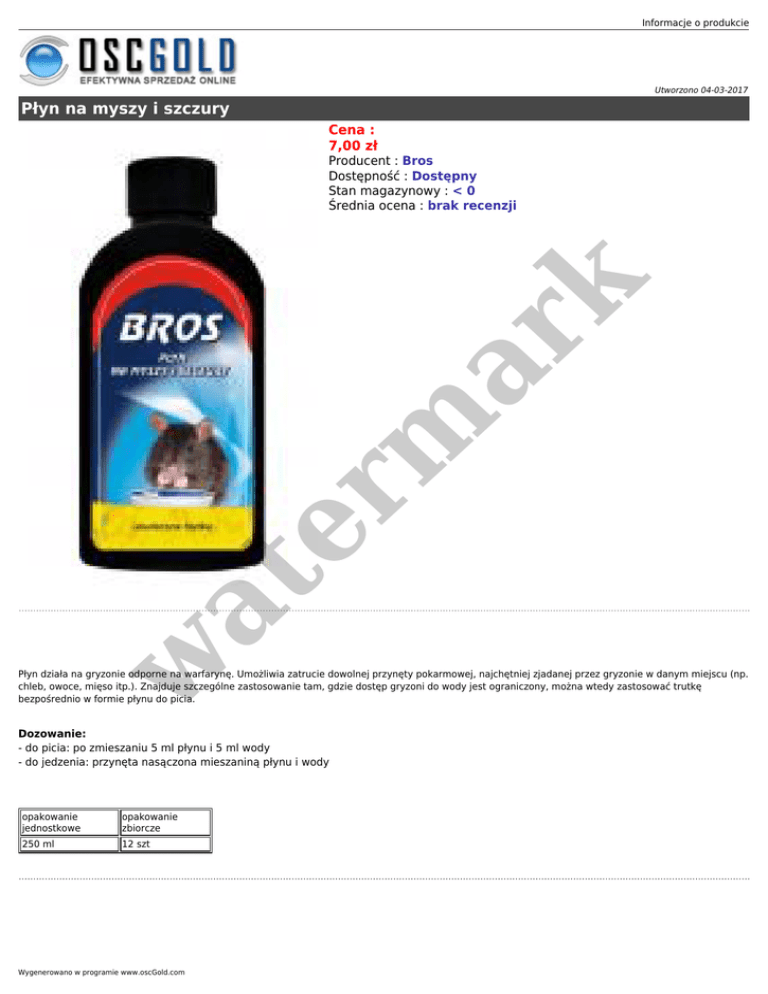 Informacje o produkcie Utworzono 04-03-2017 Płyn na myszy i szczury Cena : 7,00 zł w at er m ar k Producent : Bros Dostępność : Dostępny Stan magazynowy : < 0 Średnia ocena : brak recenzji Płyn działa na gryzonie odporne na warfarynę. Umożliwia zatrucie dowolnej przynęty pokarmowej, najchętniej zjadanej przez gryzonie w danym miejscu (np. chleb, owoce, mięso itp.). Znajduje szczególne zastosowanie tam, gdzie dostęp gryzoni do wody jest ograniczony, można wtedy zastosować trutkę bezpośrednio w formie płynu do picia. Dozowanie: - do picia: po zmieszaniu 5 ml płynu i 5 ml wody - do jedzenia: przynęta nasączona mieszaniną płynu i wody opakowanie jednostkowe opakowanie zbiorcze 250 ml 12 szt Wygenerowano w programie www.oscGold.com