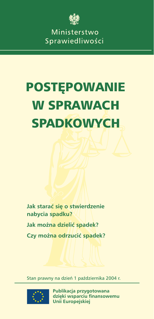 POST¢POWANIE W SPRAWACH SPADKOWYCH Jak staraç si´ o stwierdzenie nabycia spadku? Jak mo˝na dzieliç spadek? Czy mo˝na odrzuciç spadek? Stan prawny na dzieƒ 1 paêdziernika 2004 r. Publikacja przygotowana dzi´ki wsparciu finansowemu Unii Europejskiej 2 Informacje zawarte w broszurze pozwolà Paƒstwu znaleêç odpowiedzi na podstawowe pytania, które najcz´Êciej zadajecie w sekretariatach sàdowych. O ewentualne porady prawne nale˝y zwróciç si´ do prawnika. 3 Post´powanie spadkowe Spadkiem nazywamy prawa i obowiàzki majàtkowe zmar∏ego, które przechodzà na spadkobierców z datà jego Êmierci. Przeprowadzenie post´powania sàdowego w sprawie spadkowej nie jest obowiàzkowe. Nie b´dzie w ogóle potrzebne, je˝eli majàtek zmar∏ego jest niewielki (np. obejmuje tylko drobne ruchomoÊci). Nie jest te˝ ograniczone ˝adnym terminem, mo˝e wi´c mieç miejsce nawet po kilkudziesi´ciu latach po Êmierci spadkodawcy. Pami´taj!! Up∏yw czasu nie ma wp∏ywu na to, kto zostanie uznany za spadkobierc´, poniewa˝ o tym, kto jest spadkobiercà, decyduje stan istniejàcy w chwili Êmierci spadkodawcy. Je˝eli wi´c któryÊ ze spadkobierców (który ˝y∏ w momencie Êmierci spadkodawcy) umrze przed z∏o˝eniem wniosku o stwierdzenie nabycia spadku, to i tak w postanowieniu sàdu zostanie uznany za spadkobierc´, a to, co odziedziczy∏, wejdzie do spadku po nim. Pierwszym krokiem do za∏atwienia kwestii spadkowych jest z∏o˝enie wniosku o stwierdzenie nabycia spadku. PowinieneÊ go z∏o˝yç do sàdu rejonowego, w którego okr´gu spadkodawca ostatnio stale zamieszkiwa∏. W jednym wniosku mo˝esz ˝àdaç stwierdzenia nabycia spadku po kilku osobach. 4 Wniosek taki powinien zawieraç: • imi´, nazwisko i adres osoby sk∏adajàcej wniosek (wnioskodawca) oraz imiona, nazwiska i adresy potencjalnych spadkobierców ustawowych i testamentowych (uczestnicy post´powania); • imi´ i nazwisko zmar∏ego, dat´ i miejsce (miejscowoÊç) jego Êmierci oraz jego ostatnie miejsce sta∏ego zamieszkania; • akt zgonu oraz inne akty stanu cywilnego wskazujàce na pokrewieƒstwo ze zmar∏ym osób wskazanych we wniosku jako spadkobiercy (odpis skrócony aktu urodzenia, odpis skrócony aktu ma∏˝eƒstwa); • orygina∏y testamentów, je˝eli zmar∏y zostawi∏. Nale˝y równie˝ do∏àczyç odpisy wniosku w iloÊci odpowiadajàcej liczbie uczestników post´powania. Wniosek nale˝y op∏aciç znakami op∏aty sàdowej lub przelewem w kwocie 20 z∏ (je˝eli wniosek obejmuje wi´cej ni˝ jednego spadkodawc´ – po 20 z∏ od ka˝dego spadkodawcy). Pami´taj! Je˝eli nie podasz we wniosku wszystkich tych informacji bàdê nie op∏acisz go, sàd wezwie Ci´ do jego uzupe∏nienia. PowinieneÊ zawsze wykonywaç wezwania zawarte w pismach, które sàd Ci przyÊle i przestrzegaç podanych w nich terminów. JeÊli nie jesteÊ w stanie czegoÊ wykonaç, poinformuj o tym sàd na piÊmie. Po z∏o˝eniu kompletnego wniosku s´dzia wyznacza rozpraw´, na którà wzywa wnioskodawc´ i uczestników post´powania. Pouczenie o obowiàzku lub bra- 5 ku obowiàzku stawiennictwa w sàdzie znajdziesz na wezwaniu na rozpraw´. Po przeprowadzeniu rozprawy sàd wydaje postanowienie o stwierdzeniu nabycia spadku, w którym wymienia spadkodawc´ oraz wszystkich spadkobierców, którym spadek przypad∏, jak równie˝ wysokoÊç ich udzia∏ów (w postaci u∏amka). Pami´taj! Sàd stwierdzi nabycie spadku przez spadkobierców, choçby by∏y nimi inne osoby ni˝ te, które wskazali uczestnicy. Nie ma na to wp∏ywu, kto ze spadkobierców przyszed∏ na rozpraw´. Je˝eli jesteÊ niezadowolony z postanowienia, mo˝esz si´ od niego odwo∏aç. Je˝eli ˝aden z uczestników post´powania tego nie uczyni, to postanowienie uprawomocni si´ po 3 tygodniach od jego og∏oszenia. Wtedy dopiero mo˝esz otrzymaç jego odpis z informacjà o jego prawomocnoÊci. Sàd wysy∏a odpisy postanowienia wy∏àcznie na wniosek zainteresowanego. Wniosek musi byç op∏acony (6 z∏ za ka˝dà stron´ postanowienia). Pami´taj! Po uprawomocnieniu si´ postanowienia sàd przesy∏a jego odpis do urz´du skarbowego. PowinieneÊ si´ rozliczyç z podatku od spadków i darowizn. 6 Postanowienie o stwierdzeniu nabycia spadku Takie postanowienie potwierdza przejÊcie majàtku na spadkobierców. Jest podstawà np. wpisania ich jako nowych w∏aÊcicieli nieruchomoÊci do ksi´gi wieczystej, umo˝liwia im dost´p do rachunków bankowych, daje podstaw´ przerejestrowania samochodu itp. Je˝eli ca∏y spadek odziedziczy∏ jeden spadkobierca, to do za∏atwienia pozostajà jedynie formalnoÊci zwiàzane z przepisaniem majàtku na nowego w∏aÊciciela. Gdy spadkobierców jest wi´cej, mogà oni znieÊç wspólnoÊç majàtku spadkowego, rozdzielajàc pomi´dzy siebie poszczególne przedmioty majàtkowe. Jest to dzia∏ spadku. Je˝eli wszyscy spadkobiercy zgadzajà si´ co do tego, komu przypadnà konkretne przedmioty, mogà za∏atwiç t´ spraw´ umownie. Je˝eli w sk∏ad spadku wchodzi∏a nieruchomoÊç, umowa musi mieç form´ aktu notarialnego, w pozosta∏ych przypadkach dzia∏u mo˝na dokonaç nawet ustnie. Jednak je˝eli do spadku wszed∏ np. samochód (albo inne przedmioty podlegajàce rejestracji), to do jego przerejestrowania potrzebne b´dzie przedstawienie w urz´dzie umowy na piÊmie. Spadkobiercy mogà te˝ udaç si´ do sàdu i za˝àdaç sàdowego dzia∏u spadku, sk∏adajàc pisemny wniosek. We wniosku o dzia∏ spadku nale˝y podaç: • imiona, nazwiska i adresy wszystkich spadkobierców; • ca∏y odziedziczony majàtek oraz jego przybli˝onà wartoÊç; 7 • je˝eli spadkodawca pozostawi∏ testament lub testamenty, nale˝y wymieniç je wszystkie i podaç, gdzie zosta∏y z∏o˝one i gdzie si´ znajdujà; • je˝eli w sk∏ad spadku wchodzi nieruchomoÊç, to trzeba przedstawiç dowody, ˝e nieruchomoÊç ta stanowi∏a w∏asnoÊç spadkodawcy (np. odpis z ksi´gi wieczystej); • nale˝y do