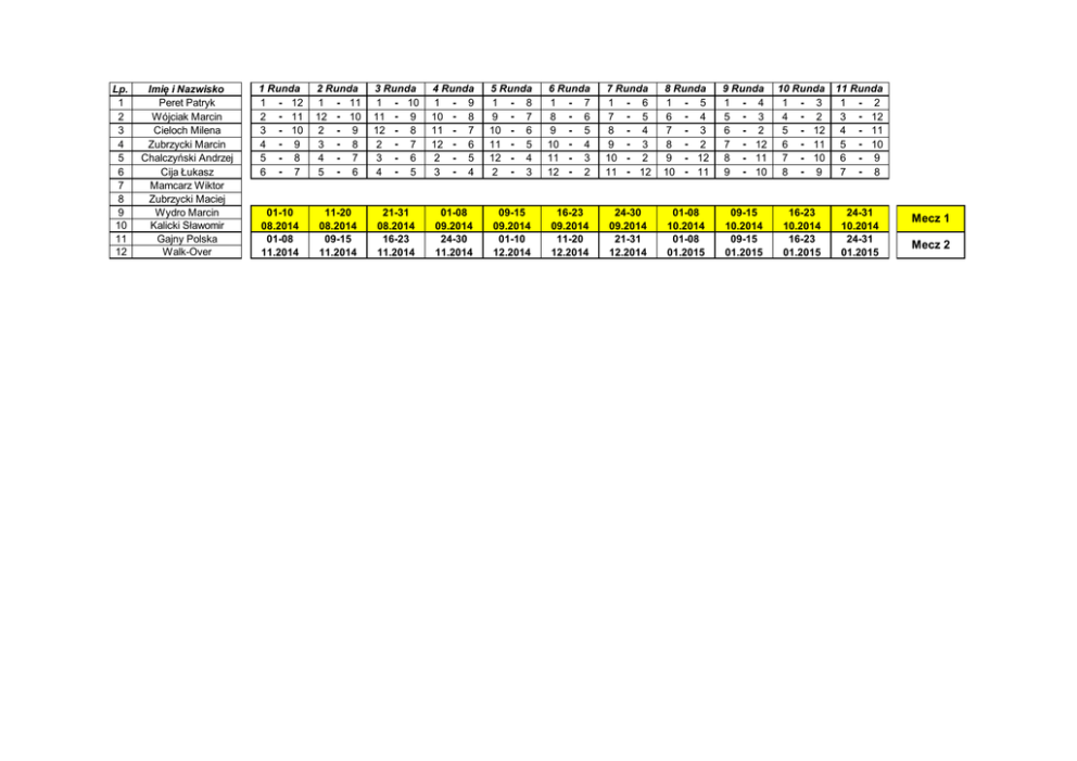 Lp. 1 2 3 4 5 6 7 8 9 10 11 12 Imię i Nazwisko Peret Patryk Wójciak Marcin Cieloch Milena Zubrzycki Marcin Chalczyński Andrzej Cija Łukasz Mamcarz Wiktor Zubrzycki Maciej Wydro Marcin Kalicki Sławomir Gajny Polska Walk-Over 1 Runda 1 - 12 2 - 11 3 - 10 4 - 9 5 - 8 6 - 7 2 Runda 1 - 11 12 - 10 2 - 9 3 - 8 4 - 7 5 - 6 3 Runda 1 - 10 11 - 9 12 - 8 2 - 7 3 - 6 4 - 5 4 Runda 1 - 9 10 - 8 11 - 7 12 - 6 2 - 5 3 - 4 5 Runda 1 - 8 9 - 7 10 - 6 11 - 5 12 - 4 2 - 3 6 Runda 1 - 7 8 - 6 9 - 5 10 - 4 11 - 3 12 - 2 7 Runda 1 - 6 7 - 5 8 - 4 9 - 3 10 - 2 11 - 12 8 Runda 1 - 5 6 - 4 7 - 3 8 - 2 9 - 12 10 - 11 9 Runda 1 - 4 5 - 3 6 - 2 7 - 12 8 - 11 9 - 10 10 Runda 1 - 3 4 - 2 5 - 12 6 - 11 7 - 10 8 - 9 11 Runda 1 - 2 3 - 12 4 - 11 5 - 10 6 - 9 7 - 8 01-10 08.2014 01-08 11.2014 11-20 08.2014 09-15 11.2014 21-31 08.2014 16-23 11.2014 01-08 09.2014 24-30 11.2014 09-15 09.2014 01-10 12.2014 16-23 09.2014 11-20 12.2014 24-30 09.2014 21-31 12.2014 01-08 10.2014 01-08 01.2015 09-15 10.2014 09-15 01.2015 16-23 10.2014 16-23 01.2015 24-31 10.2014 24-31 01.2015 Mecz 1 Mecz 2