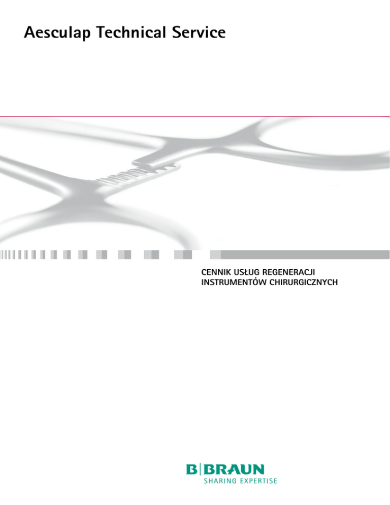 Aesculap Technical Service CENNIK USŁUG REGENERACJI INSTRUMENTÓW CHIRURGICZNYCH CENNIK USŁUG REGENERACJI INSTRUMENTÓW CHIRURGICZNYCH Nazwa Blaszki ortopedyczne cena netto cena brutto 16,00 zł 19,52 zł Blaszki ortopedyczne zakrzywiane 21,00 zł 25,62 zł Cążki do skórek i paznokci 35,00 zł 42,70 zł Dłuta, osteotomy, raspatory 25,00 zł 30,50 zł Drobne narzędzia stomatologiczne 15,00 zł 18,30 zł Dziurkacz PKS ( SP-045 ) 65,00 zł 79,30 zł Dźwignia do korzeni 22,00 zł 26,84 zł Frezy do stawów różne 35,00 zł 42,70 zł Frezy kuliste 25,00 zł 30,50 zł Haczyk do piłki drutowej 25,00 zł 30,50 zł Haki do gwoździ Kirschnera 40,00 zł 48,80 zł Haki różne 25,00 zł 30,50 zł Haki z powłoką chromowo-niklową 60,00 zł 73,20 zł Igła do biopsji bez niklowania 45,00 zł 54,90 zł Igły Deschamps 22,00 zł 26,84 zł Imadła chirurgiczne z twardą wkładką 80,00 zł 97,60 zł Imadła chirurgiczne zwykle 26,00 zł 31,72 zł Klamry ortopedyczne 65,00 zł 79,30 zł Kleszcz do cięcia gipsu typ Stille 65,00 zł 79,30 zł Kleszcze do cięcia drutu ( obrotowe) 80,00 zł 97,60 zł Kleszcze do cięcia żeber typ Liston 80,00 zł 97,60 zł Kleszcze do trzymania kości 60,00 zł 73,20 zł Kleszcze ekstrakcyjne 30,00 zł 36,60 zł Kleszcze jelitowe 25,00 zł 30,50 zł Kleszcze ort. do cięcia drutu typ KO-910 45,00 zł 54,90 zł Kleszcze ort. do cięcia drutu typ OP-013 55,00 zł 67,10 zł Kleszcze ort. z wym.wkł. typ KO-908 98,00 zł 119,56 zł Kleszcze protetyczne 22,00 zł 26,84 zł Kleszcze protetyczne do cięcia drutu 45,00 zł 54,90 zł Kleszcze z przekładnią do cięcia drutu 150,00 zł 183,00 zł Kleszcze z przekładnią do cięcia drutu 150,00 zł 183,00 zł Kleszczyki naczyniowe 22,00 zł 26,84 zł Końcówki ssące 25,00 zł 30,50 zł Kosze narzędziowe 30,00 zł 36,60 zł Łyżeczki kostne 25,00 zł 30,50 zł Młotki 35,00 zł 42,70 zł Narzędzia artroskopowe 65,00 zł 79,30 zł Narzędzia laparoskopowe 50,00 zł 61,00 zł Noże Beckmana 28,00 zł 34,16 zł Noże do mikrotomu 28,00 zł 34,16 zł Noże sekcyjne 25,00 zł 30,50 zł Nazwa cena netto cena brutto Nożyczki 23,00 zł 28,06 zł Nożyczki do gipsu 26,00 zł 31,72 zł Nożyczki wieloczynnościowe 26,00 zł 31,72 zł Nożyczki z twardą wkładką 28,00 zł 34,16 zł Odgryzacze kostne 60,00 zł 73,20 zł Odgryzacze kostne typ Kerisson 70,00 zł 85,40 zł Odgryzacze kostne typ Rongeure 70,00 zł 85,40 zł Odgryzacze typ Luery 60,00 zł 73,20 zł Opinaki Backchaus 20,00 zł 24,40 zł Perforator do skóry 80,00 zł 97,60 zł 140,00 zł 170,80 zł Pętla migdałkowa 40,00 zł 48,80 zł Piłki 15,00 zł 18,30 zł Piłki amputacyjne z powłoką chromowo-niklową 65,00 zł 79,30 zł Piły amputacyjne 45,00 zł 54,90 zł Pincety / różne 15,00 zł 18,30 zł Pincety z twardą wkładką 50,00 zł 61,00 zł Podważki kostne 30,00 zł 36,60 zł Pudełka do igieł 20,00 zł 24,40 zł Rama typ Collin 70,00 zł 85,40 zł Retraktor nastawny linkowy 100,00 zł 122,00 zł Rongeure (FF800R-dorabianie szczęk) 180,00 zł 219,60 zł Rozsz. gin. typ Hegar z powłoką chromowo-niklową 40,00 zł 48,80 zł Rozszerzadło Hegara 19,00 zł 23,18 zł Rozwieracz do ran 40,00 zł 48,80 zł Rozwieracz do ran przegubowy 65,00 zł 79,30 zł Perforator do skóry (dorabianie tulejek) Rozwieracz typ Finochietto 150,00 zł 183,00 zł Skalpele, noże 15,00 zł 18,30 zł Skrobaczki ginekologiczne, sondy 25,00 zł 30,50 zł Szczęko-rozwieracz do ran typ Roser 40,00 zł 48,80 zł 120,00 zł 146,40 zł Tacki do narzędzi chirurgicznych 65,00 zł 79,30 zł Wiertarki ręczne 80,00 zł 97,60 zł Wiertła 10,00 zł 12,20 zł Wkrętaki kostne 30,00 zł 36,60 zł Wzierniki Cusko z powłoką chromowo-niklową 60,00 zł 73,20 zł Wzierniki dwułyżkowe z powłoką chromowo-niklową 70,00 zł 85,40 zł Wzierniki ginekologiczne nierdzewne 35,00 zł 42,70 zł Wzierniki nosowe 30,00 zł 36,60 zł Wzierniki uszne 20,00 zł 24,40 zł 2,00 zł 2,44 zł Szczęko-rozwieracz typ Whitehead Znakowanie elektro-chemiczne Ogólne zasady dla usługi Regeneracji: 1. Usługa Regeneracji obejmuje kompleksową naprawę instrumentów wraz z wymianą niezbędnych części i pełną obróbką powierzchni. Takie przeprowadzenie naprawy gwarantuje przywrócenie bezpieczeństwa i pełnej funkcjonalności narzędzi. 2. Na wykonaną usługę dajemy 6-cio miesięczną gwarancję. 3. Standardowy czas wykonania usługi to 14 dni po przesłaniu narzędzi wraz ze zleceniem lub po zaakceptowaniu wyceny na piśmie (faksem pod nr: 061 420452 lub pocztą). 4. Zlecenie powinno zawierać: informację czy instrumenty zostały poddane procesom dezynfekcji, specyfikację ilościową (nazwę lub opis przedmiotu, ilości poszczególnych instrumentów) oraz ewentualne uwagi dotyczące dodatkowego oznakowania, przesyłki lub fakturowania. 5. Na zleceniu prosimy podać również dane osoby do kontaktu z Państwa strony (imię, nazwisko oraz nr telefonu) – pozwoli to na przekazanie informacji o kosztach naprawy oraz uzgodnienie czasu i miejsca dostawy zregenerowanych narzędzi. 6. Istnieje możliwość skrócenia czasu usługi (usługa ekspresowa) po uzgodnieniu z Kierownikiem Działu Regeneracji. 7. Dla imadeł chirurgicznych z twardą wkładką (pozycja nr 16) czas oczekiwania może ulec wydłużeniu ze względu na technologię wykonania. 8. Instrumenty niklowane i/lub chromowane - czas oczekiwania dłuższy ze względu na technologię wykonania. 9. Narzędzia nieopisane w cenniku będą wyceniane indywidualnie a termin wykonania usługi zostaje określony podczas wyceny. 10.Narzędzia przesyłacie Państwo na własny koszt jeśli umowa serwisowa nie stanowi inaczej. 11.W razie wszelkich pytań prosimy o kontakt bezpośrednio z Działem Regeneracji naszej firmy: tel. 0 61 44 20 451 lub 061 44 20 452. AESCULAP CHIFA Sp. z o.o. ul. Tysi¹clecia 14, 64-300 Nowy Tomyœl, tel. 061 44 20 300 fax 061 44 20 282 www.chifa.com.pl e-mail: [email protected]