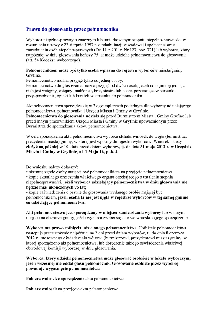 Prawo do głosowania przez pełnomocnika Wyborca niepełnosprawny o znacznym lub umiarkowanym stopniu niepełnosprawności w rozumieniu ustawy z 27 sierpnia 1997 r. o rehabilitacji zawodowej i społecznej oraz zatrudnieniu osób niepełnosprawnych (Dz. U. z 2011r. Nr 127, poz. 721) lub wyborca, który najpóźniej w dniu głosowania kończy 75 lat może udzielić pełnomocnictwa do głosowania (art. 54 Kodeksu wyborczego). Pełnomocnikiem może być tylko osoba wpisana do rejestru wyborców miasta/gminy Gryfino. Pełnomocnictwo można przyjąć tylko od jednej osoby. Pełnomocnictwo do głosowania można przyjąć od dwóch osób, jeżeli co najmniej jedną z nich jest wstępny, zstępny, małżonek, brat, siostra lub osoba pozostająca w stosunku przysposobienia, opieki lub kurateli w stosunku do pełnomocnika. Akt pełnomocnictwa sporządza się w 3 egzemplarzach po jednym dla wyborcy udzielającego pełnomocnictwa, pełnomocnika i Urzędu Miasta i Gminy w Gryfinie. Pełnomocnictwa do głosowania udziela się przed Burmistrzem Miasta i Gminy Gryfino lub przed innym pracownikiem Urzędu Miasta i Gminy w Gryfinie upoważnionym przez Burmistrza do sporządzania aktów pełnomocnictwa. W celu sporządzenia aktu pełnomocnictwa wyborca składa wniosek do wójta (burmistrza, prezydenta miasta) gminy, w której jest wpisany do rejestru wyborców. Wniosek należy złożyć najpóźniej w 10. dniu przed dniem wyborów, tj. do dnia 31 maja 2012 r. w Urzędzie Miasta i Gminy w Gryfinie, ul. 1 Maja 16, pok. 4 Do wniosku należy dołączyć: • pisemną zgodę osoby mającej być pełnomocnikiem na przyjęcie pełnomocnictwa • kopię aktualnego orzeczenia właściwego organu orzekającego o ustaleniu stopnia niepełnosprawności, jeżeli wyborca udzielający pełnomocnictwa w dniu głosowania nie będzie miał ukończonych 75 lat; • kopię zaświadczenia o prawie do głosowania wydanego osobie mającej być pełnomocnikiem, jeżeli osoba ta nie jest ujęta w rejestrze wyborców w tej samej gminie co udzielający pełnomocnictwa. Akt pełnomocnictwa jest sporządzany w miejscu zamieszkania wyborcy lub w innym miejscu na obszarze gminy, jeżeli wyborca zwróci się o to we wniosku o jego sporządzenie. Wyborca ma prawo cofnięcia udzielonego pełnomocnictwa. Cofnięcie pełnomocnictwa następuje przez złożenie najpóźniej na 2 dni przed dniem wyborów, tj. do dnia 8 czerwca 2012 r., stosownego oświadczenia wójtowi (burmistrzowi, prezydentowi miasta) gminy, w której sporządzono akt pełnomocnictwa, lub doręczenie takiego oświadczenia właściwej obwodowej komisji wyborczej w dniu głosowania. Wyborca, który udzielił pełnomocnictwa może głosować osobiście w lokalu wyborczym, jeżeli wcześniej nie oddał głosu pełnomocnik. Głosowanie osobiste przez wyborcę powoduje wygaśnięcie pełnomocnictwa. Pobierz wniosek o sporządzenie aktu pełnomocnictwa: Pobierz wniosek na przyjęcie aktu pełnomocnictwa: WNIOSEK O SPORZĄDZENIE AKTU PEŁNOMOCNICTWA DO GŁOSOWANIA W REFERENDUM LOKALNYM ZARZĄDZONYM NA DZIEŃ 10 CZERWCA 2012R. Miejsce składania wniosku Burmistrz Miasta i Gminy Gryfino Dane wyborcy udzielającego pełnomocnictwa do głosowania Imię (imiona): Nazwisko: Imię ojca: Data urodzenia (dzień-miesiąc-rok): Numer PESEL: Adres zamieszkania: Dane osoby, która wyraziła zgodę na przyjęcie pełnomocnictwa Imię (imiona): Nazwisko: Imię ojca: Data urodzenia (dzień-miesiąc-rok): Numer PESEL: Adres zamieszkania: Osoba, która wyraziła zgodę na przyjęcie pełnomocnictwa jest dla wyborcy wstępnym**, zstępnym***, małżonkiem, bratem, siostrą, albo osobą pozostającą w stosunku przysposobienia, opieki albo kurateli: TAK Do wniosku załączono: NIE* 1. pisemną zgodę osoby, która wyraziła zgodę na przyjęcie pełnomocnictwa; 2. kopię aktualnego orzeczenia właściwego organu orzekającego o ustaleniu stopnia niepełnosprawności wyborcy (nie dotyczy wyborcy, który najpóźniej w dniu głosowania kończy 75 lat); 3. kopię zaświadczenia o prawie do głosowania wydanego osobie, która wyraziła zgodę na przyjęcie pełnomocnictwa (załącza się wyłącznie w przypadku, gdy osoba, która wyraziła zgodę na przyjęcie pełnomocnictwa, nie jest wpisana do rejestru wyborców w tej samej gminie, co wyborca udzielający pełnomocnictwa do głosowania); 4. kopię dokumentu potwierdzającego pozostawanie wyborcy z osobą, która wyraziła zgodę na przyjęcie pełnomocnictwa, w stosunku przysposobienia/opieki/kurateli* (załącza się wyłącznie w przypadku, gdy taki stosunek istnieje). Miejsce sporządzenia aktu pełnomocnictwa do głosowania (wypełnić jedynie w przypadku, gdy ma być ono inne niż miejsce zamieszkania wyborcy udzielającego pełnomocnictwa do głosowania): Oświadczenia Oświadczam, że wszystkie dane zawarte we wniosku są zgodne z prawdą. Wyborca wyraża zgodę na to, by w postępowaniu w sprawie sporządzenia aktu pełnomocnictwa był reprezentowany przez osobę, która wyraziła zgodę na przyjęcie pełnomocnictwa: TAK NIE* Wyborca nie może lub nie umie złożyć podpisu: TAK NIE* Data wypełnienia (dzień-miesiąc-rok): Podpis wyborcy (w przypadku gdy wyborca nie może lub nie umie złożyć podpisu, w miejscu tym podpis składa osoba, która wyraziła zgodę na przyjęcie pełnomocnictwa): Adnotacje urzędowe Numer wniosku: Uwagi: Podpis przyjmującego wniosek: * niepotrzebne skreślić; ** wstępnym jest ojciec, matka, dziadek, babka, itd.; *** zstępnym jest syn, córka, wnuk, wnuczka, itd. - ZGODA NA PRZYJĘCIE PEŁNOMOCNICTWA DO GŁOSOWANIA W REFERENDUM LOKALNYM ZARZĄDZONYM NA DZIEŃ 10 CZERWCA 2012R. Miejsce składania Burmistrz Miasta i Gminy Gryfino Wyrażam zgodę na przyjęcie pełnomocnictwa do głosowania w referendum lokalnym zarządzonym na dzień 10 czerwca 2012r. Dane osoby, która wyraziła zgodę na przyjęcie pełnomocnictwa Imię (imiona): Nazwisko: Imię ojca: Data urodzenia (dzień-miesiąc-rok): PESEL: Adres zamieszka
