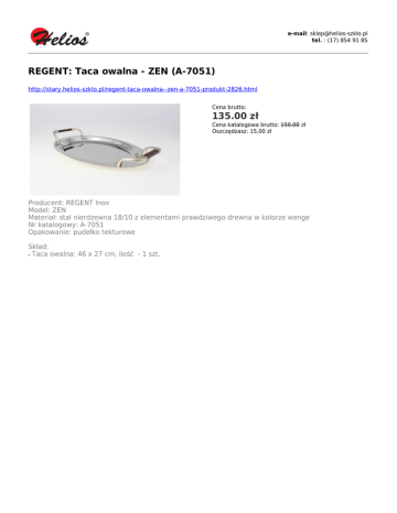 e-mail: [email protected] tel. : (17) 854 91 85 REGENT: Taca owalna - ZEN (A-7051) http://stary.helios-szklo.pl/regent-taca-owalna--zen-a-7051-produkt-2826.html Cena brutto: 135.00 zł Cena katalogowa brutto: 150.00 zł Oszczędzasz: 15,00 zł Producent: REGENT Inox Model: ZEN Materiał: stal nierdzewna 18/10 z elementami prawdziwego drewna w kolorze wenge Nr katalogowy: A-7051 Opakowanie: pudełko tekturowe Skład: Taca owalna: 46 x 27 cm, ilość - 1 szt. ●