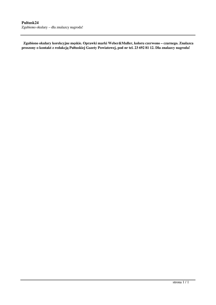 Pultusk24 Zgubiono okulary – dla znalazcy nagroda! Zgubiono okulary korekcyjne męskie. Oprawki marki Weber&Muller, koloru czerwono – czarnego. Znalazca proszony o kontakt z redakcją Pułtuskiej Gazety Powiatowej, pod nr tel. 23 692 81 12. Dla znalazcy nagroda! strona 1 / 1
