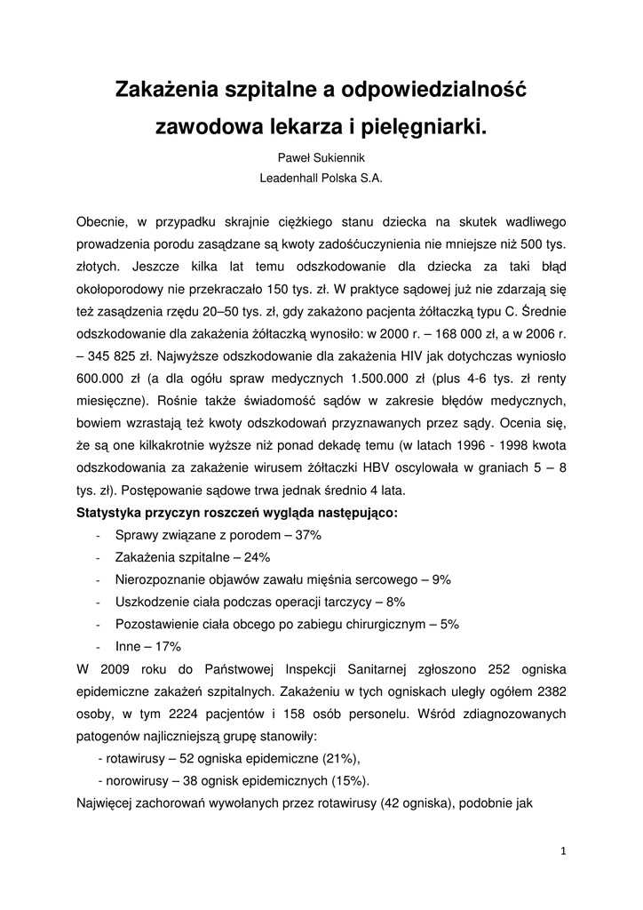 Zakażenia szpitalne a odpowiedzialność zawodowa lekarza i pielęgniarki. Paweł Sukiennik Leadenhall Polska S.A. Obecnie, w przypadku skrajnie ciężkiego stanu dziecka na skutek wadliwego prowadzenia porodu zasądzane są kwoty zadośćuczynienia nie mniejsze niż 500 tys. złotych. Jeszcze kilka lat temu odszkodowanie dla dziecka za taki błąd okołoporodowy nie przekraczało 150 tys. zł. W praktyce sądowej już nie zdarzają się też zasądzenia rzędu 20–50 tys. zł, gdy zakażono pacjenta żółtaczką typu C. Średnie odszkodowanie dla zakażenia żółtaczką wynosiło: w 2000 r. – 168 000 zł, a w 2006 r. – 345 825 zł. Najwyższe odszkodowanie dla zakażenia HIV jak dotychczas wyniosło 600.000 zł (a dla ogółu spraw medycznych 1.500.000 zł (plus 4-6 tys. zł renty miesięczne). Rośnie także świadomość sądów w zakresie błędów medycznych, bowiem wzrastają też kwoty odszkodowań przyznawanych przez sądy. Ocenia się, że są one kilkakrotnie wyższe niż ponad dekadę temu (w latach 1996 - 1998 kwota odszkodowania za zakażenie wirusem żółtaczki HBV oscylowała w graniach 5 – 8 tys. zł). Postępowanie sądowe trwa jednak średnio 4 lata. Statystyka przyczyn roszczeń wygląda następująco: - Sprawy związane z porodem – 37% - Zakażenia szpitalne – 24% - Nierozpoznanie objawów zawału mięśnia sercowego – 9% - Uszkodzenie ciała podczas operacji tarczycy – 8% - Pozostawienie ciała obcego po zabiegu chirurgicznym – 5% - Inne – 17% W 2009 roku do Państwowej Inspekcji Sanitarnej zgłoszono 252 ogniska epidemiczne zakażeń szpitalnych. Zakażeniu w tych ogniskach uległy ogółem 2382 osoby, w tym 2224 pacjentów i 158 osób personelu. Wśród zdiagnozowanych patogenów najliczniejszą grupę stanowiły: - rotawirusy – 52 ogniska epidemiczne (21%), - norowirusy – 38 ognisk epidemicznych (15%). Najwięcej zachorowań wywołanych przez rotawirusy (42 ogniska), podobnie jak 1 w latach ubiegłych, wystąpiło na oddziałach pediatrycznych, co ma ścisły związek z typową dla tych wirusów populacją wrażliwą na zakażenie. W przypadku norowirusów – ogniska epidemiczne występowały na różnych oddziałach, w szczególności internistycznych. Odpowiedzią rządu na problem jest projekt ustawy o zmianie ustawy o prawach pacjenta i Rzeczniku Praw Pacjenta (1.09.2010). Zgodnie z projektem pacjent ma mieć wybór co do możliwości skorzystania z drogi sądowej lub z pozasądowego sposobu dochodzenia roszczeń odszkodowawczych, a postępowanie ma trwać maksymalnie ok. 7 miesięcy. W postępowaniu nie ma się orzekać o winie, a opłata za wniosek o ustalenie błędu medycznego ma wynosić 200 zł. O wystąpieniu błędu medycznego decydować ma 4-osobowa komisja wojewódzka. Propozycję odszkodowania lub renty składać ma pacjentowi zakład ubezpieczeń. Maksymalna wysokość odszkodowania ma wynosić: - w przypadku śmierci pacjenta - 300 000 zł, - w przypadku, gdy skutkiem błędu nie jest śmierć pacjenta - 100 000 zł; Maksymalna wysokość renty ma wynosić 3000 zł. Przyjęcie propozycji zakładu ubezpieczeń ma być równoznaczne ze zrzeczeniem się roszczenia o odszkodowanie lub rentę albo o zadośćuczynienie pieniężne za doznaną krzywdę na podstawie art. 448 Kodeksu cywilnego. Odpowiedzialność w medycynie – zasady ogólne. Na zakres odpowiedzialności placówek i zawodów medycznych istotny wpływ wywierają: - najnowsze zmiany ustawowe (przedłużenie terminu dochodzenia roszczeń odszkodowawczych – art. 442¹ k.c.) - wprowadzenie kolejnego roszczenia: zadośćuczynienia dla najbliższych członków rodziny zmarłego – art. 444 § 4 k.c.) - najnowsze tendencje w orzecznictwie sądów polskich, świadomość potencjalnych poszkodowanych, którzy zgłaszają coraz wyższe roszczenia odszkodowawcze. Szkoda może być wyrządzona zarówno pacjentowi (bezpośrednio poszkodowany), jak i innym osobom w przypadku jego śmierci (pośrednio 2 poszkodowany). Szkoda może być ponadto wyrządzona dziecku poczętemu, lecz nienarodzonemu. Odpowiedzialność za „winę organizacyjną” może ponadto polegać na: - Złych warunkach technicznych i sanitarnych szpitala, wadliwym rozmieszczeniu chorych, dokonywaniu opatrunków niezgodnie z zasadami aseptyki (zanieczyszczenie rany pooperacyjnej, na skutek tego zaniedbania powstała zgorzel gazowa, dokonywanie opatrunków na sali operacyjnej zamiast na sali zabiegowej w sąsiedztwie chorego z powikłaniami ropnymi, wyrok SN z 14.12.1973 r., II CR 692/73) - Wadliwej organizacji przechowywania leków i środków toksycznych silnie trujących (na oddziale położniczo–ginekologicznym przechowywano w szafce aptecznej obok leków azotyn sodu, środek silnie trujący podawany jako środek dezynfekujący, śmierć pacjentek na skutek błędnego ich podania przez pielęgniarkę – wyrok SN z 27. 10. 1983 r., II KR 219/83) - Braku koordynacji oraz wymiany informacji dotyczącej pacjentów pomiędzy personelem tego samego zakładu opieki zdrowotnej na skutek czego konkretny podmiot doznał szkody. W niektórych przypadkach nie sposób wykazać, czy za powstałą szkodę odpowiada dany zakład opieki zdrowotnej, czy też zaistniały dodatkowe elementy, których wpływu na powstanie lub zwiększenie rozmiarów szkody nie można precyzyjnie określić. Tego rodzaju wątpliwości powstają przede wszystkim przy zakażeniach szpitalnych. Wówczas wystarczy wykazanie dostatecznej dozy prawdopodobieństwa związku przyczynowego między określonymi działaniami szpitala a zakażeniem. Jeżeli nie można ustalić, który z lekarzy lub z członków personelu medycznego dopuścił się winy, a dowiedzione zostanie, że popełniono zaniedbanie na skutek czego pacjent doznał szkody, wówczas mamy do czynienia z tzw. winą anonimową lub inaczej winą bezimienną niezidentyfikowanego członka zespołu, za którą odpowiada zakład leczniczy. Praktyka ubezpieczeniowa Na rynku ubezpieczeń O