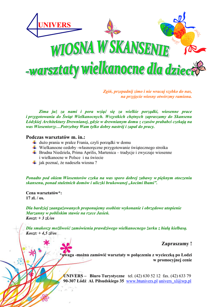 UNIVERS Zgiń, przepadnij zimo i nie wracaj szybko do nas, na przyjęcie wiosny otwórzmy ramiona. Zima już za nami i pora wziąć się za wielkie porządki, wiosenne prace i przygotowania do Świąt Wielkanocnych. Wszystkich chętnych zapraszamy do Skansenu Łódzkiej Architektury Drewnianej, gdzie w drewnianym domu z czasów prababci czekają na was Wiosentorzy…Potrzebny Wam tylko dobry nastrój i zapał do pracy. Podczas warsztatów m. in.: dużo prania w pralce Frania, czyli porządki w domu Wielkanocne ozdoby -własnoręczne przygotowanie świątecznego stroika Brudna Niedziela, Prima Aprilis, Martenica – tradycje i zwyczaje wiosenne i wielkanocne w Polsce i na świecie jak poznać, że nadeszła wiosna ? Ponadto pod okiem Wiosentorów czeka na was sporo dobrej zabawy w pięknym otoczeniu skansenu, ponad stuletnich domów i uliczki brukowanej „kocimi łbami”. Cena warsztatów*: 17 zł. / os. Dla bardziej zaangażowanych proponujemy osobiste wykonanie i obrzędowe utopienie Marzanny w pobliskim stawie na rzece Jasień. Koszt: + 3 zł./os Dla smakoszy możliwość zamówienia prawdziwego wielkanocnego żurku z białą kiełbasą. Koszt: + 4,5 zł/os Zapraszamy ! *uwaga -można zamówić warsztaty w połączeniu z wycieczką po Łodzi w promocyjnej cenie UNIVERS – Biuro Turystyczne tel. (42) 630 52 12 fax. (42) 633 79 90-307 Łódź Al. Piłsudskiego 35 www.btunivers.pl [email protected]