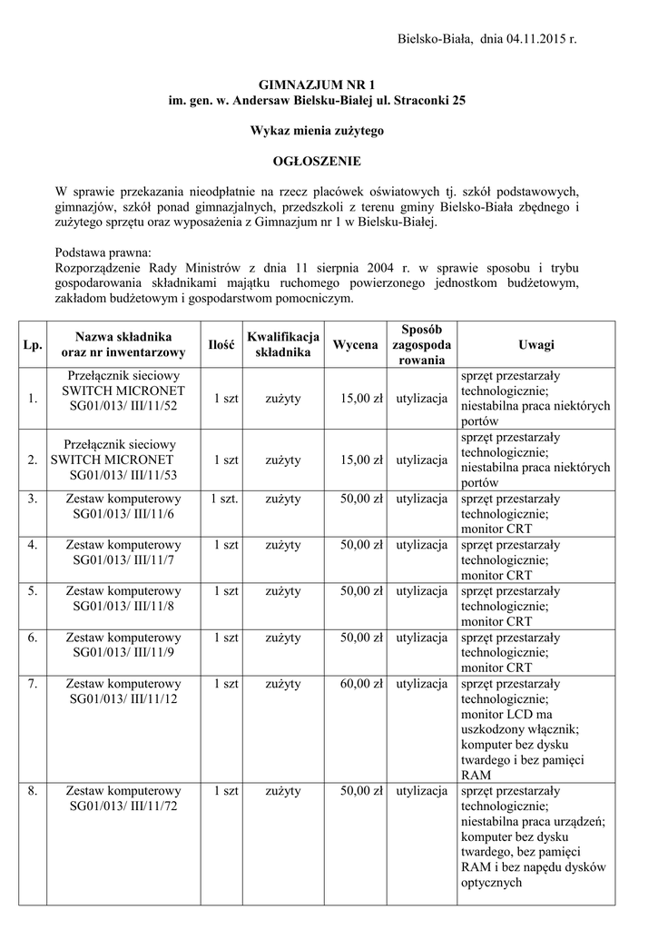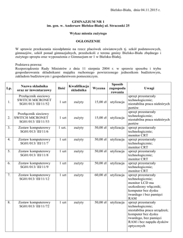 Bielsko-Biała, dnia 04.11.2015 r. GIMNAZJUM NR 1 im. gen. w. Andersaw Bielsku-Białej ul. Straconki 25 Wykaz mienia zużytego OGŁOSZENIE W sprawie przekazania nieodpłatnie na rzecz placówek oświatowych tj. szkół podstawowych, gimnazjów, szkół ponad gimnazjalnych, przedszkoli z terenu gminy Bielsko-Biała zbędnego i zużytego sprzętu oraz wyposażenia z Gimnazjum nr 1 w Bielsku-Białej. Podstawa prawna: Rozporządzenie Rady Ministrów z dnia 11 sierpnia 2004 r. w sprawie sposobu i trybu gospodarowania składnikami majątku ruchomego powierzonego jednostkom budżetowym, zakładom budżetowym i gospodarstwom pomocniczym. Lp. Nazwa składnika oraz nr inwentarzowy Przełącznik sieciowy SWITCH MICRONET SG01/013/ III/11/52 Kwalifikacja Ilość Wycena składnika Sposób zagospoda rowania 1 szt zużyty 15,00 zł utylizacja Przełącznik sieciowy 2. SWITCH MICRONET SG01/013/ III/11/53 1 szt zużyty 15,00 zł utylizacja 3. Zestaw komputerowy SG01/013/ III/11/6 1 szt. zużyty 50,00 zł utylizacja 4. Zestaw komputerowy SG01/013/ III/11/7 1 szt zużyty 50,00 zł utylizacja 5. Zestaw komputerowy SG01/013/ III/11/8 1 szt zużyty 50,00 zł utylizacja 6. Zestaw komputerowy SG01/013/ III/11/9 1 szt zużyty 50,00 zł utylizacja 7. Zestaw komputerowy SG01/013/ III/11/12 1 szt zużyty 60,00 zł utylizacja 8. Zestaw komputerowy SG01/013/ III/11/72 1 szt zużyty 50,00 zł utylizacja 1. Uwagi sprzęt przestarzały technologicznie; niestabilna praca niektórych portów sprzęt przestarzały technologicznie; niestabilna praca niektórych portów sprzęt przestarzały technologicznie; monitor CRT sprzęt przestarzały technologicznie; monitor CRT sprzęt przestarzały technologicznie; monitor CRT sprzęt przestarzały technologicznie; monitor CRT sprzęt przestarzały technologicznie; monitor LCD ma uszkodzony włącznik; komputer bez dysku twardego i bez pamięci RAM sprzęt przestarzały technologicznie; niestabilna praca urządzeń; komputer bez dysku twardego, bez pamięci RAM i bez napędu dysków optycznych 9. Zestaw komputerowy SG01/013/ III/11/73 1 szt zużyty 50,00 zł utylizacja 10. Zestaw komputerowy SG01/013/ III/11/78 1 szt zużyty 50,00 zł 11. Zestaw komputerowy SG01/013/ III/11/79 1 szt zużyty 50,00 zł 12. Zestaw komputerowy SG01/013/ III/11/80 1 szt zużyty 50,00 zł 13. Zestaw komputerowy SG01/013/ III/11/83 1 szt zużyty 50,00 zł 14. Zestaw komputerowy SG01/013/ III/11/84 1 szt zużyty 50,00 zł 15. Komputer LC 210 z zestawu SG01/013/ III/11/4 1 szt zużyty 30,00 zł 16. Komputer HP COMPAQ Z zestawu SG01/013/ III/11/30 Komputer HP COMPAQ D 530 z zestawu SG01/013/ III/11/32 Komputer HP COMPAQ D 530 z zestawu SG01/013/ III/11/33 1 szt zużyty 35,00 zł 1 szt zużyty 35,00 zł utylizacja sprzęt przestarzały technologicznie 1 szt zużyty 35,00 zł utylizacja sprzęt przestarzały technologicznie 17. 18. sprzęt przestarzały technologicznie; niestabilna praca urządzeń; komputer bez dysku twardego, bez pamięci RAM i bez napędu dysków optycznych utylizacja sprzęt przestarzały technologicznie; niestabilna praca urządzeń; komputer bez dysku twardego, bez pamięci RAM i bez napędu dysków optycznych utylizacja sprzęt przestarzały technologicznie; niestabilna praca urządzeń; komputer bez dysku twardego, bez pamięci RAM i bez napędu dysków optycznych utylizacja sprzęt przestarzały technologicznie; niestabilna praca urządzeń; komputer bez dysku twardego, bez pamięci RAM i bez napędu dysków optycznych utylizacja sprzęt przestarzały technologicznie; niestabilna praca urządzeń; komputer bez dysku twardego, bez pamięci RAM i bez napędu dysków optycznych utylizacja sprzęt przestarzały technologicznie; niestabilna praca urządzeń; komputer bez dysku twardego, bez pamięci RAM i bez napędu dysków optycznych utylizacja sprzęt przestarzały technologicznie; komputer bez dysku twardego i bez pamięci RAM utylizacja sprzęt przestarzały technologicznie 1 szt zużyty 35,00 zł utylizacja sprzęt przestarzały technologicznie 20. Komputer HP COMPAQ D 530 z zestawu SG01/013/ III/11/38 1 szt zużyty 35,00 zł utylizacja sprzęt przestarzały technologicznie 21. Komputer HP COMPAQ D 530 z zestawu SG01/013/ III/11/39 1 szt zużyty 35,00 zł utylizacja sprzęt przestarzały technologicznie 22. Komputer HP COMPAQ D 530 z zestawu SG01/013/ III/11/40 1 szt zużyty 35,00 zł utylizacja sprzęt przestarzały technologicznie 23. Komputer HP COMPAQ D 530 z zestawu SG01/013/ III/11/42 1 szt zużyty 35,00 zł utylizacja sprzęt przestarzały technologicznie 24. Komputer HP COMPAQ D 530 z zestawu SG01/013/ III/11/43 1 szt zużyty 35,00 zł utylizacja sprzęt przestarzały technologicznie 25. Komputer HP COMPAQ D 530 z zestawu SG01/013/ III/11/44 1 szt zużyty 35,00 zł utylizacja sprzęt przestarzały technologicznie 26. Komputer HP COMPAQ D 530 z zestawu SG01/013/ III/11/50 1 szt zużyty 35,00 zł utylizacja sprzęt przestarzały technologicznie 27. Komputer HP COMPAQ z zestawu SG01/013/ III/11/45 Konto 091-03 28. Komputer HP COMPAQ z zestawu SG01/013/ III/11/31 Konto 091-03 29. Komputer HP COMPAQ z zestawu SG01/013/ III/11/41 Konto 091-03 1 szt zużyty 35,00 zł utylizacja sprzęt przestarzały technologicznie 1 szt zużyty 35,00 zł utylizacja sprzęt przestarzały technologicznie 1 szt zużyty 35,00 zł utylizacja sprzęt przestarzały technologicznie 30. Drukarka kolorowa HP 3820 SG01/013/ III/11/11 31. Komputer HP z zestawu SG01/013/ III/11/60 1 szt uszkodzona 5,00 zł utylizacja 1 szt. zużyty 30,00 zł utylizacja 19. Komputer HP COMPAQ D 530 z zestawu SG01/013/ III/11/37 naprawa nieopłacalna sprzęt przestarzały technologicznie; komputer bez pamięci RAM i bez napędu dysków optycznych W przypadku braku zainteresowania placówek oświatowych z terenu miasta Bielsko-Biała w/w sprzęt może być przedmiotem odsprzedaży dla innych zainteresowanych wg ceny nie niższej niż cena rynkowa.