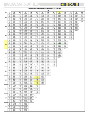Tabela przeliczeniowa dla grzejników (EN442) Tp Tz 90 85 80 75 70 65 60 55 50 45 40 Tp 24 22 20 18 15 12 24 22 20 18 15 12 24 22 20 18 15 12 24 22 20 18 15 12 24 22 20 18 15 12 24 22 20 18 15 12 24 22 20 18 15 12 24 22 20 18 15 12 24 22 20 18 15 12 24 22 20 18 15 12 24 22 20 18 15 12 25 4.56 3.11 2.50 2.13 1.76 1.51 1.93 3.34 2.67 2.27 1.87 1.69 5.38 3.61 2.87 2.42 1.99 1.69 5.90 3.92 3.10 2.61 2.12 1.80 6.54 4.30 3.38 2.82 2.28 1.93 7.32 4.75 3.70 3.07 2.47 2.07 8.32 5.32 4.10 3.38 2.69 2.24 9.62 6.03 4.60 3.75 2.96 2.44 11.38 6.97 5.23 4.22 3.29 2.69 13.93 8.26 6.08 4.84 3.70 2.99 17.93 10.16 7.28 5.68 4.25 3.37 30 2.43 2.11 1.87 1.68 1.46 1.29 2.63 2.26 1.99 1.78 1.54 1.36 2.83 2.42 2.12 1.90 1.64 1.44 3.07 2.61 2.28 2.03 1.75 1.53 3.36 2.84 2.47 2.19 1.87 1.63 3.70 3.11 2.69 2.37 2.01 1.75 4.13 3.44 2.96 2.59 2.19 1.89 4.67 3.87 3.29 2.86 2.39 2.05 5.39 4.39 3.70 3.19 2.64 2.24 6.38 5.11 4.25 3.63 2.96 2.48 7.87 6.14 5.01 4.21 3.37 2.79 35 1.88 1.69 1.54 1.42 1.26 1.14 2.00 1.80 1.64 1.50 1.33 1.20 2.15 1.93 1.75 1.60 1.41 1.27 2.32 2.07 1.87 1.70 1.50 1.34 2.52 2.24 2.01 1.83 1.61 1.43 2.76 2.44 2.19 1.98 1.73 1.53 3.06 2.69 2.39 2.15 1.87 1.64 3.43 2.99 2.64 2.36 2.03 1.78 3.92 3.37 2.96 2.63 2.24 1.94 4.58 3.89 3.37 2.96 2.50 2.15 5.54 4.62 3.93 3.41 2.83 2.40 40 1.57 1.44 1.33 1.24 1.13 1.03 1.67 1.53 1.41 1.31 1.19 1.08 1.78 1.63 1.50 1.39 1.25 1.14 1.92 1.75 1.61 1.48 1.33 1.21 2.08 1.89 1.73 1.59 1.42 1.28 2.27 2.05 1.87 1.17 1.52 1.37 2.50 2.24 2.03 1.86 1.64 1.47 2.78 2.48 2.24 2.03 1.78 1.59 3.15 2.79 2.50 2.25 1.96 1.73 3.65 3.19 2.82 2.53 2.17 1.90 45 1.36 1.27 1.19 1.11 1.02 0.94 1.45 1.34 1.25 1.18 1.07 0.99 1.54 1.43 1.33 1.24 1.13 1.04 1.66 1.53 1.42 1.32 1.20 1.10 1.79 1.64 1.52 1.42 1.28 1.16 1.94 1.78 1.64 1.52 1.37 1.24 2.13 1.94 1.78 1.65 1.47 1.33 2.37 2.15 1.96 1.80 1.60 1.43 2.67 2.40 2.17 1.98 1.75 1.56 50 1.21 1.14 1.07 1.01 0.93 0.87 1.29 1.21 1.13 1.07 0.98 0.91 1.37 1.28 1.20 1.13 1.04 0.96 1.47 1.37 1.26 1.20 1.10 1.01 1.58 1.47 1.37 1.28 1.17 1.07 1.71 1.58 1.47 1.37 1.25 1.14 1.87 1.73 1.60 1.48 1.34 1.22 2.07 1.90 1.75 1.62 1.45 1.31 55 1.10 1.04 0.98 0.93 0.87 0.81 1.16 1.10 1.04 0.98 0.91 0.85 1.24 1.16 1.10 1.04 0.96 0.89 1.32 1.24 1.17 1.10 1.01 0.94 1.42 1.33 1.25 1.17 1.08 0.99 1.54 1.43 1.34 1.26 1.15 1.05 1.68 1.56 1.45 1.35 1.23 1.13 60 1.01 0.96 0.91 0.87 0.81 0.76 1.07 1.01 0.96 0.91 0.85 0.79 1.13 1.07 1.01 0.96 0.89 0.83 1.21 1.14 1.08 1.02 0.94 0.88 1.30 1.22 1.15 1.08 1.00 0.93 1.40 1.31 1.23 1.16 1.07 0.98 65 0.93 0.89 0.85 0.81 0.76 0.71 0.91 0.94 0.89 0.85 0.80 0.75 1.05 0.99 0.94 0.90 0.84 0.78 1.12 1.05 1.00 0.95 0.88 0.82 1.19 1.13 1.07 1.01 0.94 0.87 70 0.87 0.83 0.80 0.76 0.72 0.67 0.92 0.88 0.84 0.80 0.75 0.70 0.97 0.93 0.88 0.84 0.79 0.74 1.04 0.98 0.94 0.89 0.83 0.78 75 0.82 0.78 0.75 0.72 0.68 0.64 0.86 0.82 0.79 0.75 0.71 0.67 0.91 0.87 0.83 0.79 0.75 0.70 80 0.77 0.74 0.71 0.68 0.64 0.61 0.81 0.78 0.75 0.72 0.67 0.64 85 0.73 0.70 0.67 0.65 0.61 0.58