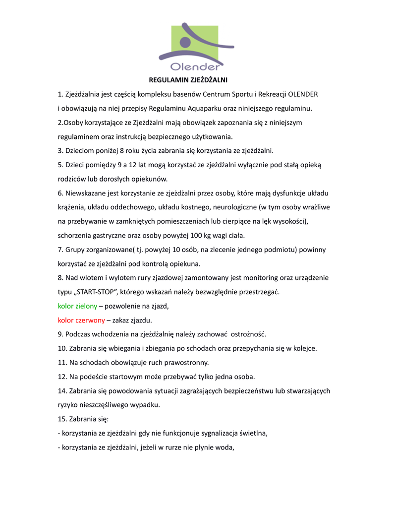REGULAMIN ZJEŻDŻALNI 1. Zjeżdżalnia jest częścią kompleksu basenów Centrum Sportu i Rekreacji OLENDER i obowiązują na niej przepisy Regulaminu Aquaparku oraz niniejszego regulaminu. 2.Osoby korzystające ze Zjeżdżalni mają obowiązek zapoznania się z niniejszym regulaminem oraz instrukcją bezpiecznego użytkowania. 3. Dzieciom poniżej 8 roku życia zabrania się korzystania ze zjeżdżalni. 5. Dzieci pomiędzy 9 a 12 lat mogą korzystać ze zjeżdżalni wyłącznie pod stałą opieką rodziców lub dorosłych opiekunów. 6. Niewskazane jest korzystanie ze zjeżdżalni przez osoby, które mają dysfunkcje układu krążenia, układu oddechowego, układu kostnego, neurologiczne (w tym osoby wrażliwe na przebywanie w zamkniętych pomieszczeniach lub cierpiące na lęk wysokości), schorzenia gastryczne oraz osoby powyżej 100 kg wagi ciała. 7. Grupy zorganizowane( tj. powyżej 10 osób, na zlecenie jednego podmiotu) powinny korzystać ze zjeżdżalni pod kontrolą opiekuna. 8. Nad wlotem i wylotem rury zjazdowej zamontowany jest monitoring oraz urządzenie typu „START-STOP”, którego wskazań należy bezwzględnie przestrzegać. kolor zielony – pozwolenie na zjazd, kolor czerwony – zakaz zjazdu. 9. Podczas wchodzenia na zjeżdżalnię należy zachować ostrożność. 10. Zabrania się wbiegania i zbiegania po schodach oraz przepychania się w kolejce. 11. Na schodach obowiązuje ruch prawostronny. 12. Na podeście startowym może przebywać tylko jedna osoba. 14. Zabrania się powodowania sytuacji zagrażających bezpieczeństwu lub stwarzających ryzyko nieszczęśliwego wypadku. 15. Zabrania się: - korzystania ze zjeżdżalni gdy nie funkcjonuje sygnalizacja świetlna, - korzystania ze zjeżdżalni, jeżeli w rurze nie płynie woda, - korzystania ze zjeżdżalni jeśli jest ona zamknięta lub oznaczona w widoczny sposób, - nie przestrzegania zasad bezpieczeństwa w zakresie zjazdów, - zmuszania innych osób do zjazdu, - nie przestrzegania zasad regulaminu dotyczącego zjazdu. 16. Należy przestrzegać następujących zasad wykonywania zjazdu: a) nie wolno wykonywać zjazdu parami, w grupie lub z małymi dziećmi, b) zjazd powinien być wykonywany w pozycji: na plecach, z nogami skierowanymi w kierunku zjazdu, c) nie wolno zjeżdżać z przedmiotami, mogącymi spowodować uszkodzenia ciała, a w szczególności z okularami, biżuterią i sprzętem pływackim, d) nie wolno zatrzymywać się podczas zjazdu, e) nie wolno wchodzić na zjeżdżalnię od strony basenu hamownego, d) po wykonaniu zjazdu należy niezwłocznie opuścić basen hamowny. 17. Kontrolę nad przestrzeganiem niniejszego regulaminu pełnią ratownicy, a wszystkie osoby korzystające ze zjeżdżalni są zobowiązane stosować się do ich poleceń związanych z zachowaniem bezpieczeństwa. 18. Zauważone usterki należy bezzwłocznie zgłosić ratownikom. Dane techniczne: Długość całkowita zjeżdżalni: 88,4 m Długość zjeżdżalni: 80,8 m Różnica poziomów: 8,68 m Nachylenie: 10,5 % Zjeżdżalnia wyposażona jest w urządzenia - do pomiaru czasu zjazdu, dające możliwość organizowania zawodów, duży wyświetlacz zamontowany w okolicach basenu lądującego a także w efekty dźwiękowe i świetlne wewnątrz rynny.