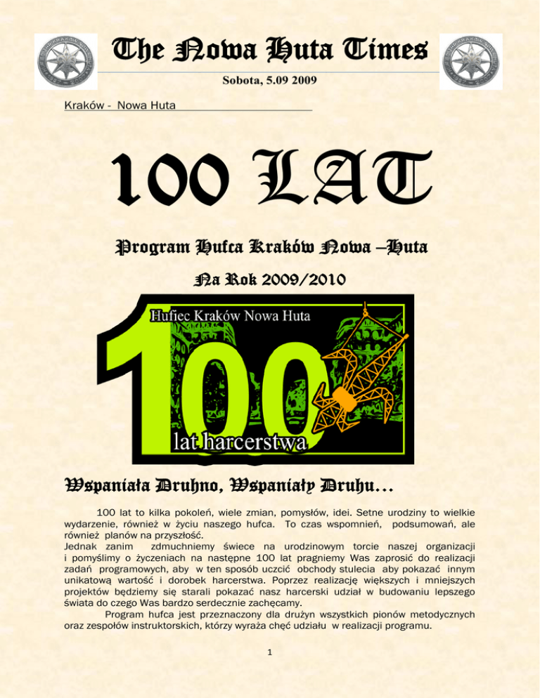 The Nowa Huta Times Sobota, 5.09 2009 Kraków - Nowa Huta 100 LAT Program Hufca Kraków Nowa –Huta Na Rok 2009/2010 Wspaniała Druhno, Wspaniały Druhu… 100 lat to kilka pokoleń, wiele zmian, pomysłów, idei. Setne urodziny to wielkie wydarzenie, również w życiu naszego hufca. To czas wspomnień, podsumowań, ale również planów na przyszłość. Jednak zanim zdmuchniemy świece na urodzinowym torcie naszej organizacji i pomyślimy o życzeniach na następne 100 lat pragniemy Was zaprosić do realizacji zadań programowych, aby w ten sposób uczcić obchody stulecia aby pokazać innym unikatową wartość i dorobek harcerstwa. Poprzez realizację większych i mniejszych projektów będziemy się starali pokazać nasz harcerski udział w budowaniu lepszego świata do czego Was bardzo serdecznie zachęcamy. Program hufca jest przeznaczony dla drużyn wszystkich pionów metodycznych oraz zespołów instruktorskich, którzy wyraża chęć udziału w realizacji programu. 1 The Nowa Huta Times Sobota, 5.09 2009 Cele programu: • Integracja środowisk harcerskich hufca. • Dostarczenie drużynom propozycji programowych. • Przybliżenie historii harcerstwa. • Przygotowanie do obchodów 100 lecia harcerstwa O co w tym wszystkim chodzi? Startujemy w Krakowie 27.09.2009 Do powyższego terminu chętne drużyny, zespoły, przesyłają meldunek na adres [email protected] o przystąpieniu do akcji. Meldunek będzie można pobrać ze strony www.100latharcerstwa.eu. Po otrzymaniu meldunku kadra programu prześle na adres drużynowego przesyłkę z treścią pierwszego zadania oraz książeczki uczestnika programu dla każdego harcerza w drużynie oraz jedna książeczkę dla całej drużyny. Kolejne zadania drużyny będą otrzymywać po przesłaniu sprawozdań każdego etapu (wzór sprawozdania będzie dołączony do pierwszej wiadomości) Uwieńczeniem etapu będzie otrzymanie przez drużynę znaczków (po jednym dla każdej osoby realizującej program oraz jednego dla całej drużyny), które każdy zuch, harcerz, harcerz starszy, wędrownik, instruktor będzie mógł wklejać do książeczki jako potwierdzenie wykonania zadań indywidualnych (np. zdobycie sprawności) a drużynowy przykleić do książeczki drużyny jako potwierdzenie wykonania zadania przez drużynę. 2 The Nowa Huta Times Sobota, 5.09 2009 Dh. …………………………………………………….. …………………………………………………….. Zastęp/ Szóstka: …………………………………………………….. Drużyna/ Gromada: …………………………………………………….. Program składa się z 6 etapów związanych z historią harcerstwa. Etapy przedstawiają się następująco: I ETAP – NARODZINY To czas narodzin polskiego skautingu a przede wszystkim czas pracy nad sobą nad wyrobieniem silnych charakterów oraz chęć pokonania własnych słabości i wytrwałość w osiągnięciu mistrzostwa w wybranych dziedzinach. Termin realizacji: 31.10 ( DZIEŃ NARODZIN A. MAŁKOWSKIEGO) ZADANIA: Dla Drużyny – Zorganizować grę, zbiórkę dotycząca historii ruchu zuchowego, harcerstwa. Indywidualne – Zdobyć sprawność związaną z pracą nad sobą. 3 The Nowa Huta Times Sobota, 5.09 2009 II ETAP – I WOJNA ŚWIATOWA I OKRES MIĘDZYWOJENNY To czas walki za Ojczyznę, czas bohaterskich ofiar ale także czas wielu rozstań z bliskimi. W tym okresie ginie Twórca Skautingu A. Małkowski oraz przychodzi na świat bohater naszego hufca Mariusz Zaruski. Dlatego poświęcamy czas rodzinie, swoim najbliższym, dbamy o domowe ognisko oraz poznajemy naszego bohatera. Termin realizacji: 31.12 ZADANIA: Dla Drużyny –zdobyć jedną sprawność związaną Mariuszem Zaruskim. Indywidualne Zuchy - Zrobić zdjęcie rodziny, Harcerze – Pomóc w przygotowaniu imprezy rodzinnej + zdjęcie z tej imprezy Starsi/Wędrownicy - Zdjęcie rodziny + stworzyć drzewo genealogiczne. z III – II WOJNA ŚWIATOWA To czas II części realizacji programu Szarych Szeregów: „Dziś" - sabotaż, nauka i przygotowanie do walki. "Jutro" – walka i powstanie. Realizowane w trzech grupach metodycznych: - Zawiszacy - Szkoły Bojowe - Grupy Szturmowa Termin realizacji: 22.II ZADANIA Dla Drużyny – Zorganizowanie zbiórki, gry dotyczących działalności poszczególnych grup Szarych Szeregów. Zuchy - Zawiszacy Harcerze - Szkoły Bojowe Harcerze Starsi/Wędrownicy - Grupy Szturmowe Indywidualne – Odwiedzić jedno miejsce związane z II wojna światową i udokumentować to. IV – PRL To czas, kiedy pojawia się pierwszy rozkaz w Hufcu Kraków - Nowa Huta, z dnia 22 lutego 1957 roku, zawierał apel do starej kadry instruktorskiej o powrót do pracy z młodzieżą. Nowohuccy instruktorzy złączeni wspólną troską o dobro młodego pokolenia, rozpoczęli na nowo pracę nad ich wychowaniem, wprowadzając w czyn hasła Braterstwa, Służby i radości życia. Termin realizacji: 31.III ZADANIA: Dla Drużyny – Przeprowadzić wywiady z instruktorami Hufca Nowa – Huta Zuchy – z pierwszym drużynowym Harcerze – z pierwszym szczepowym. Harcerze Starsi/Wędrownicy - z którymś z komendantów hufca lub z instruktorem z komendy hufca. Powyższe działania można połączyć ze zbiórką związaną z historią drużyny, szczepu. (Opracowanie autoryzowanych wywiadów ) Indywidualne – Zdobyć sprawność, plakietkę szczepu, drużyny, poznać historie swojej drużyny, szczepu 4 The Nowa Huta Times Sobota, 5.09 2009 V – WSPÓŁCZESNOŚĆ To czas zbiórek, biwaków, zabawy, nauki ale także działań na rzecz innych. To nasz czas!!! Termin realizacji: 9. V ZADANIA: Dla Drużyny –Przeprowadzić Akcje na rzecz innych! Nagrać film o tym jak zuchy, harcerze, harcerze starsi, wędrownicy pomagają innym. Zrobić Tablo Drużyny (Przygotowane Tabla będą wykorzystane podczas zlotu harcerstwa na Błoniach) Indywidualne – Zuchy, Harcerze Przykładem B – P zawiązać węzełek na chuście i codz