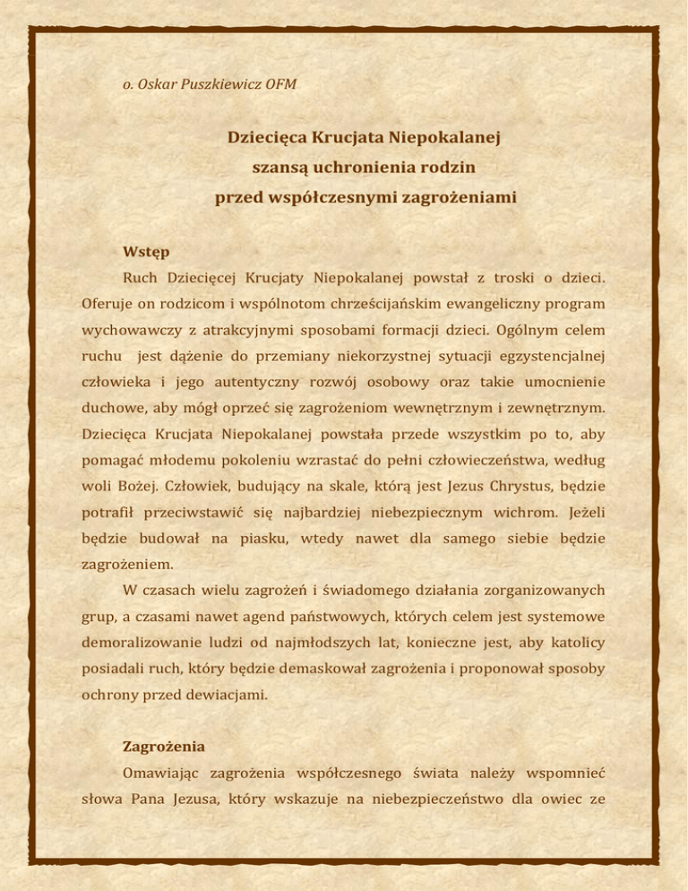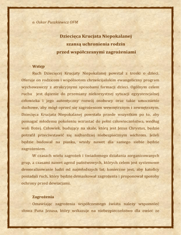 o. Oskar Puszkiewicz OFM Dziecięca Krucjata Niepokalanej szansą uchronienia rodzin przed współczesnymi zagrożeniami Wstęp Ruch Dziecięcej Krucjaty Niepokalanej powstał z troski o dzieci. Oferuje on rodzicom i wspólnotom chrześcijańskim ewangeliczny program wychowawczy z atrakcyjnymi sposobami formacji dzieci. Ogólnym celem ruchu jest dążenie do przemiany niekorzystnej sytuacji egzystencjalnej człowieka i jego autentyczny rozwój osobowy oraz takie umocnienie duchowe, aby mógł oprzeć się zagrożeniom wewnętrznym i zewnętrznym. Dziecięca Krucjata Niepokalanej powstała przede wszystkim po to, aby pomagać młodemu pokoleniu wzrastać do pełni człowieczeństwa, według woli Bożej. Człowiek, budujący na skale, którą jest Jezus Chrystus, będzie potrafił przeciwstawić się najbardziej niebezpiecznym wichrom. Jeżeli będzie budował na piasku, wtedy nawet dla samego siebie będzie zagrożeniem. W czasach wielu zagrożeń i świadomego działania zorganizowanych grup, a czasami nawet agend państwowych, których celem jest systemowe demoralizowanie ludzi od najmłodszych lat, konieczne jest, aby katolicy posiadali ruch, który będzie demaskował zagrożenia i proponował sposoby ochrony przed dewiacjami. Zagrożenia Omawiając zagrożenia współczesnego świata należy wspomnieć słowa Pana Jezusa, który wskazuje na niebezpieczeństwo dla owiec ze strony drapieżnych wilków (J 10, 12). Chrześcijanie muszą być świadomi, że toczy się nieustanna wojna o wyrugowanie przestrzegania prawa Bożego z życia społecznego. Działania wrogów Kościoła są przemyślane i od kilku wieków prowadzone pod hasłami: równości, braterstwa i wolności. Papież Leon XIII w encyklice Humanum genus (Rzym 1884) przedstawił plan masonerii w walce z Kościołem. Można go zawrzeć w kilku punktach: 1) walka z Kościołem hierarchicznym; 2) walka z Ciałem Mistycznym Chrystusa; 3) walka z kultem publicznym; 4) walka z rodziną i małżeństwem; 5) demoralizacja dzieci i młodzieży. Leon XIII we wspomnianej encyklice napisał, że masoneria systemowo dąży do tego, aby "najszersze warstwy przepoić rozwiązłością bez żadnych hamulców, gdyż wtedy będą je mieli całkowicie w swych rękach, jako narzędzie do wykonania swych najzuchwalszych zamysłów". Papież przestrzega, że dążeniem tej sekty jest przywrócenie obyczajów i instytucji pogańskich. W encyklice jest zawarte twierdzenie, że masoneria silnie popiera organizacje komunistyczne i socjalistyczne. Badania naukowe, przeprowadzone przez Ośrodek Badań Historii Masonerii w Rzymie, bazujące na dokumentach z tego okresu, pomagają nam zrozumieć antyklerykalizm masonerii łacińskiej: "W szczególności antyklerykalizm i racjonalizm są wspólne dla masonerii i socjalizmu"1. Papież Leon XIII stwierdził, że w zamiarach osób należących do masonerii, widoczna jest ta sama nieubłagana nienawiść i żądza odwetu, jaką Szatan pała przeciw Jezusowi Chrystusowi. Środowiska masonów 1 2001. ZBIGNIEW SUCHECKI OFMConv., KOŚCIÓŁ A MASONERIA, Wydawnictwo "M", Kraków stwarzają dobrą atmosferę i są pożywką dla różnych wypaczeń przeciw życiu i moralności oraz niebezpiecznych dla ludzkości ideologii, jak: liberalizm, komunizm, faszyzm oraz ideologia "gender". Państwo, które pełni rolę służebną wobec narodu, powinno stać na straży rodziny i wyeliminować ideologie, które w praktyce występują przeciw ludzkości. Podobnie i środki społecznego przekazu, które propagują zgubne ideologie, nie powinny mieć prawa nadawania na antenie z powodu nawoływania do zbrodni przeciw ludzkości. Wszystkie zbrodnicze ideologie zawłaszczają prawa rodziców do wychowywania dzieci. Mason Georges Danton pod koniec XVIII wieku powiedział: „Dzieci należą najpierw do Republiki, a dopiero potem do rodziców”. W Polsce nietrudno zauważyć, że w pracach rządu, sejmu, administracji publicznej, na uczelniach i szkołach oraz mediach, forsuje się zgubne ideologie. Sytuacja dzieci i młodzieży Lansowane ideologie wywierają największy wpływ na postawy ludzi, na prawodawstwo i prowadzą do różnorodnych patologii. Zgubne ideologie znajdują podatny grunt wśród dzieci i młodzieży. W naszych czasach obserwujemy ogromny wzrost liczby dzieci i młodzieży uzależnionych od alkoholu, narkotyków, gier, Internetu, pornografii. Przyczyn jest wiele. Gdyby rodziny były zdrowe moralnie, właściwie wspierane przez państwo, nie byłoby tak wielkiej liczby młodzieży dysfunkcyjnej. Główną przyczyną zniewoleń są problemy emocjonalne, wywołane między innymi: przez niemoralny styl życia forsowany przez media, kryzys rodziny i w ogóle kryzys życia społecznego. Powodem szukania środków narkotycznych, w tym alkoholu i różnych uzależniających form spędzania czasu, jest przede wszystkim dążenie do poprawienia nastroju, wprowadzenie się w stan zapomnienia, odprężenia i ucieczka od rzeczywistości. W niewielkim stopniu przyczyną uzależnień dzieci i młodzieży jest zła wola, niewiedza, obciążenia genetyczne. Z badań wynika, że na uzależnienia podatne są głównie osoby w młodym wieku, którym brakuje wyrobionej hierarchii wartości, które w domu rodzinnym nie zostały wdrożone do trudu tworzenia pozytywnych więzi, do stawiania sobie wymagań i odpowiedzialności za swoje życie i życie innych osób. Kryzys rodziny, niedojrzałość rodziców, dramaty rodzinne i kryzys życia społecznego, spowodowany nieodpowiedzialnym działaniem ludzi decydujących o polityce społecznej i gospodarczej, przyczynia się do bolesnych przeżyć, stanów napięcia emocjonalnego wśród dzieci i młodzieży. W przeważającej mierze przyczyną współczesnych zagrożeń jest źle pojmowana demokracja i wolny rynek, gdzie rządzi dyktatura pieniądza kosztem człowieka, jego warunków życia i prawa do założenia ustabilizowanej rodziny. "Nowa lewica" ze swoją ideologią walki klas i walki