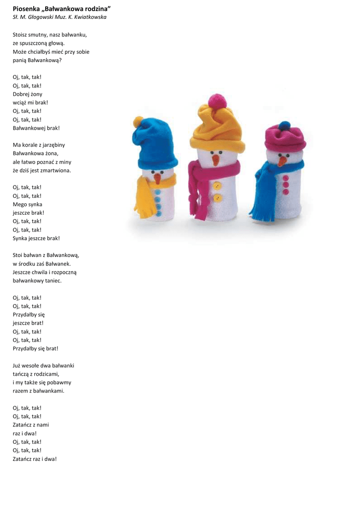 Piosenka „Bałwankowa rodzina” Sł. M. Głogowski Muz. K. Kwiatkowska Stoisz smutny, nasz bałwanku, ze spuszczoną głową. Może chciałbyś mieć przy sobie panią Bałwankową? Oj, tak, tak! Oj, tak, tak! Dobrej żony wciąż mi brak! Oj, tak, tak! Oj, tak, tak! Bałwankowej brak! Ma korale z jarzębiny Bałwankowa żona, ale łatwo poznać z miny że dziś jest zmartwiona. Oj, tak, tak! Oj, tak, tak! Mego synka jeszcze brak! Oj, tak, tak! Oj, tak, tak! Synka jeszcze brak! Stoi bałwan z Bałwankową, w środku zaś Bałwanek. Jeszcze chwila i rozpoczną bałwankowy taniec. Oj, tak, tak! Oj, tak, tak! Przydałby się jeszcze brat! Oj, tak, tak! Oj, tak, tak! Przydałby się brat! Już wesołe dwa bałwanki tańczą z rodzicami, i my także się pobawmy razem z bałwankami. Oj, tak, tak! Oj, tak, tak! Zatańcz z nami raz i dwa! Oj, tak, tak! Oj, tak, tak! Zatańcz raz i dwa! Wiersz „Bałwan” H. Ożogowskiej Na podwórzu już od rana dziwny gość zawitał. Stoi cicho, nic nie mówi, o nic się nie pyta. Twarz okrągła, nos kartofel, oczy – dwa węgielki. Szyi nie ma, nóg nie widać. A jak beczka wielki. Koszyk stary jak kapelusz, ma na czubku głowy. Kto to taki? Czy już wiecie? To bałwan śniegowy. Piosenka „Zając szaraczek” Zajączku chodź na łączkę, Szaraczku chodź na łączkę. Oj, ty - taki, taki ty, chodź na łączkę raz, dwa, trzy. Zajączku zrywaj kwiatki, Szaraczku zrywaj kwiatki. Oj, ty - taki, taki ty, zrywaj kwiatki raz, dwa, trzy. Zajączku uwij wianek, Szaraczku uwij wianek. Oj, ty - taki, taki ty, uwij wianek raz, dwa, trzy. Zajączku zatańcz ze mną, Szaraczku zatańcz ze mną. Oj, ty - taki, taki ty, zatańcz ze mną raz, dwa, trzy. Zajączku skłoń się pięknie, Szaraczku skłoń się pięknie. Oj, ty - taki, taki ty, skłoń się pięknie raz, dwa, trzy. „Sen zajączka” Cz. Janczarski Zasnął na półce zając z ceraty. Śni mu się może listek sałaty. A może łąka i leśna ścieżka tam, gdzie prawdziwy zajączek mieszka... „Siedzi kotek w oknie” Cz. Janczarski Siedzi kotek w oknie i patrzy na pole. - Nie pójdę na spacer, w domu siedzieć wolę. Nie przejdę po śniegu bosymi łapkami. Może mi kto kupi buty z cholewami? „Kukuryku” Cz. Janczarski Kukuryku! Kukuryku! Kogut zbudził się w kurniku, pieje głośno i wesoło, ze snu zbudził wszystkich wkoło. Pierwsze wróble się zbudziły i witają dzionek miły. Obudził się bury kotek, parsknął, spojrzał w słonko złote. Gul! Gul! indor woła srogo: wstał dziś pewnie lewą nogą... Kukuryku! Wstawaj z łóżka, woła kogut do Januszka. A Januszek przetarł oczy, Hyc! I z łóżka już wyskoczył. „Codzienne ćwiczenie" W poniedziałek słońce świeci we wtorek deszcz leje w środę bardzo zimno w czwartek wicher wieje w piątek znów deszcz pada w sobotę słonko świeci w niedzielę cieplutko więc radują się dzieci. "Jak biedronka zgubiła kropki" Chotomska Wanda W poniedziałek bardzo rano Pierwsza kropka wpadła w siano. Drugą kropką wiatr we wtorek Grał w siatkówkę nad jeziorem. W środę kos dał swoim dzieciom Do zabawy kropkę trzecią. W czwartek czwarta z siedmiu kropek W świat ruszyła autostopem. Piąta kropka w piątek rano Wpadła w studnię cembrowaną. Szóstą kotek wziął w sobotę I nie oddał jej z powrotem. A siódma przy niedzieli Spadła w mieście z karuzeli.