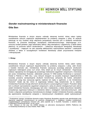 Gender mainstreaming w ministerstwach finansów Gita Sen Ministerstwa finansów w dużym stopniu uniknęły starannej kontroli, której celem byłoby uwrażliwienie różnych rządowych departamentów na problemy związane z płcią. W artykule wskazuję na trzy możliwe drogi włączenia perspektywy równości płci w działania ministerstw finansów: na poziomie bieżącego zarządzania makroekonomicznego, obejmującego m.in. coroczny budżet państwa i jego ewentualny deficyt, dług wewnętrzny i zagraniczny, a także bilans płatniczy; na poziomie reform strukturalnych – zwłaszcza dotyczących deregulacji, liberalizacji i prywatyzacji – mających na celu poprawę efektywności wykorzystania zasobów i zwalczanie ubóstwa; a także w szczegółowym kontekście liberalizacji zasad przyznawania kredytów i mikropożyczek. 1. Wstęp Ministerstwa finansów w dużym stopniu uniknęły starannej kontroli, której celem byłoby uwrażliwienie różnych rządowych departamentów na problemy związane z płcią. Jeśli chodzi o kwestie równości płci, ministerstwa finansów zazwyczaj pozostają jedynymi strukturami rządowymi nietkniętymi przez nurt zmian, który dotarł już do innych ministerstw1. Organizacje kobiece najczęściej nie domagają się poważnego traktowania zagadnień związanych z równością płci przez ministerstwa finansów. Jakkolwiek podczas IV ONZ-owskiej Konferencji w sprawach Kobiet w Pekinie w 1995 roku i przy różnych okazjach na szczeblu krajowym niejednokrotnie wyrażały poważne zaniepokojenie skutkami transformacji ustrojowej dla kobiet, adresatem krytycznych uwag były zazwyczaj agendy rządowe lub rządy w ogólności, a nie ministerstwa finansów2. Działo się tak, mimo iż organizacje kobiece mają świadomość, że to właśnie ministerstwa finansów kierują reformami strukturalnymi w poszczególnych krajach. Powodem takiej luki w próbach wprowadzenia zagadnień związanych z płcią do planów strategicznych jest zakres zadań ministerstw finansów, obowiązujący tam etos i nastawienie, a także stosunkowo niewielkie kompetencje organizacji kobiecych w dziedzinie debat o strategiach makroekonomicznych. Jeśli chodzi o włączanie perspektywy równościowej do strategii i działań ministerstw finansów, pojawiają się ograniczenia nieodłącznie związane z merytorycznym charakterem zadań wykonywanych 1 Przebadanie szeregu ministerstw finansów krajów Wspólnoty Brytyjskiej ujawniło brak jakichkolwiek prób włączenia zagadnień równościowych na poziomie strategicznym, z wyjątkiem inicjatyw budżetowych uwzględniających perspektywę równości płci, jakie pojawiły się w Australii, Kanadzie, a ostatnio także w Republice Południowej Afryki i na Sri Lance. 2 Por.: Markers on the way: the DAWN debates on alternative development, DAWN, Platforma dla IV Światowej Konferencji na rzecz Kobiet, Pekin 1995. 1 przez te struktury rządowe. Nie mają one bezpośredniego kontaktu z ludźmi, lecz mają do czynienia wyłącznie ze zmiennymi finansowymi – przychodami i wydatkami, podatkami i subwencjami, przydzielanymi i asygnowanymi funduszami. Do kwestii budżetu czy zbiorczej podaży pieniądza w gospodarce podchodzą z perspektywy zagregowanych danych makroekonomicznych. Wpływ działań podejmowanych przez ministerstwo finansów na równość/ na sytuację kobiet (czy też, ogólnie rzecz biorąc, na jednostki) odczuwalny jest jedynie pośrednio, poprzez wpływ strategii i zmiennych makroekonomicznych. Taka sytuacja różni się znacznie od panującej w edukacji, ochronie zdrowia, w sektorze rozwoju obszarów wiejskich, a nawet w tak zwanych resortach gospodarczych, na przykład w ministerstwie rolnictwa czy przemysłu, których strategie, programy i działania mają bezpośredni wpływ na dobrobyt ludzi. Włączenie analizy relacji między płciami w pracę tych ministerstw, choć oczywiście stanowi wyzwanie, w pewnym sensie jest prostsze niż równościowa reorientacja pracy ministerstw finansów. Być może właśnie z tego powodu tylko nieliczne ministerstwa finansów podjęły znaczący wysiłek, żeby włączyć perspektywę równościową do swojej pracy. Zakres zadań ministerstw finansów ma także wpływ na etos wyznawany przez pracujących tam ludzi i na otaczającą ich atmosferę. Makroekonomia, nawet w swojej najprostszej formie, jest mało zrozumiała dla nie-ekonomistów i osób, które nie specjalizują się w finansach; otacza ją aura technologicznej biegłości i tajemniczości. Sami ludzie pracujący w ministerstwach finansów często czują, że mają większą władzę dzięki swojej wyjątkowej wiedzy i rzadkim umiejętnościom, dlatego są mniej skłonni przyjmować krytykę od osób spoza swojej dziedziny. Z instytucjonalnego punktu widzenia ministerstwo finansów, zwłaszcza w dzisiejszych czasach, znajduje się wysoko w rządowej hierarchii. Praca tam wiąże się z prestiżem i autorytetem, do których ministerstwa zajmujące się rozwojem społecznym rzadko mogą aspirować. Dla kontrastu, rządowe instytucje (czy to ministerstwa, departamenty, wydziały specjalne, czy inne) odpowiedzialne za kwestie równości płci często stoją na przegranej pozycji z powodu małej liczebności zatrudnionych w nich osób, krótkiego czasu funkcjonowania, niepewnej przyszłości i braku dostępu do środków. Choć w skład ich zadań może wchodzić doradzanie innym ministerstwom (w tym ministerstwu finansów) lub kontrolowanie ich pracy, rzadko jednak mają wystarczającą władzą instytucjonalną, by robić to skutecznie. Wśród barier, na jakie napotyka wprowadzanie zasady włączania kwestii równości płci do głównego nurtu działań w ministerstwach finansów, można wymienić: - niedostateczną jasność analityczną w pracy ministerstw finansów, a zwłaszcza ich zmieniającą się rolę w ostatnim okresie globalizacji i liberalizacji gospodarek; - brak teoretycznego rozeznania, w jaki sposób rola ta po