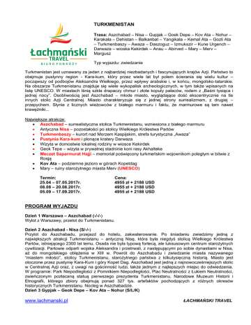 TURKMENISTAN Trasa: Aszchabad – Nisa – Gupjak – Goek Depe – Kov Ata – Nohur – Karakala – Dehistan – Balkanbat – Yangikala – Kemal Ata – Gozli Ata – Turkmenbaszy – Awaza – Daszoguz – Izmukszir – Kune Urgench – Darwaza – wioska Kekirdek – Anau – Abirved – Mary – Merv – Margusz Typ wyjazdu: zwiedzanie Turkmenistan jest uznawany za jeden z najbardziej niezbadanych i fascynujących krajów Azji. Państwo to obejmuje pustynny region - Kara-kum, który przez wiele lat był polem ścierania się wielu kultur – począwszy od podbojów Aleksandra Wielkiego, przez wpływy arabskie i, w końcu, mongolsko-tatarskie. Na obszarze Turkmenistanu znajduje się wiele wykopalisk archeologicznych, w tym także wpisanych na listę UNESCO. W miastach lśnią szkła drapaczy chmur i złote kopuły pałaców, rodem z „Baśni tysiąca i jednej nocy”. Osobliwością jest Aszchabad – młode miasto, wyglądające dość ekscentrycznie na tle innych stolic Azji Centralnej. Miasto charakteryzuje się z jednej strony surrealizmem, z drugiej – przepychem. Słynie z licznych wieżowców z białego marmuru i faktu, że marmurowe są tam nawet krawężniki... Największe atrakcje: Aszchabad – surrealistyczna stolica Turkmenistanu, wzniesiona z białego marmuru Antyczna Nisa – pozostałości po stolicy Wielkiego Królestwa Partów Turkmenbaszy – kurort nad Morzem Kaspijskim, strefa turystyczna „Awaza” Pustynia Kara-kum i płonące kratery Darwaza Wizyta w domostwie lokalnej rodziny w wiosce Kekirdek Geok Tepe – wizyta w prywatnej stadninie koni rasy Akhalteke Meczet Saparmurat Hajji – memoriał poświęcony turkmeńskim wojownikom poległym w bitwie z Rosją Kov Ata – podziemne jezioro w górach Kopetdag Mary – ruiny starożytnego miasta Merv (UNESCO) Termin: 25.04 – 07.05.2017r. 08.08 – 20.08.2017r. 05.09 – 17.09.2017r. Cena: 4955 zł + 2188 USD 4955 zł + 2188 USD 4955 zł + 2188 USD PROGRAM WYJAZDU Dzień 1 Warszawa – Aszchabad (-/-/-) Wylot z Warszawy, przelot do Turkmenistanu. Dzień 2 Aszchabad - Nisa (S/-/-) Przylot do Aszchabadu, przejazd do hotelu, zakwaterowanie. Po śniadaniu zwiedzimy jedną z największych atrakcji Turkmenistanu – antyczną Nisę, która była niegdyś stolicą Wielkiego Królestwa Partów, istniejącego 2300 lat temu. Osada nie była typową fortecą, ale luksusowym centrum starożytnych cywilizacji. Partowie odparli wojska Aleksandra i przetrwali, z następującymi po sobie dynastiami w Nisa, aż do mongolskiego oblężenia w XIII w. Powrót do Aszchabadu i zwiedzanie miasta nazywanego “miastem miłości”, stolicy Turkmenistanu, starożytnego państwa z kilkutysięczną historią. Miasto jest otoczone przez pustynię Kara-Kum i góry Kopet Dag. Aszchabad jest jedną z najnowocześniejszych stolic w Centralnej Azji oraz, z uwagi na gościnność ludzi, także jednym z najlepszych miejsc do odwiedzenia. W programie: Park Niepodległości z Pomnikiem Niepodległości, Plac Neutralności z Łukiem Neutralności, zwieńczonym pozłacaną statuą pierwszego prezydenta Turkmenistanu, Narodowe Muzeum Historii i Etnografii, którego zbiory obejmują ponad 327 tys. artefaktów pochodzących z różnych okresów historycznych Turkmenistanu. Nocleg w Aszchabadzie. Dzień 3 Gypjak – Geok Depe – Kov Ata – Nohur (S/L/K) www.lachmanski.pl ŁACHMAŃSKI TRAVEL Wyjazd w kierunku Nokhu (trasa ok.270 km – czas przejazdu ok.6 godz.). Po drodze wizyta w prywatnej stadninie koni mieszczącej się w Geok Tepe, gdzie zapoznamy się z końmi rasy Akhal-teke. Zobaczymy kompleks największego meczetu w Turkmenistanie i rodzinne mauzoleum pierwszego prezydenta w wiosce Gypjak. Następnie będziemy kontynuować naszą podróż do Geok Depe, zwiedzając dawną twierdzę Teke, gdzie w 1881 toczyła się wielka bitwa pomiędzy Turkmeńczykami, a Rosjanami. Zwiedzimy tutaj meczet Saparmurat Haji, zbudowany jako memoriał poświęcony turkmeńskim wojownikom, poległym w bitwie. Pojedziemy do Kov Ata (podziemne jezioro), mieszczącego się w największej jaskini gór Kopetdag. Woda w jeziorze jest ciepła przez cały rok. Przejazd do Nohur, gdzie w górskiej dolinie przetrwała kultura lokalnej społeczności. Wizyta na plemiennym cmentarzu. Odwiedzimy też domowy warsztat tkacki (wioska słynie z keteni - wyrobów tkackich zedwabiu). Kolację w formie grilla. Nocleg w namiotach. Dzień 4 Karakala – Dehistan - Balkanbat (S/L/K) Wcześnie rano wjazd w kierunku Dehistanu (trasa ok. 360 km – czas przejazdu ok. 7 godz.). Podczas przejazdu będziemy mijać góry Kopet-dag oraz będziemy podziwiać księżycowe krajobrazy okolic Karakala, zachwycające doliny rzeki Sumbar. Po przyjeździe do Dehistan, zwiedzanie ruin miasta (UNESCO) leżącego na Jedwabnym Szlaku, będącego ważnym ośrodkiem handlowym na terenach starożytnego Iranu w X-XIV wieku. W programie: meczet Szacha Chorezmu Muhammada, minaret, mury miejskie, cmentarz, meczet Mashhat Ata. Wyjazd w kierunku Balkanabat leżącego u stóp Wielkiego Bałchanu, ważnego centrum przemysłu naftowego i centrum ekonomicznego zachodniego Turkmenistanu. Zakwaterowanie w hotelu. Nocleg w Balkanabat. Dzień 5 Yangikala – Kemal Ata – Gozli Ata (S/L/K) Wcześnie rano wyjazd w kierunku Gozli Ata (trasa ok.320 km – czas przejazdu ok. 6 godz.). Pojedziemy przez góry Wielkiego Bałchanu do kanionów Yangisuw, co znaczy "ognista twierdza". Kaniony tworzą białe, różowe i pomarańczowe formacje wapienne formacje. Z serca kanionu krótki treking do Kemal Ata, miejsca pielgrzymkowego, które znajduje się u źródeł strumienia, który wyrzeźbił formacje skalne. Następnie przejazd do Gozli Ata, będącego również centrum pielgrzymkowym. Nocleg w domu pielgrzymkowym w Gozli Ata. Dzień 6 Gozli Ata - Turkmenbaszy – Awaza (S/-/-) Przejazd do Turkmenbaszy (trasa ok. 200 km – czas przejazdu ok. 5 godz.) nad Morzem Kaspijskim. Po przyjeździe zwiedzanie Turkmenbaszy, Narodowej Strefy 
