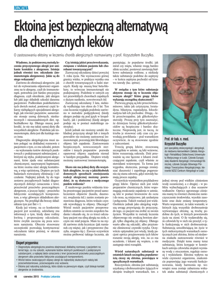 ROZMOWA Ektoina jest bezpieczną alternatywą dla chemicznych leków O zastosowaniu ektoiny w leczeniu chorób alergicznych rozmawiamy z prof. Krzysztofem Buczyłko. Wiadomo, że podstawową metodą leczenia przyczynowego alergii jest unikanie kontaktu z alergenem. Istnieje jednak również tzw. odczulanie (immunoterapia alergenowa). Jakie są do niego wskazania? Zarówno do eliminacji alergenów, jak też do wytwarzania odporności organizmu na te alergeny, czyli do immunoterapii, potrzebna jest bardzo precyzyjna diagnoza, czyli określenie, jaki alergen lub jaki jego składnik szkodzi danemu pacjentowi. Podkreślam podobieństwo tych dwóch metod, ponieważ część lekarzy niebędących specjalistami alergologii, jak również pacjentów, samorzutnie stosuje szereg dziwnych, nieskutecznych i nieuzasadnionych diet, np. bezbiałkowe itp. Dlatego muszę podkreślić, że nie ma takiej samej diety dla wszystkich alergików. Podobnie jak immunoterapia, dieta jest dla każdego nieco inna. Diagnostyka alergologiczna musi zatem polegać na dokładnej rozmowie z pacjentem o tym, co mu szkodzi, potem – na wykonaniu testów skórnych punktowych z podejrzanymi substancjami, z którymi się styka, podejrzanymi alergenami, które zjada oraz substancjami chemicznymi, nazywanymi haptenami, na które można mieć alergię kontaktową, a więc opóźnioną. Dopiero po tych badaniach rozważamy eliminację i odczulanie. Najlepiej jednak, by do tego zestawu początkowych badań diagnostycznych dołożyć oznaczenia z krwi, przeciwciał przeciwko poszczególnym alergenom, a jeszcze lepiej – przeciwko faktycznie uczulających komponentom, a więc głównym składnikom alergicznym. Na przykłąd dla brzozy składnikiem tym jest Bet v 1. Kiedy już wiemy, na co konkretnie pacjent jest uczulony, udzielamy mu informacji o tym, kiedy dane rośliny kwitną i proponujemy odczulanie, które zwykle zaczyna się poza sezonem narażenia. Obecnie stosowane szczepionki pozwalają kontynuować odczulanie także później, w okresie narażenia. Ekspert przypomina: Czy istnieją jakieś przeciwwskazania, związane z wiekiem pacjenta lub chorobami towarzyszącymi? Zazwyczaj odczulamy dzieci powyżej 5. roku życia. Nie wyznaczono górnej granicy wieku, w praktyce wynika ona z chorób towarzyszących u ludzi starszych. Kiedy np. muszą brać beta-blokery, to wówczas immunoterapii nie podejmujemy. Podobnie w ostrych czy też przewlekłych chorobach zapalnych o dużym nasileniu, nowotworach itd. Zazwyczaj odczulamy 3 lata, niekiedy wydłużając ten okres do 5 lat. Ten czas leczenia wygląda podobnie zarówno w metodzie podjęzykowej (kiedy alergen podaje się pod język w kropelkach), jak i podskórnej (kiedy alergen podaje się w postaci maleńkiego zastrzyku). Jeżeli jednak nie możemy ustalić dokładnej przyczyny alergii lub z innych powodów nie możemy zastosować immunoterapii, pozostają leki likwidujące objawy lub zapalenie. Zastosowanie bezpiecznych, nowoczesnych steroidów i innych preparatów pozwala opanować objawy zapalenia niemal w każdym przypadku. Dopiero wtedy możemy zastosować immunoterapię. Skoro nie ma jednej diety dla wszystkich alergików, to czy o jakichkolwiek domowych sposobach zmniejszania reakcji alergicznej możemy powiedzieć, że są skuteczne z medycznego punktu widzenia? Z naukowego punktu widzenia trzeba przestrzegać pacjentów przed samoleczeniem objawów (kaszlu, duszności, swędzenia itd.) zanim zostanie postawiona diagnoza, która wskaże czynnik wywołujący te objawy. Dlaczego? Wśród moich pacjentów przeprowadziłem ostatnio ze swoim zespołem badania i okazało się, że co trzeci odczulany pacjent ma silną alergię na zioła, o czym nie miał pojęcia. Mam tu na myśli zarówno zioła lecznicze (jak rumianek czy mięta), jak i przyprawowe (bazylia, oregano itp.). Zawsze oczywiście można próbować takiego leczenia, ale • Diagnostyka alergologiczna powinna obejmować dokładną rozmowę z pacjentem na temat tego, co mu szkodzi, wykonanie testów skórnych punktowych z podejrzanymi substancjami, a najlepiej także oznaczenia z krwi (przeciwciał przeciwko poszczególnym alergenom albo przeciwko faktycznie uczulających komponentom). • Wśród leków zwalczających objawy alergii do najbardziej skutecznych należą leki przeciwhistaminowe, przeciwzapalne oraz wziewne. • Ektoina jest naturalną substancją, która działa na pierwszym etapie, czyli blokuje kontakt alergenów ze środowiska. 46 czerwiec 2015 Praktyka Lekarska pamiętając, że popularne środki, jak miód czy mięta, właśnie mogą bardzo silnie uczulać, ponieważ zawierają białkowe substancje roślinne, a niekiedy także substancje podobne do aspiryny – w końcu aspiryna pochodzi od krzewu tawuły (łac. spirea). W związku z tym które substancje aktywne stosuje się w leczeniu objawowym alergii? Które grupy leków wykazują szczególną skuteczność? Pierwszą grupą są leki przeciwhistaminowe, takie jak cetyryzyna, loratadyna, bilastyna, rupatadyna, feksofenadyna lub ich pochodne. Drugą – leki przeciwzapalne, jak glikokortykosteroidy. Proszę przy tym zauważyć, że dzisiejsze formy glikokortykosteroidów są bezpieczne i bardzo skuteczne. Nieprawdą jest, że tuczą, że trzeba je stosować cały czas czy powodują powikłania – pod warunkiem oczywiście, że są stosowane zgodnie z zaleceniami. Trzecią grupą leków, stosowaną szczególnie w astmie, są leki wziewne, które rozszerzają oskrzela. Dziś przeważnie są one łączone z lekami zwalczającymi zapalenie, czyli właśnie ze steroidami wziewnymi. Ta forma jest wygodna, skuteczna, pomaga zmniejszać duszności i zapobiega pogarszaniu się stanu zdrowia, gdyż steroidy hamują proces zapalny. Oczywiście wymieniłem przykładowe grupy leków. Oprócz nich jest wiele preparatów chemicznych, które wspomagają zwalczanie zapalenia w astmie, są leki w postaci kromonów do oczu i do nosa, są miejscowe, jak azelastyna
