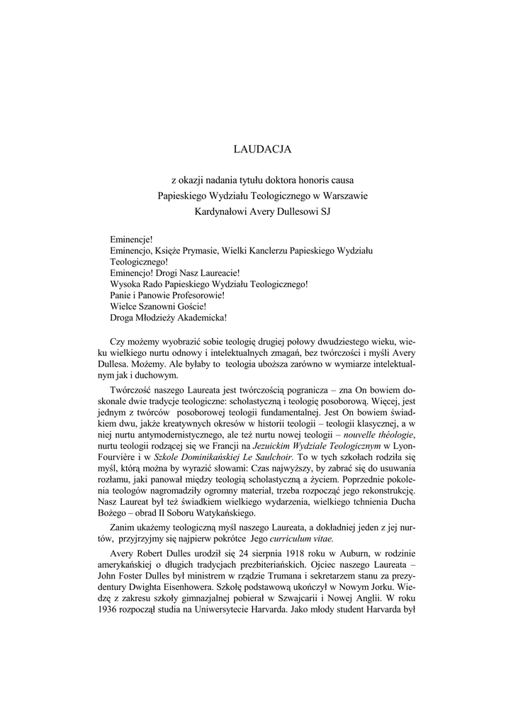 LAUDACJA z okazji nadania tytułu doktora honoris causa Papieskiego Wydziału Teologicznego w Warszawie Kardynałowi Avery Dullesowi SJ Eminencje! Eminencjo, KsięŜe Prymasie, Wielki Kanclerzu Papieskiego Wydziału Teologicznego! Eminencjo! Drogi Nasz Laureacie! Wysoka Rado Papieskiego Wydziału Teologicznego! Panie i Panowie Profesorowie! Wielce Szanowni Goście! Droga MłodzieŜy Akademicka! Czy moŜemy wyobrazić sobie teologię drugiej połowy dwudziestego wieku, wieku wielkiego nurtu odnowy i intelektualnych zmagań, bez twórczości i myśli Avery Dullesa. MoŜemy. Ale byłaby to teologia uboŜsza zarówno w wymiarze intelektualnym jak i duchowym. Twórczość naszego Laureata jest twórczością pogranicza – zna On bowiem doskonale dwie tradycje teologiczne: scholastyczną i teologię posoborową. Więcej, jest jednym z twórców posoborowej teologii fundamentalnej. Jest On bowiem świadkiem dwu, jakŜe kreatywnych okresów w historii teologii – teologii klasycznej, a w niej nurtu antymodernistycznego, ale teŜ nurtu nowej teologii – nouvelle théologie, nurtu teologii rodzącej się we Francji na Jezuickim Wydziale Teologicznym w LyonFourvière i w Szkole Dominikańskiej Le Saulchoir. To w tych szkołach rodziła się myśl, którą moŜna by wyrazić słowami: Czas najwyŜszy, by zabrać się do usuwania rozłamu, jaki panował między teologią scholastyczną a Ŝyciem. Poprzednie pokolenia teologów nagromadziły ogromny materiał, trzeba rozpocząć jego rekonstrukcję. Nasz Laureat był teŜ świadkiem wielkiego wydarzenia, wielkiego tchnienia Ducha BoŜego – obrad II Soboru Watykańskiego. Zanim ukaŜemy teologiczną myśl naszego Laureata, a dokładniej jeden z jej nurtów, przyjrzyjmy się najpierw pokrótce Jego curriculum vitae. Avery Robert Dulles urodził się 24 sierpnia 1918 roku w Auburn, w rodzinie amerykańskiej o długich tradycjach prezbiteriańskich. Ojciec naszego Laureata – John Foster Dulles był ministrem w rządzie Trumana i sekretarzem stanu za prezydentury Dwighta Eisenhowera. Szkołę podstawową ukończył w Nowym Jorku. Wiedzę z zakresu szkoły gimnazjalnej pobierał w Szwajcarii i Nowej Anglii. W roku 1936 rozpoczął studia na Uniwersytecie Harvarda. Jako młody student Harvarda był 8 KS. JÓZEF KULISZ zdeklarowanym agnostykiem. JuŜ wcześniej zetknął się z ateistycznym materializmem. W czasie studiów nasz Laureat zetknął się z myślą św. Augustyna, dzięki której zbliŜał się powoli do chrześcijaństwa. Dzięki przemianie wewnętrznej, w 1938 r. pozostawił Kościół prezbiteriański, do którego naleŜał jego ojciec i 26 listopada 1940 roku stał się członkiem Kościoła rzymsko-katolickiego. W tym teŜ roku ukończył Harvard i rozpoczął studia w Harvard Law School. Po półtora roku studiów wstąpił do Marynarki Wojennej Stanów Zjednoczonych, gdzie słuŜył pięć lat. Został tu oficerem łącznikowym na okręcie US Navy Philadelphia. W roku 1946 nasz Laureat podejmuje decyzję Ŝycia – wstępuje do Towarzystwa Jezusowego – do zakonu Jezuitów. Po ukończeniu dwuletniego nowicjatu, studiuje filozofię i teologię w Woodstock w Maryland. W latach 1951- 1953 wykładał filozofię na uniwersytecie Fordham. W 1956 r. otrzymał święcenia kapłańskie. W roku 1963 - 5 sierpnia - złoŜył uroczystą profesję zakonną. W latach 1957 –1958 odbywał studia specjalistyczne z teologii w Münster, a następnie w Rzymie w latach 1958-1960 na Gregorianum. Tu uzyskał doktorat z teologii na podstawie rozprawy na temat uczestnictwa Kościołów protestanckich w profetycznym urzędzie jedynego Kościoła. W Europie poznał ówczesnych wielkich teologów i działaczy ekumenizmu: Willebrandsa, Yves Congara, Jean Daniélou, Hansa Künga, Paul Tillicha i innych. Po uzyskaniu doktoratu wraca do Stanów Zjednoczonych, by podjąć wykłady filozofii i teologii fundamentalnej wprowadzonym przez jezuitów Woodstock College. W roku 1974 został profesorem teologii w Katolickim Uniwersytecie w Waszyngtonie. W latach następnych prowadził równieŜ wykłady w wielu innych amerykańskich uczelniach i uniwersytetach. Od roku 1992 do 1996 był członkiem Międzynarodowej Komisji Teologicznej przy Kongregacji Nauki Wiary. Jest jednym z najwybitniejszych teologów amerykańskich. 21 lutego 2001 roku Ojciec Święty Jan Paweł II wyniósł naszego Laureata do godności kardynalskiej wyraŜając w ten sposób uznanie dla jego zasług w pracy dla Kościoła. Nasz Laureat jest autorem 21 ksiąŜek i około 650 artykułów naukowych i haseł encyklopedycznych z zakresu teologii fundamentalnej. Jego zasługi na polu teologicznym zostały uhoronowane 28 doktoratami honoris causa i licznymi prestiŜowymi nagrodami.1 Nie sposób w krótkim wykładzie przedstawić całej panoramy treści zawartej w twórczości Laureata. Jego pierwsze zainteresowania kierowały się ku zagadnieniom wiary i apologetyki. Następnie, wiele miejsca poświęcił teologii objawienia oraz zagadnieniu stosunku wiary i rozumu, a takŜe wzajemnych odniesień wiary jednostki i wiary Kościoła. Nasz Laureat uczestniczy w dialogu katolicko-luterańskim i katolickoanglikańskim – sprawom ekumenizmu poświęca liczne artykuły i ksiąŜki. Zajmował się 1 Zob. I. SMENTEK, Eschatyczność Kościoła w ujęciu modeli eklezjologicznych kardynała Avery Dullesa SJ. Praca doktorska, mps. Warszawa 2002, 9-11; "Dulles Avery SJ", w: Leksykon teologii fundamentalnej, Lublin-Kraków 2002, s. 334-336:; W. DAWIDOWSKI OSA, "Avery Dulles – konwertytyta", w: Leksykon wielkich teologów XX/XXI wieku, Warszawa 2003, 81. LAUDACJA KARD. A. DULLESA 9 historią teologii i historią apologii. Są mu bliskie zagadnienia związane z katolicką nauką społeczną, jak teŜ aspekty religijne we współczesnej literaturze a nawet problemy dziedzictwa kulturowego w ogóle. Twórczość naszego Laureata wskazuje na wielki dynamizm, w którym poszukuje On nowych rozwiązań zawsze jednak z uwzgl
