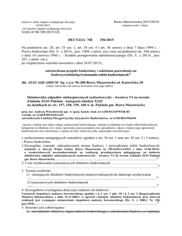 (nazwa i adres organu wydającego decyzję) 14245/2015 (nr rejestru organu wydającego decyzję) Rawa Mazowiecka 2015.08.05 (miejscowość i data) SAB.I.6740.380.2015.GS DECYZJA NR 356/2015 Na podstawie art. 28, art. 33 ust. 1, art. 34 ust. 4 i art. 36 ustawy z dnia 7 lipca 1994 r. – Prawo budowlane (Dz. U. z 2013r., poz. 1409, z późn. zm.) oraz na podstawie art. 104 ustawy z dnia 14 czerwca 1960 r. – Kodeks postępowania administracyjnego (Dz. U. z 2013r., poz. 267, z późn. zm.), po rozpatrzeniu wniosku inwestora z dnia 24.07.2015r., zatwierdzam projekt budowlany i udzielam pozwolenia na budowę/rozbiórkę/wykonanie robót budowlanych1) dla ZGO AQUARIUM Sp. z o.o. 96-200 Rawa Mazowiecka ul. Katowicka 20 (imię i nazwisko lub nazwa inwestora oraz jego adres) Składowisko odpadów niebezpiecznych (azbestowych) – kwatera VI na terenie Zakładu ZGO Pukinin - kategoria obiektu XXII na działkach nr ew. 157, 158, 159, 160 w m. Pukinin gm. Rawa Mazowiecka proj. inż. Andrzej Wierzbowski upr. w specj. konstr.-bud. nr LOD/0124/PWOK/03 i archit. nr LOD/0709/ZOOA/07 zaświadczenie Łódzkiej Okręgowej Izby Inżynierów Budownictwa nr ŁOD/BO/5944/04 (nazwa i rodzaj oraz adres całego zamierzenia budowlanego, rodzaj(-e) obiektu(-ów) bądź robót budowlanych, kategoria(-e) obiektu(-ów), imię i nazwisko autora projektu oraz specjalność, zakres i numer jego uprawnień budowlanych oraz informacje o wpisie na listę właściwej izby samorządu zawodowego) z zachowaniem następujących warunków zgodnie z art. 36 ust. 1 oraz art. 42 ust. 2 i 3 ustawy - Prawo budowlane: 1.Szczególne warunki zabezpieczenia terenu budowy i prowadzenia robót budowlanych: ustalenia w decyzji Wójta Gminy Rawa Mazowiecka nr OŚ.6220.3.4.2015 z dnia 15.06.2015r. o środowiskowych uwarunkowaniach na realizację przedsięwzięcia polegającego na budowie składowiska odpadów niebezpiecznych (azbestowych) – kwatery VI na terenie Zakładu ZGO Pukinin 2) gm. Rawa Mazowiecka............................................................................................................... 2. Czas użytkowania tymczasowych obiektów budowlanych: ……………………………….. ----............……………………………………………………………………………….....2) 3. Termin rozbiórki: 1) istniejących obiektów budowlanych nieprzewidzianych do dalszego użytkowania ---..…...................................................................................................................................2) 2) tymczasowych obiektów budowlanych ----..………………………...................................................................…………………...2) 4. Szczegółowe wymagania dotyczące nadzoru na budowie: Ustanowić inspektora nadzoru inwestorskiego zgodnie z § 2 ust. 1 pkt. 10 i § 2 ust. 2 Rozporządzenia Ministra Infrastruktury z dnia 19.11.2001r. w sprawie rodzajów obiektów budowlanych, przy których realizacji jest wymagane ustanowienie inspektora nadzoru inwestorskiego (Dz. U. z 2001r. Nr 138, 2) poz.1554),..................................................................................................................................... 5. Inwestor jest zobowiązany: 1) zawiadomić właściwy organ nadzoru budowlanego o zakończeniu budowy co najmniej 14 dni przed zamierzonym terminem przystąpienia do użytkowania; 2) 2) przed przystąpieniem do użytkowania uzyskać ostateczną decyzję o pozwoleniu na użytkowanie.2) 6. Kierownik budowy (robót) jest obowiązany prowadzić dziennik budowy lub rozbiórki oraz umieścić na budowie lub rozbiórce w widocznym miejscu tablicę informacyjną oraz ogłoszenie zawierające dane dotyczące bezpieczeństwa pracy i ochrony zdrowia.2) Obszar oddziaływania obiektu/-ów, o których mowa w art. 28 ust. 2 ustawy – Prawo budowlane, obejmuje nieruchomości: 1) dz. nr ew. 157, 158, 159, 160 obręb Pukinin gm. Rawa Mazowiecka............................. 2)........................................................................................................................................... UZASADNIENIE ZGO AQUARIUM Sp. z o.o. 96-200 Rawa Mazowiecka ul. Katowicka 20 wystąpiła w dniu 24.07.2015r. z wnioskiem do Starosty Rawskiego o wydanie pozwolenia na budowę składowiska odpadów niebezpiecznych (azbestowych) – kwatery VI na terenie ZGO Pukinin na działkach nr ew. 157, 158, 159, 160 w m. Pukinin gm. Rawa Mazowiecka. Do wniosku załączono projekt budowlany wraz z niezbędnymi uzgodnieniami, oświadczenie o posiadanym prawie do dysponowania nieruchomością na cele budowlane oraz decyzję Wójta Gminy Rawa Mazowiecka nr OŚ.6220.3.4.2015 z dnia 15.06.2015r. o środowiskowych uwarunkowaniach na realizację przedsięwzięcia. Realizacja inwestycji jest zgodna z ustaleniami obowiązującego miejscowego planu zagospodarowania przestrzennego gminy Rawa Mazowiecka zatwierdzonego uchwałą Nr VII/45/03 Rady Gminy Rawa Mazowiecka z dnia 9.07.2003r (Dz. Urz. Województwa Łódzkiego nr 264, poz. 2325 z późn.zm) oraz nie narusza uzasadnionego interesu osób trzecich. Po rozpatrzeniu akt sprawy przychylono się do wniosku i orzeczono jak w sentencji. Od decyzji przysługuje stronom odwołanie do Wojewody Łódzkiego, za moim pośrednictwem, w terminie 14 dni od dnia jej doręczenia. ................................................................... (pieczęć imienna i podpis osoby upoważnionej do wydania decyzji) ……………… (pieczęć okrągła) Pouczenie: 1. Inwestor jest obowiązany zawiadomić o zamierzonym terminie rozpoczęcia robót budowlanych, na które jest wymagane pozwolenie na budowę, właściwy organ nadzoru budowlanego oraz projektanta sprawującego nadzór nad zgodnością realizacji budowy z projektem, przed ich rozpoczęciem dołączając na piśmie: 1) oświadczenie kierownika budowy (robót, stwierdzające sporządzenie planu bezpieczeństwa i ochrony zdrowia oraz przyjęcie obowiązku kie
