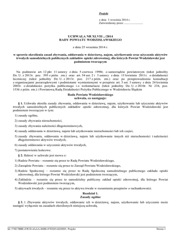 Projekt z dnia 3 września 2014 r. Zatwierdzony przez ......................... UCHWAŁA NR XLVII/.../2014 RADY POWIATU WODZISŁAWSKIEGO z dnia 25 września 2014 r. w sprawie określenia zasad zbywania, oddawania w dzierżawę, najem, użytkowanie oraz użyczenie aktywów trwałych samodzielnych publicznych zakładów opieki zdrowotnej, dla których Powiat Wodzisławski jest podmiotem tworzącym Na podstawie art. 12 pkt 11 ustawy z dnia 5 czerwca 1998r. o samorządzie powiatowym (tekst jednolity Dz. U. z 2013r. poz. 595 z późn. zm.) oraz art. 54 ust. 2 i 3 ustawy z dnia 15 kwietnia 2011r. o działalności leczniczej (tekst jednolity Dz. U. z 2013r. poz. 217 z późn. zm.) oraz po przeprowadzeniu konsultacji z organizacjami pozarządowymi i podmiotami wymienionymi w przepisie art. 3 ust. 3 ustawy z dnia 24 kwietnia 2003r. o działalności pożytku publicznego i o wolontariacie (tekst jednolity Dz. U. z 2010r. Nr 234, poz. 1536 z późn. zm.) i Powiatową Radą Działalności Pożytku Publicznego w Wodzisławiu Śląskim Rada Powiatu Wodzisławskiego uchwala, co następuje: § 1. Uchwała określa zasady zbywania, oddawania w dzierżawę, najem, użytkowanie lub użyczenie aktywów trwałych samodzielnych publicznych zakładów opieki zdrowotnej, dla których Powiat Wodzisławski jest podmiotem tworzącym w tym: 1) zasady ogólne, 2) zasady zbywania nieruchomości, 3) zasady zbywania należności długoterminowych, 4) zasady oddawania w dzierżawę, najem lub użytkowanie nieruchomości lub ich części, 5) zasady zbywania, oddawania w dzierżawę, najem lub użytkowanie innych niż nieruchomości i należności długoterminowe aktywów trwałych, 6) zasady oddawania w użyczenie aktywów trwałych, 7) postanowienia końcowe. § 2. Ilekroć w uchwale jest mowa o: 1) Radzie Powiatu – rozumie się przez to Radę Powiatu Wodzisławskiego, 2) Zarządzie Powiatu – rozumie się przez to Zarząd Powiatu Wodzisławskiego, 3) Radzie Społecznej – rozumie się przez to Radę Społeczną samodzielnego publicznego zakładu opieki zdrowotnej, dla którego Powiat Wodzisławski jest podmiotem tworzącym, 4) Zakładzie – rozumie się przez to samodzielny publiczny zakład opieki zdrowotnej, dla którego Powiat Wodzisławski jest podmiotem tworzącym, 5) aktywach trwałych – rozumie się przez to aktywa trwałe w rozumieniu przepisów o rachunkowości. Rozdział 1. Zasady ogólne § 3. 1. Zbywanie aktywów trwałych, oddawanie ich w dzierżawę, najem, użytkowanie lub użyczenie może nastąpić wyłącznie na zasadach określonych niniejszą uchwałą. Id: 578E7BBE-E9CD-4AAA-86B8-8702D5AD20D5. Projekt Strona 1 2. Czynności określone w ust. 1 nie mogą ograniczać możliwości realizacji zadań statutowych Zakładu oraz wpływać negatywnie na jakość realizowanych świadczeń zdrowotnych, prowadzić do wzrostu kosztów utrzymania, a także nie mogą naruszać art. 13 ustawy o działalności leczniczej. § 4. 1. Zbycie, wydzierżawienie, wynajęcie, oddanie w użytkowanie oraz użyczenie aktywów trwałych Zakładu wymaga zgody: 1) Rady Powiatu w przypadku zbycia nieruchomości, 2) Zarządu Powiatu w pozostałych przypadkach, z zastrzeżeniem ust. 6. 2. Zbycie aktywów trwałych Zakładu może nastąpić po pozytywnym zaopiniowaniu przez Radę Społeczną. 3. Postępowanie w sprawie wyrażenia zgody na zbycie, oddanie w dzierżawę, najem, użytkowanie oraz użyczenie aktywów trwałych Zakładu prowadzone jest na wniosek Dyrektora Zakładu. 4. Wniosek, o którym mowa w ust. 3, składa się do Zarządu Powiatu. 5. Wniosek, o którym mowa w ust. 3, powinien zawierać w szczególności: 1) uzasadnienie, 2) oświadczenie Dyrektora Zakładu, dotyczące spełnienia warunków określonych w § 3 ust. 2, 3) informacje o aktywach trwałych, m. in. nazwę i przeznaczenie, aktualną wartość rynkową wraz ze wskazaniem sposobu jej ustalenia, a w przypadku nieruchomości ich lokalizację oraz powierzchnię, 4) informacje o należnościach długoterminowych, m. in. potwierdzone za zgodność z oryginałem kserokopie dokumentów potwierdzających powstanie oraz wysokość należności długoterminowych mających być przedmiotem zbycia, 5) wskazanie na jaki okres planowane jest oddanie aktywów trwałych w dzierżawę, najem, użytkowanie lub użyczenie, 6) wysokość opłat, czynszu – w przypadku oddania aktywów trwałych w dzierżawę, najem, użytkowanie lub cenę zbycia. 6. Dyrektor Zakładu samodzielnie podejmuje decyzję o: 1) zbyciu, oddaniu w dzierżawę, najem lub użytkowanie aktywów trwałych Zakładu, których wartość księgowa netto nie przekracza 20 000,00 zł, 2) wydzierżawieniu, wynajęciu, oddaniu w użytkowanie nieruchomości lub ich części, na okres do 3 lat. § 5. 1. Aktywa trwałe Zakładu są zbywane, oddawane w dzierżawę, najem lub użytkowanie w drodze przetargu. 2. W uzasadnionych przypadkach na wniosek Dyrektora Zakładu: 1) odpowiednio Rada Powiatu lub Zarząd Powiatu może wyrazić zgodę na odstąpienie od przetargu, 2) w sytuacjach określonych w § 4 ust. 6 zgodę na odstąpienie od przetargu wyraża Zarząd Powiatu. 3. Umowy użytkowania, najmu lub dzierżawy na czas określony dłuższy niż 3 lata lub na czas nieoznaczony zawiera się w drodze bezprzetargowej, jeżeli użytkownikiem, najemcą lub dzierżawcą nieruchomości jest organizacja pożytku publicznego. 4. Wykaz aktywów trwałych przeznaczonych do zbywania, oddawania w dzierżawę, najem lub użytkowanie podaje się do publicznej wiadomości poprzez wywieszenie go na okres nie krótszy niż 21 dni na tablicy ogłoszeń w siedzibie Zakładu. Informację o wywieszeniu wykazu obejmującego nieruchomości lub ich części podaje się do publicznej wiadomości przez ogłoszenie w prasie lokalnej oraz na stronach internetowych Zakładu. 5. Z zastrzeżeniem postanowień ust. 6 w wykazie, o którym mowa w ust. 4, w szczególności wskazuje się rodzaj przeznaczonych do zbycia lub oddania w posiadanie zale
