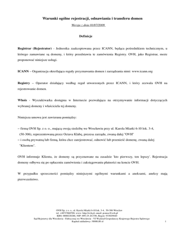 Warunki ogólne rejestracji, odnawiania i transferu domen Wersja z dnia 01/07/2009 Definicje Registrar (Rejestrator) Jednostka zaakceptowana przez ICANN, będąca pośrednikiem technicznym, u którego zamawiane są domeny, i który przedstawia te zamówienia Registry. OVH, jako Registrar, może proponować niniejsze usługi. ICANN – Organizacja określająca reguły przyznawania domen i zarządzania nimi: www.icann.org Registry – Operator działający według reguł utworzonych przez ICANN, i który zezwala OVH na rejestrowanie domen. Whois Wyszukiwarka dostępna w Internecie pozwalająca na otrzymywanie informacji dotyczących wybranej domeny i właściciela tej domeny. Niniejsza umowa jest zawierana pomiędzy: − firmą OVH Sp. z o. o., mającą swoją siedzibę we Wrocławiu przy ul. Karola Miarki 610 lok. 34, (50306), reprezentowaną przez Octava Klabę, prezesa zarządu, zwaną dalej ''OVH'' − i osobą prywatną lub firmą, która chce zarejestrować, odnowić lub przenieść domenę, zwaną dalej ''Klientem''. OVH informuje Klienta, że domeny są przyznawane na zasadzie 'kto pierwszy, ten lepszy'. Rejestracja domeny odbywa się po opłaceniu zamówienia i zaksięgowaniu płatności na koncie OVH. W przypadku sprzeczności pomiędzy niniejszymi ogólnymi warunkami a aneksami, aneksy mają pierwszeństwo. OVH Sp. z o. o., ul. Karola Miarki 610 lok. 34, 50306 Wrocław tel. +48717860700, www: http://ovh.pl, email: [email protected] KRS: 0000220286, NIP: 8992520556, Regon: 933029040 Sąd Rejonowy dla Wrocławia Fabrycznej we Wrocławiu VI Wydział Gospodarczy Krajowego Rejestru Sądowego Kapitał zakładowy: 50000,00 zł 1 Artykuł 1 Cel OVH jest upoważnione do rejestrowania w imieniu swoich Klientów domen i do ich odnawiania. Klient ma możliwość rejestracji dostępnych domen, zgodnie z aktualną ofertą. Artykuł 2 Procedura rejestracji domeny Każde zamówienie rezerwacji domeny jest równoznaczne z wcześniejszą, pełną akceptacją reguł administracyjnych i technicznych zarządzających rejestracją domen, i akceptacją reguł rozwiązywania konfliktów, jeśli takie reguły istnieją, mogących wystąpić między właścicielem domeny i osobą trzecią zastrzegającą sobie prawa do całości lub części tej domeny. Zasady rejestracji będą precyzowane w aneksach. 2.1. Klient zamawiający usługę dokonuje szczegółowego zgłoszenia na stronie www.ovh.pl z podaniem żądanych informacji. 2.2. Klient zobowiązany jest dostarczyć wszelkich informacji niezbędnych do rejestracji wybranej domeny. Na stronie internetowej www.ovh.pl przedstawione są Klientowi wszystkie niezbędne informacje dotyczące międzynarodowych reguł rejestracji domen utworzonych przez ICANN i Registry. Klient zobowiązany jest dostarczyć nazwisko i kompletne dane osoby, w imieniu której rejestrowana jest domena (registrant), nazwisko i kompletne dane jednostki właściwej do spraw administracyjnych (administrative contact), jednostki zajmującej się płatnościami (billing contact) i jednostki właściwej do spraw technicznych (technical contact). Poza tym Klient dostarczy adresy IP serwera 1, i ewentualnie serwera 2, dla wybranej domeny. Kompletne wypełnienie formularza jest koniecznym warunkiem rozpoczęcia rejestracji. Każda niepełna informacja spowoduje niepowodzenie rejestracji. OVH Sp. z o. o., ul. Karola Miarki 610 lok. 34, 50306 Wrocław tel. +48717860700, www: http://ovh.pl, email: [email protected] KRS: 0000220286, NIP: 8992520556, Regon: 933029040 Sąd Rejonowy dla Wrocławia Fabrycznej we Wrocławiu VI Wydział Gospodarczy Krajowego Rejestru Sądowego Kapitał zakładowy: 50000,00 zł 2 Klient zapewnia i przyjmuje odpowiedzialność za fakt, że dostał pozwolenie od wszystkich osób, których dane podaje, na podawanie ich danych osobowych. Dotyczy to nie tylko podania nazwisk i danych adresowych, lecz także przetwarzania danych osobowych gromadzenia i publikowania w Internecie. 2.3. OVH jest zobowiązane jedynie do starannego działania. Wskazanie przez OVH dostępności domeny na stronie www.ovh.pl nie ma charakteru wiążącego. Charakteru wiążącego nie ma także potwierdzenie rezerwacji wysyłane pocztą elektroniczną po wypełnieniu formalności związanych z rejestracją i otrzymaniu płatności. Tylko zatwierdzenie zamówienia przez OVH po sprawdzeniu i rejestracji przez Registry sprawi, że rejestracja będzie ważna. Zatwierdzenie zamówienia następuje maksymalnie 2 dni po potwierdzeniu zamówienia, termin ten może ulec przedłużeniu w przypadku wystąpienia szczególnej trudności, o której Klient zostanie poinformowany pocztą elektroniczną lub na stronie http://prace.ovh.pl/. Zamówienia zostaną przesłane przez OVH do Registry z wykorzystaniem bezpiecznego interfejsu. Do Klienta należy regularne sprawdzanie dostępności domen, które chce zamówić. Dostępność ta jest na bieżąco uaktualniana w bankach danych, zwłaszcza w bazie WHOIS (http://www.ovh.com/cgibin/whois.pl). OVH nie ponosi odpowiedzialności za dane znajdujące się w bazie danych Whois lub w innej bazie danych o takim charakterze ani za ich aktualizacje. 2.4. Jeśli jakiś element zamówienia rezerwacji musi zostać dodany, sprecyzowany lub zmodyfikowany, OVH powiadomi o tym Klienta pocztą elektroniczną. Klient zobowiązuje się odpowiedzieć w ciągu maksymalnie 48 godzin. W takiej sytuacji Klient nie ma pierwszeństwa do wybranej domeny, wybrana przez Klienta domena nie zostanie tymczasowo zarezerwowana na rzecz Klienta. Jeśli domena będzie obiektem rezerwacji ze strony osoby trzeciej w czasie oczekiwania na odpowiedź, OVH poinformuje o tym Klienta, który będzie musiał wybrać inną dostępną domenę. W przypadku, kiedy OVH nie ma możliwości zrealizowania zamówionej przez Klienta usługi (zmiana adresu firmy, zmiana właściciela,...) wskutek braku działań ze strony Klienta (dostarczenie wymaganych OVH Sp. z o. o., ul. Karola Miarki 610 lok. 34, 50306 Wrocław tel