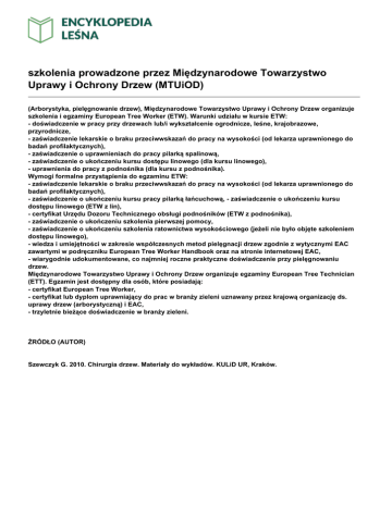 szkolenia prowadzone przez Międzynarodowe Towarzystwo Uprawy i Ochrony Drzew (MTUiOD) (Arborystyka, pielęgnowanie drzew), Międzynarodowe Towarzystwo Uprawy i Ochrony Drzew organizuje szkolenia i egzaminy European Tree Worker (ETW). Warunki udziału w kursie ETW: - doświadczenie w pracy przy drzewach lub/i wykształcenie ogrodnicze, leśne, krajobrazowe, przyrodnicze, - zaświadczenie lekarskie o braku przeciwwskazań do pracy na wysokości (od lekarza uprawnionego do badań profilaktycznych), - zaświadczenie o uprawnieniach do pracy pilarką spalinową, - zaświadczenie o ukończeniu kursu dostępu linowego (dla kursu linowego), - uprawnienia do pracy z podnośnika (dla kursu z podnośnika). Wymogi formalne przystąpienia do egzaminu ETW: - zaświadczenie lekarskie o braku przeciwwskazań do pracy na wysokości (od lekarza uprawnionego do badań profilaktycznych), - zaświadczenie o ukończeniu kursu pracy pilarką łańcuchową, - zaświadczenie o ukończeniu kursu dostępu linowego (ETW z lin), - certyfikat Urzędu Dozoru Technicznego obsługi podnośników (ETW z podnośnika), - zaświadczenie o ukończeniu szkolenia pierwszej pomocy, - zaświadczenie o ukończeniu szkolenia ratownictwa wysokościowego (jeżeli nie było objęte szkoleniem dostępu linowego), - wiedza i umiejętności w zakresie współczesnych metod pielęgnacji drzew zgodnie z wytycznymi EAC zawartymi w podręczniku European Tree Worker Handbook oraz na stronie internetowej EAC, - wiarygodnie udokumentowane, co najmniej roczne praktyczne doświadczenie przy pielęgnowaniu drzew. Międzynarodowe Towarzystwo Uprawy i Ochrony Drzew organizuje egzaminy European Tree Technician (ETT). Egzamin jest dostępny dla osób, które posiadają: - certyfikat European Tree Worker, - certyfikat lub dyplom uprawniający do prac w branży zieleni uznawany przez krajową organizację ds. uprawy drzew (arborystyczną) i EAC, - trzyletnie bieżące doświadczenie w branży zieleni. ŹRÓDŁO (AUTOR) Szewczyk G. 2010. Chirurgia drzew. Materiały do wykładów. KULiD UR, Kraków.