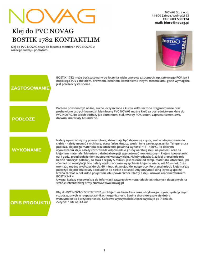 NOVAG Sp. z o. o. 41-800 Zabrze, Wolności 63 tel.: 603 533 174 mail: [email protected] Klej do PVC NOVAG BOSTIK 1782 KONTAKTLIM Klej do PVC NOVAG służy do łączenia membran PVC NOVAG z różnego rodzaju podłożami. ZASTOSOWANIE PODŁOŻE WYKONANIE OPIS PRODUKTU BOSTIK 1782 może być stosowany do łączenia wielu tworzyw sztucznych, np. sztywnego PCV, jak i miękkiego PCV z metalem, drewnem, betonem, kamieniem i innymi materiałami, gdzie wymagana jest przeźroczysta spoina. Podłoże powinno być nośne, suche, oczyszczone z kurzu, odtłuszczone i zagruntowane oraz pozbawione ostrych krawędzi. Membrany PVC NOVAG można kleić za pośrednictwem kleju do PVC NOVAG do takich podłoży jak aluminium, stal, twardy PCV, beton, zaprawa cementowa, drewno, materiały bitumiczne.. Należy upewnić się czy powierzchnie, które mają być klejone są czyste, suche i dopasowane do siebie - należy usunąć z nich kurz, starą farbę, tłuszcz, wosk i inne zanieczyszczenia. Temperatura podłoża, klejonego materiału oraz otoczenia powinna wynosić +15 - +20°C. Po dobrym wymieszaniu kleju należy rozprowadź odpowiednio grubą warstwę kleju na podłożu oraz na klejonym materiale. Materiały o dużej absorpcji zagruntować rozcieńczonym klejem i pozostawić na 1 godz. przed położeniem następnej warstwy kleju. Należy odczekać, aż klej przeschnie (nie będzie "moczył" palców), co trwa z reguły 5 minut i jest zależne od temp. materiału, otoczenia, jak również od wentylacji. Nie należy wydłużać czasu wysychania kleju do więcej niż 10 minut. Czas montażu można wydłużyć do ok. 60 minut aktywując klej na gorąco. Po przeschnięciu kleju należy połączyć klejone materiały i dokładnie do siebie docisnąć. Aby otrzymać silną i trwałą spoinę trzeba zadbać o dokładne połączenie obu powierzchni. Plamy z kleju usuwać rozcieńczalnikiem BOSTIK NR 4. Uwaga: Należy stosować się do informacji zawartych w materiałach technicznych dostępnych na stronie internetowej firmy NOVAG: www.novag.pl Klej do PVC NOVAG BOSTIK 1782 jest klejem na bazie kauczuku nitrylowego i żywic syntetycznych rozpuszczonych w rozpuszczalnikach organicznych. Spoina charakteryzuje się dobrą wytrzymałością i przyczepnością. Końcową wytrzymałość złącze uzyskuje po 7 dniach. Zużycie: 1 litr na 3-4 m² 1 NOVAG Sp. z o. o. 41-800 Zabrze, Wolności 63 tel.: 603 533 174 mail: [email protected] Wiadro o pojemności 5l PAKOWANIE PRZECHOWY WANIE PRODUKTY POWIĄZANE W chłodnych, dobrze wentylowanych pomieszczeniach, w szczelnych pojemnikach. Okres przechowywania to 12 miesięcy w suchych i w pomieszczeniach z dodatnią temperaturą w oryginalnie zamkniętych opakowaniach. ● Membrana PVC NOVAG izolacyjne: do wykonywania izolacji przeciwwodnych ● Membrana PVC NOVAG wierzchnia ● Membrana PVC NOVAG niezbrojona ● profile okapowe K60, K70: do wykończenia stref okapowych tarasów Uwaga: wszelkie materiały towarzyszące zastosowaniu produktu, a nie będące w aktualnej ofercie firmy NOVAG będą dostarczane na indywidualne zamówienie. 2
