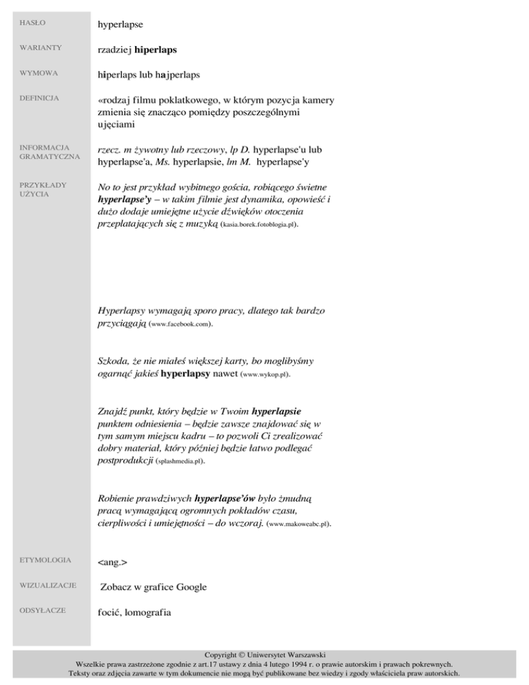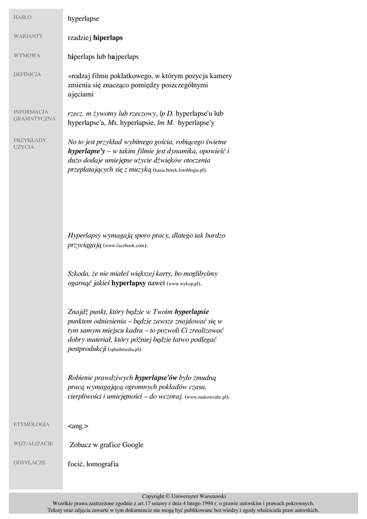 HASŁO hyperlapse WARIANTY rzadziej hiperlaps WYMOWA hiperlaps lub hajperlaps DEFINICJA «rodzaj filmu poklatkowego, w którym pozycja kamery zmienia się znacząco pomiędzy poszczególnymi ujęciami» INFORMACJA GRAMATYCZNA rzecz. m żywotny lub rzeczowy, lp D. hyperlapse'u lub hyperlapse'a, Ms. hyperlapsie, lm M. hyperlapse'y PRZYKŁADY UŻYCIA No to jest przykład wybitnego gościa, robiącego świetne hyperlapse’y – w takim filmie jest dynamika, opowieść i dużo dodaje umiejętne użycie dźwięków otoczenia przeplatających się z muzyką (kasia.borek.fotoblogia.pl). Hyperlapsy wymagają sporo pracy, dlatego tak bardzo przyciągają (www.facebook.com). Szkoda, że nie miałeś większej karty, bo moglibyśmy ogarnąć jakieś hyperlapsy nawet (www.wykop.pl). Znajdź punkt, który będzie w Twoim hyperlapsie punktem odniesienia – będzie zawsze znajdować się w tym samym miejscu kadru – to pozwoli Ci zrealizować dobry materiał, który później będzie łatwo podlegać postprodukcji (splashmedia.pl). Robienie prawdziwych hyperlapse’ów było żmudną pracą wymagającą ogromnych pokładów czasu, cierpliwości i umiejętności – do wczoraj. (www.makoweabc.pl). ETYMOLOGIA WIZUALIZACJE ODSYŁACZE <ang.> Zobacz w grafice Google focić, lomografia Copyright © Uniwersytet Warszawski Wszelkie prawa zastrzeżone zgodnie z art.17 ustawy z dnia 4 lutego 1994 r. o prawie autorskim i prawach pokrewnych. Teksty oraz zdjęcia zawarte w tym dokumencie nie mogą być publikowane bez wiedzy i zgody właściciela praw autorskich. LICENCJA Hasło udostępnione na licencji Creative Commons Uznanie autorstwa 3.0 Polska DATA Rejestracja hasła: 06.08.2016, 17.13, ostatnia aktualizacja hasła: 31.01.2017, 01.20 AUTOR Maciej Czeszewski REDAKTOR Jan Burzyński Copyright © Uniwersytet Warszawski Wszelkie prawa zastrzeżone zgodnie z art.17 ustawy z dnia 4 lutego 1994 r. o prawie autorskim i prawach pokrewnych. Teksty oraz zdjęcia zawarte w tym dokumencie nie mogą być publikowane bez wiedzy i zgody właściciela praw autorskich. Powered by TCPDF (www.tcpdf.org)