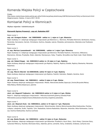 Komenda Miejska Policji w Częstochowie Źródło: http://www.czestochowa.slaska.policja.gov.pl/ka7/informacje/twoj-dzielnicowy/106764,Komisariat-Policji-w-Klomnicach.html Wygenerowano: Sobota, 4 marca 2017, 05:55 Komisariat Policji w Kłomnicach Wykaz rejonów i dzielnicowych Kierownik Ogniwa Prewencji - asp.szt. Radosław KOT Rejon numer 1. asp. szt. Grzegorz Kuban - tel. 508036609 - sektor nr. I, rejon nr 1 gm. Kłomnice Rejon służbowy nr 1 obejmuje następujące miejscowości gm.Kłomnice t.j.: Kłomnice, Michałów Kłomnicki, Bartkowice, Konary, Pacierzów, Karczewice, Garnek, Chmielarze, Kuźnica, Zawada, Lipicze, Śliwaków, Jamrozowizna, Zbereska oraz Pustkowie Kłomnickie Rejon numer 2. st. asp. Mariusz Lewandowski - tel. 508036608, - sektor nr 1 rejon 2 gm. Kłomnice Rejon służbowy nr 2 obejmuje następujące miejscowości gm.Kłomnice: Michałów Rudnicki, Chorzenice, Witkowice, Nieznanice, Zdrowa, Przybyłów, Niwki, Adamów, Rzerzęczyce, Huby, Trząstka, Skrzydlów oraz Rzeki małe i Rzeki Wielkie Rejon numer 3 . asp. szt. Robert Bugaj - tel. 508036613 sektor nr. III rejon nr 3 gm. Rędziny Rejon służbowy obejmuje następujące miejscowości gm.Rędziny: Rędziny, Rędziny Osiedle, Rędziny Ołowianka, Marianka Rędzińska Rejon numer 4. mł. asp. Marcin Oberski tel.508036638, sektor III rejon nr 4 gm. Rędziny Rejon służbowy obejmuje następujące miejscowosci gm.Rędziny: Rudniki, Kościelec, Madalin, Karolina, Konin Rejon numer 5. mł. asp. Paweł Kuban - tel. 508036611 - sektor II rejon nr 5 gm. Mstów Rejon służbowy obejmuje nastepujące miejscowości :Mstów, Wancerzów,Siedlec,Gąszczyk,,Srocko,Brzyszów,Małusy Małe,Małusy Wielkie,Kobyłczyce, Jaskrów Rejon numer 6. sierż. szt. Bogumił Trejtowicz - tel. 508036610 sektor nr II rejon nr 6 gm. Mstów Rejon 6 : obejmuje następujące miejscowości : Mokrzesz,Kuśmierki,Jaźwiny,Zawada,Pniaki Mokrzeskie,Łuszczyn,Rajsko,Krasice,Kłobukowice,Kuchary,Cegielnia,Latosówka . Rejon numer 7. sierż. szt. Wojciech Kula - tel. 508036612, sektor nr IV rejon nr 7 gm. Mykanów Rejon służbowy obejmuje następujące miejscowości: Wierzchowisko, Kolonia Wierzchowisko,Wola Kiedrzyńska, Florków, Lubojna, Lubojenka, Dudki, Topolów, Tylin, Radostków, Kolonia Radostków, Mykanów, Antoniów, Wola Hankowska, Czarny Las, Kużnica Kiedrzyńska, Kużnica Lechowa Rejon numer 8. mł. asp. Beata Żmuda - tel. 508036614- sektor IV rejon nr 8 gm. Mykanów Rejon służbowy obejmuje następujące miejscowości gm.Mykanów: Przedkocin, Kocin Stary , Kocin Nowy, Cykarzew Stary, Cykarzew Północny, Rusinów, Broniszew Stary, Adamów, Jamno, Lemańsk, Osiny, Grabówka, Grabowa, Lochynia oraz Borowno, Nowa Rybna, Rybna i Kokawa Rejon numer 10. asp. szt. Mirosław Nowak - tel. 508036616, - sektor V rejon nr 10 gm. Kruszyna Rejon służbowy obejmuje wszystkie miejscowości położone na terenie gm.Kruszyna t.j. Kruszyna, Jacków, Baby, Teklinów, Lgota Mała, Widzów, Widzówek, Pienki Szczepockie, Bogusławice, Wikłów, Łęg oraz Kijów Ocena: 4.5/5 (5) Tweetnij