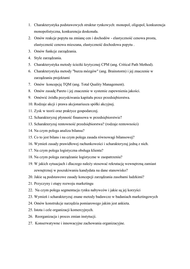1. Charakterystyka podstawowych struktur rynkowych: monopol, oligopol, konkurencja monopolistyczna, konkurencja doskonała. 2. Omów reakcje popytu na zmianę cen i dochodów - elastyczność cenowa prosta, elastyczność cenowa mieszana, elastyczność dochodowa popytu . 3. Omów funkcje zarządzania. 4. Style zarządzania. 5. Charakterystyka metody ścieŜki krytycznej CPM (ang. Critical Path Method). 6. Charakterystyka metody "burza mózgów" (ang. Brainstorm) i jej znaczenie w zarządzaniu projektami 7. Omów koncepcję TQM (ang. Total Quality Management). 8. Omów zasadę Pareto i jej znaczenie w systemie zapewnienia jakości. 9. Omówić źródła pozyskiwania kapitału przez przedsiębiorstwa. 10. Rodzaje akcji i prawa akcjonariusza spółki akcyjnej. 11. Zysk w teorii oraz praktyce gospodarczej. 12. Scharakteryzuj płynność finansowa w przedsiębiorstwie? 13. Scharakteryzuj rentowność przedsiębiorstwa? (rodzaje rentowności) 14. Na czym polega analiza bilansu? 15. Co to jest bilans i na czym polega zasada równowagi bilansowej? 16. Wymień zasady prawidłowej rachunkowości i scharakteryzuj jedną z nich. 17. Na czym polega logistyczna obsługa klienta? 18. Na czym polega zarządzanie logistyczne w zaopatrzeniu? 19. W jakich sytuacjach i dlaczego naleŜy stosować rekrutację wewnętrzną zamiast zewnętrznej w poszukiwaniu kandydata na dane stanowisko? 20. Jakie są podstawowe zasady koncepcji zarządzania zasobami ludzkimi? 21. Przyczyny i etapy rozwoju marketingu 22. Na czym polega segmentacja rynku nabywców i jakie są jej korzyści 23. Wymień i scharakteryzuj znane metody badawcze w badaniach marketingowych 24. Omów konstrukcje narzędzia pomiarowego jakim jest ankieta. 25. Istota i cele organizacji komercyjnych. 26. Reorganizacja i proces zmian instytucji. 27. Konserwatywne i innowacyjne zachowania organizacyjne. PYTANIA ZE SPECJALIZACJI logistyka w firmach usługowych 1. Istota zarządzania logistycznego w przedsiębiorstwach usługowych 2. Klasyfikacja usług 3. Rodzaje strategii dystrybucji, ich zalety i wady. 4. Opisać elementy przedtransakcyjne, transakcyjne i potransakcyjne obsługi klienta 5. Istota oraz rodzaje outsourcingu 6. Na czym polega logistyczna obsługa klienta 7. Analiza ABC w odniesieniu do klientów 8. Na czym polega koncepcja ECR 9. Rola zintegrowanych systemów informatycznych w firmach usługowych. 10. Na czym polega efekt byczego bicza? W jaki sposób moŜna go ograniczyć? 11. Istota oraz narzędzia controllingu logistycznego. .
