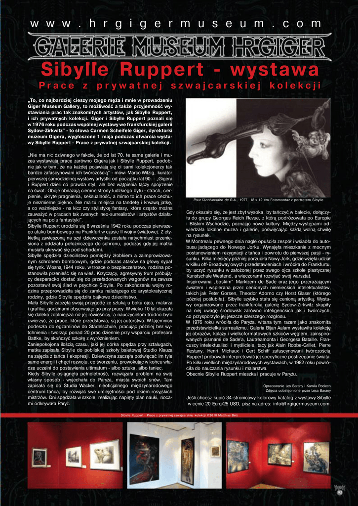 w w w . h r g i g e r m u s e u m . c o m Sibylle Ruppert - wystawa Prace z prywatnej szwajcarskiej kolekcji „To, co najbardziej cieszy mojego męża i mnie w prowadzeniu Giger Museum Gallery, to możliwość a także przyjemność wy stawiania prac tak znakomitych artystów, jak Sibylle Ruppert, i ich prywatnych kolekcji. Giger i Sibylle Ruppert poznali się w 1976 roku podczas wspólnej wystawy we frankfurckiej galerii Sydow-Zirkwitz" - to słowa Carmen Scheifele Giger, dyrektorki muzeum Gigera, wygłoszone 1 maja podczas otwarcia wysta wy Sibylle Ruppert - Prace z prywatnej szwajcarskiej kolekcji. „Nie ma nic dziwnego w fakcie, że od lat 70. te same galerie i mu zea wystawiają prace zarówno Gigera jak i Sibylle Ruppert, podob nie jak w tym, że na każdej pojawiają się ci sami kolekcjonerzy tak bardzo zafascynowani ich twórczością" - mówi Marco Witzig, kurator pierwszej samodzielnej wystawy artystki od początku lat 90. - „Gigera i Ruppert dzieli co prawda styl, ale bez wątpienia tączy spojrzenie na świat. Oboje obnażają ciemne strony ludzkiego bytu - strach, cier pienie, ukryte pragnienia, seksualność, a mimo to ich prace cechu je niezmierne piękno. Nie ma tu miejsca na tandetę i krwawą jatkę, a co ważniejsze - na kicz czy stylistykę fantasy, które często można zauważyć w pracach tak zwanych neo-surrealistów i artystów działa jących na polu fantastyki". Sibylle Ruppert urodziła się 8 września 1942 roku podczas pierwsze go ataku bombowego na Frankfurt w czasie II wojny światowej. Z ety kietką zawieszoną na szyi dziewczynka została natychmiast przenie siona z oddziału położniczego do schronu, podczas gdy jej matka musiała ukrywać się pod schodami. Sibylle spędziła dzieciństwo pomiędzy żłobkiem a zaimprowizowa nym schronem bombowym, gdzie podczas ataków na głowy sypał się tynk. Wiosną 1944 roku, w trosce o bezpieczeństwo, rodzina po stanowiła przenieść się na wieś. Krzyczący, agresywny tłum próbują cy desperacko dostać się do przeładowanych wagonów na zawsze pozostawił swój ślad w psychice Sibylle. Po zakończeniu wojny ro dzina przeprowadziła się do zamku należącego do arystokratycznej rodziny, gdzie Sibylle spędziła bajkowe dzieciństwo. Mała Sibylle zaczęła swoją przygodę ze sztuką u boku ojca, malarza i grafika, godzinami obserwując go przy pracy. W wieku 10 lat okazała się daleko zdolniejsza niż jej rówieśnicy, a nauczycielom trudno było uwierzyć, że prace, które przedstawia, są jej autorstwa. W tajemnicy podeszła do egzaminów do Städelschule, pracując później bez wy tchnienia i tworząc ponad 20 prac dziennie przy wsparciu profesora Battke, by skończyć szkołę z wyróżnieniem. Zaniepokojona ilością czasu, jaki jej córka spędza przy sztalugach, matka zapisała Sibylle do pobliskiej szkoły baletowej Studio Klauza na zajęcia z tańca i ekspresji. Dziewczyna zaczęła poświęcać im tyle samo energii i chęci rozwoju, co tworzeniu, prowokując w końcu wła dze uczelni do postawienia ultimatum - albo sztuka, albo taniec. Kiedy Sibylle osiągnęła pełnoletność, rozwiązała problem na swój własny sposób - wyjechała do Paryża, miasta swoich snów. Tam zapisała się do Studia Wacker, nieoficjalnego międzynarodowego centrum tańca, by rozwijać swe umiejętności pod okiem rosyjskich mistrzów. Dni spędzała w szkole, realizując napięty plan nauki, noca mi odkrywała Paryż. Pour l'Anniversaire de B.A., 1977, 18 x 12 cm Fotomontaż z portretem Sibylle Gdy okazało się, że jest zbyt wysoka, by tańczyć w balecie, dołączy ła do grupy Georges Reich Revue, z którą podróżowała po Europie i Bliskim Wschodzie, poznając nowe kultury. Między występami od wiedzała lokalne muzea i galerie, poświęcając każdą wolną chwilę na rysunek. W Montrealu pewnego dnia nagle opuściła zespół i wsiadła do auto busu jadącego do Nowego Jorku. Wynajęła mieszkanie z mocnym postanowieniem rezygnacji z tańca i powrotu do pierwszej pasji - ry sunku. Kilka miesięcy później porzuciła Nowy Jork, gdzie wzięła udział w kilku off-Broadway'owych przedstawieniach i wróciła do Frankfurtu, by uczyć rysunku w założonej przez swego ojca szkole plastycznej Kunstschule Westend, a wieczorami rozwijać swój warsztat. Inspirowana „boskim" Markizem de Sade oraz jego przerażającym światem i wspierana przez cenionych niemieckich intelektualistów, takich jak Peter Gorsen, Theodor Adorno czy Horst Glaser (którego później poślubiła), Sibylle szybko stała się cenioną artystką. Wysta wy organizowane przez frankfurcką galerię Sydow-Zirkwitz skupiły na niej uwagę środowisk zarówno inteligenckich jak i twórczych, co przysporzyło jej jeszcze szerszego rozgłosu. W 1976 roku wróciła do Paryża, witana tym razem jako znakomita przedstawicielka surrealizmu. Galeria Bijan Aalam wystawiła kolekcję jej obrazów, kolaży i wielkoformatowych szkiców węglem, zainspiro wanych pismami de Sade'a, Lautréamonta i Georgesa Bataille. Fran cuscy intelektualiści i myśliciele, tacy jak Alain Robbe-Grillet, Pierre Restany, Henri Michaux i Gert Schiff zafascynowani twórczością Ruppert próbowali interpretować jej specyficzne postrzeganie świata. Po kilku wielkich międzynarodowych wystawach, w 1982 roku powró ciła do nauczania rysunku i malarstwa. Obecnie Sibylle Ruppert mieszka i pracuje w Paryżu. Opracowanie Les Barany i Kamila Pociech Zdjęcia udostępnione przez Lesa Barany Jeśli chcesz kupić 34-stronicowy kolorowy katalog z wystawy Sibylle w cenie 20 Euro/25 USD, pisz na adres: [email protected]. Sibylle Ruppert - Prace z prywatnej szwajcarskiej kolekcji ©2010 Matthias Belz J'écrasai le Ver luisant, 1979, 168 x 105 cm Décadence, 1976, 105 x 85 cm. La Bible du Mal, 1978, 200 x 340 cm La Lutte, 1977, 36 x 26 cm Ma Sœur Mon Epouse, 1975, 84 x 105 cm Les Sacrifice, 1980, 65 x 81 cm Le Massacre, 1980, 65 x 81 cm