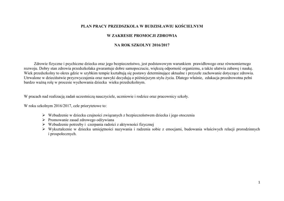PLAN PRACY PRZEDSZKOLA W BUDZISŁAWIU KOŚCIELNYM W ZAKRESIE PROMOCJI ZDROWIA NA ROK SZKOLNY 2016/2017 Zdrowie fizyczne i psychiczne dziecka oraz jego bezpieczeństwo, jest podstawowym warunkiem prawidłowego oraz równomiernego rozwoju. Dobry stan zdrowia przedszkolaka gwarantuje dobre samopoczucie, większą odporność organizmu, a także ułatwia zabawę i naukę. Wiek przedszkolny to okres gdzie w szybkim tempie kształtują się postawy determinujące aktualne i przyszłe zachowanie dotyczące zdrowia. Utrwalone w dzieciństwie przyzwyczajenia oraz nawyki decydują o późniejszym stylu życia. Dlatego właśnie, edukacja prozdrowotna pełni bardzo ważną rolę w procesie wychowania dziecka wieku przedszkolnym. W pracach nad realizacją zadań uczestniczą nauczyciele, uczniowie i rodzice oraz pracownicy szkoły. W roku szkolnym 2016/2017, cele priorytetowe to: Wzbudzenie w dziecku czujności związanych z bezpieczeństwem dziecka i jego otoczenia Promowanie zasad zdrowego odżywiana Wzbudzenie potrzeby i czerpania radości z aktywności fizycznej Wykształcenie w dziecku umiejętności nazywania i radzenia sobie z emocjami, budowania właściwych relacji prorodzinnych i prospołecznych. 1 Działania prozdrowotne zaplanowane do realizacji I. Bezpieczeństwo L.p. 1. Zadania Bezpieczne poruszanie się po przedszkolu Metody realizacji, Pogadanki Środki Wykonawcy D. Woźniak D. Pietrzykowska M. Sawicka K. Kaźmierowska D. Nowakowska D. Budkiewicz K. Biernacka A. Wareńczak Termin Cały rok 2. Bezpieczeństwo w ruchu drogowym Zajęcia o tematyce bezpieczeństwa w ruchu drogowym, poznanie zasad ruchu drogowego. Kamizelki odblaskowe, „Autochodzik”, sygnalizator świetlny D. Woźniak D. Pietrzykowska M. Sawicka K. Kaźmierowska D. Nowakowska D. Budkiewicz K. Biernacka Wrzesień 3. Kodeks Przedszkolaka Utworzenie Kodeksu Przedszkolaka Wrzesień Znaki graficzne, ilustracje D. Woźniak D. Pietrzykowska M. Sawicka K. Kaźmierowska D. Nowakowska Cały rok Kryterium sukcesu Dzieci znają zasady bezpiecznego poruszania się (w parach, kolumnie, indywidualnie) po przedszkolu, na wycieczkach i spacerach, a także zasady korzystania ze sprzętów w poszczególnych salach i pomieszczeniach Dziecko zna zasady bezpiecznego poruszania się w ruchu drogowym. Wie że w ruchu ulicznym może poruszać się tylko z osobą dorosłą, Dzieci stosują się do ustalonych reguł i zasad 2 4. Spotkanie ze Strażą Spotkanie dzieci z całego Pożarną przedszkola ze Strażą Pożarną 5. Z książką uczymy się jak żyć bezpiecznie. Spotkanie czytelnicze D. Budkiewicz K. Biernacka K. Kaźmierowska D. Nowakowska Książki dla dzieci K. Biernacka D. Budkiewicz T. Fekner Kwiecień/Maj Dzieci potrafią powiedzieć kilka zdań na temat pracy strażaka, potrafią wymienić numery telefonów alarmowych 999 pogotowie ratunkowe, 998 straż pożarna, 997 policja - dz. znają zasady ruchu drogowego, wiedzą jak przechodzić przez ulicę, sygnalizator świetlny, numery telefonów alarmowych II. Promowanie zasad zdrowego odżywiania L.p. 1. Zadania Realizacja tematów kompleksowych „Dary jesieni” i „Bądźmy zdrowi, wiemy więc Metody realizacji, Zapoznanie dzieci ze zdrową żywnością Uświadomienie dzieciom jak ważne w życiu jest zdrowe Środki Zdrowa żywność, sprzęt gimnastyczny Wykonawcy D. Nowakowska K. Kaźmierowska Termin Kryterium sukcesu Wrzesień/Październik Dzieci znają zasady prawidłowego odżywiania i wiedzą, jak ważna jest aktywność 3 działamy” odżywianie i aktywność ruchowa ruchowa 2. „Śniadanie daje moc” Każdy przedszkolak może zostać kucharzem. Wykonywanie przez dzieci z przedszkola pomysłowych i zdrowych przekąsek Przygotowanie i spożywanie śniadania Zdrowa żywność D. Woźniak D. Pietrzykowska M. Sawicka K. Kaźmierowska D. Nowakowska D. Budkiewicz K. Biernacka Listopad Dzieci znają zasady prawidłowego odżywiania i roli śniadania jako najważniejszego posiłku w ciągu dnia 3. Spotkanie z pielęgniarką Spotkanie z 5-latkami Narzędzia pielęgniarki K. Kaźmierowska D. Nowakowska Październik/Listopad Dzieci potrafią powiedzieć kilka zdań na temat pracy pielęgniarki, wiedzą co należy robić, żeby być zdrowym, wymieniają narzędzia potrzebne do pracy pielęgniarki, potrafią wymienić numery telefonów alarmowych 999 pogotowie 4 ratunkowe, 998 straż pożarna, 997 policja 4. Spotkanie z ratownikiem medycznym Spotkanie ratownika z dziećmi 3,4 letnimi, Akcesoria ratownika medycznego M. Sawicka D. Woźniak Kwiecień Dzieci wiedza kim jest ratownik medyczny, znają funkcję jaką pełni, mają zaufanie do osób niosących pomoc 5. Koktajle mleczno owocowe Wykonanie przez dzieci zdrowych koktajli z mleka i owoców Owoce, mleko K. Biernacka D. Budkiewicz Wrzesień 6. Surówki z jabłka i marchewki Surówki z jabłka i marchewki Jabłka, marchew K. Biernacka D. Budkiewicz Październik 7. Owocowe przyjęcie Zdrowy, owocowy poczęstunek podczas uroczystości grupowych Owoce M. Sawicka Wrzesień Dzieci wiedzą, że należy jeść dużo owoców i warzyw, że są one zdrowe, mają dużo witamin Dziecko wykona zdrowe, witaminowe smakołyki Dziecko wie że zdrowe przekąski są alternatywą dla słodyczy. 5 III. Rozpowszechnianie aktywnego trybu życia. L.p. Zadania Metody realizacji, Środki Wykonawcy Termin, 1. Ćwiczenia poranne, ćwiczenia gimnastyczne, zabawy ruchowe, Udział w ćwiczeniach porannych, gimnastycznych, zabawach ruchowych, spacerach Cały rok Sprzęt gimnastyczny Cały rok 2. Aktywność na świeżym powietrzu (spacery, zabawy ruchowe, zabawy na placu zabaw, w miejscu zabaw) Udział spacerach, zabawach ruchowych Sprzęt rekreacyjnosportowy 3. Aktywny udział w „Europejskim Tygodniu Sportu” Zajęcia w grupach na świeżym powietrzu Przybory sportowe 4. IV Gminna Olimpiada Sportowej Przedszkolaków. Udział dzieci w IV Gminnej Olimpiadzie Sportowej Przedszkolaków. Stroje sportowe, akcesoria kibica, przybory sportowe D. Woźniak D. Pietrzyko