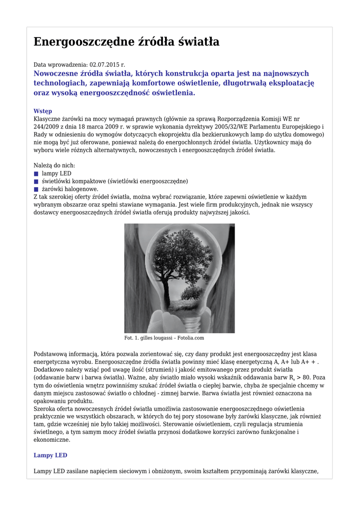 Energooszczędne źródła światła Data wprowadzenia: 02.07.2015 r. Nowoczesne źródła światła, których konstrukcja oparta jest na najnowszych technologiach, zapewniają komfortowe oświetlenie, długotrwałą eksploatację oraz wysoką energooszczędność oświetlenia. Wstęp Klasyczne żarówki na mocy wymagań prawnych (głównie za sprawą Rozporządzenia Komisji WE nr 244/2009 z dnia 18 marca 2009 r. w sprawie wykonania dyrektywy 2005/32/WE Parlamentu Europejskiego i Rady w odniesieniu do wymogów dotyczących ekoprojektu dla bezkierunkowych lamp do użytku domowego) nie mogą być już oferowane, ponieważ należą do energochłonnych źródeł światła. Użytkownicy mają do wyboru wiele różnych alternatywnych, nowoczesnych i energooszczędnych źródeł światła. Należą do nich: ■ lampy LED ■ świetlówki kompaktowe (świetlówki energooszczędne) ■ żarówki halogenowe. Z tak szerokiej oferty źródeł światła, można wybrać rozwiązanie, które zapewni oświetlenie w każdym wybranym obszarze oraz spełni stawiane wymagania. Jest wiele firm produkcyjnych, jednak nie wszyscy dostawcy energooszczędnych źródeł światła oferują produkty najwyższej jakości. Fot. 1. gilles lougassi – Fotolia.com Podstawową informacją, która pozwala zorientować się, czy dany produkt jest energooszczędny jest klasa energetyczna wyrobu. Energooszczędne źródła światła powinny mieć klasę energetyczną A, A+ lub A+ + . Dodatkowo należy wziąć pod uwagę ilość (strumień) i jakość emitowanego przez produkt światła (oddawanie barw i barwa światła). Ważne, aby światło miało wysoki wskaźnik oddawania barw Ra > 80. Poza tym do oświetlenia wnętrz powinniśmy szukać źródeł światła o ciepłej barwie, chyba że specjalnie chcemy w danym miejscu zastosować światło o chłodnej - zimnej barwie. Barwa światła jest również oznaczona na opakowaniu produktu. Szeroka oferta nowoczesnych źródeł światła umożliwia zastosowanie energooszczędnego oświetlenia praktycznie we wszystkich obszarach, w których do tej pory stosowane były żarówki klasyczne, jak również tam, gdzie wcześniej nie było takiej możliwości. Sterowanie oświetleniem, czyli regulacja strumienia świetlnego, a tym samym mocy źródeł światła przynosi dodatkowe korzyści zarówno funkcjonalne i ekonomiczne. Lampy LED Lampy LED zasilane napięciem sieciowym i obniżonym, swoim kształtem przypominają żarówki klasyczne, halogenowe i reflektorowe żarówki halogenowe (fot. 2). Obecnie produkowane mają moce od kilku do kilkunastu watów. Fot. 2. Przykładowe konstrukcje lamp LED zasilanych napięciem 230 V i 12 V Lampy LED ze względu na swoją wysoką skuteczność świetlną (średnio pięciokrotnie wyższą od tradycyjnych żarówek) i długą trwałość (średnia trwałość waha się w granicach od 25 000 do 50 000 h) w odpowiednim zastosowaniu mogą stanowić alternatywę dla żarówek tradycyjnych, halogenowych zasilanych napięciem sieciowym i obniżonym 12 V Ich stosowanie przynosi duże oszczędności w kosztach eksploatacji oświetlenia, głównie dzięki wyższej efektywności i dłuższej trwałości od tradycyjnych żarówek. Lampy LED, stanowiące zamienniki reflektorowych żarówek halogenowych są od nich efektywniejsze i trwalsze, a ich wymiary są dopasowane do wymiarów odpowiedników. Lampy te mogą być stosowane wymiennie z żarówkami, lecz należy zwracać baczną uwagę na to, aby miały zbliżoną wartość strumienia świetlnego i barwę światła. Przed wyborem odpowiedniej lampy LED należy sprawdzić jej parametry techniczne, ponieważ na rynku znajduje się bardzo szeroka oferta produktów różnych marek. Jakość oferowanego oświetlenia LED często budzi zastrzeżenia pod względem bezpieczeństwa użytkowania oraz prawidłowości podawanych danych technicznych w kartach katalogowych oraz na opakowaniu. Wartości głównych parametrów tj. wartość deklarowanego strumienia świetlnego, moc, moc ekwiwalentna żarówki, temperatura barwowa światła i trwałość zamieszczane są na opakowaniach. Aby producenci nie podawali zawyżonej mocy równoważnej żarówek w Rozporządzeniu Komisji (WE) nr 244/2009 z dnia 18 marca 2009 r. w sprawie wprowadzenia dyrektywy 2009/125/WE Parlamentu Europejskiego dotyczącej wymogów ekoprojektu dla bezkierunkowych lamp do użytku domowego zamieszczono dokładne wymagania wiążące wartość strumienia świetlnego wytwarzanego przez lampy LED, żarówki halogenowe i świetlówki kompaktowe z mocą równoważnej żarówki. Wymagania te przedstawione są w tablicy 1. Tablica 1. Deklarowana moc równoważnej żarówki na podstawie Rozporządzenia nr 244/2009 Wartości pośrednie mocy równoważnej żarówki oblicza się (z dokładnością do 1 W) w drodze interpolacji liniowej dwóch sąsiednich wartości strumienia świetlnego. Dla lamp LED oceniany strumień świetlny jest nieco wyższy niż dla świetlówek kompaktowych i żarówek halogenowych. Wynika to ze specyfiki rozkładu widmowego światła wytwarzanego przez LED. Świetlówki kompaktowe Świetlówki jednotrzonkowe zintegrowane z elektronicznym układem zasilającym znane są pod popularną nazwą świetlówek kompaktowych lub energooszczędnych. Dość często, choć niepoprawnie nazywa się je żarówkami energooszczędnymi. Świetlówki kompaktowe produkowane są w szerokim zakresie mocy od 3 do 30 W, ich skuteczność świetlna waha się w granicach od 33 lm/W do 70 lm/W. Mają one średnio 5-krotnie wyższą skuteczność świetlną niż żarówki tradycyjne, dzięki temu np. świetlówka o mocy 20 W wytwarza taką samą wartość strumienia świetlnego (lub bardzo zbliżoną) co żarówka tradycyjna o mocy 100 W. Ponadto mają od 6 do 20 razy dłuższą średnią trwałość, zużywają mniej energii elektrycznej i rzadziej je trzeba wymieniać. Biorąc pod uwagę te czynniki można wnioskować, że ich eksploatacja jest tańsza. Ich 