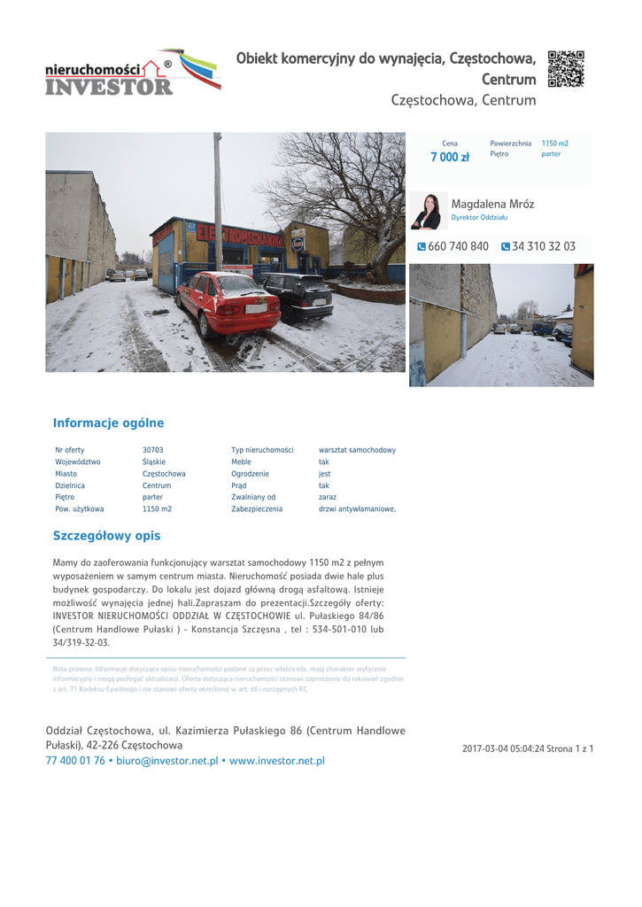 Obiekt komercyjny do wynajęcia, Częstochowa, Centrum Częstochowa, Centrum Cena 7 000 zł Powierzchnia Piętro 1150 m2 parter Magdalena Mróz Dyrektor Oddziału 660 740 840 34 310 32 03 Informacje ogólne Nr oferty 30703 Typ nieruchomości warsztat samochodowy Województwo Śląskie Meble tak Miasto Częstochowa Ogrodzenie jest Dzielnica Centrum Prąd tak Piętro parter Zwalniany od zaraz Pow. użytkowa 1150 m2 Zabezpieczenia drzwi antywłamaniowe, Szczegółowy opis Mamy do zaoferowania funkcjonujący warsztat samochodowy 1150 m2 z pełnym wyposażeniem w samym centrum miasta. Nieruchomość posiada dwie hale plus budynek gospodarczy. Do lokalu jest dojazd główną drogą asfaltową. Istnieje możliwość wynajęcia jednej hali.Zapraszam do prezentacji.Szczegóły oferty: INVESTOR NIERUCHOMOŚCI ODDZIAŁ W CZĘSTOCHOWIE ul. Pułaskiego 84/86 (Centrum Handlowe Pułaski ) - Konstancja Szczęsna , tel : 534-501-010 lub 34/319-32-03. Nota prawna: Informacje dotyczące opisu nieruchomości podane są przez właściciela, mają charakter wyłącznie informacyjny i mogą podlegać aktualizacji. Oferta dotycząca nieruchomości stanowi zaproszenie do rokowań zgodnie z art. 71 Kodeksu Cywilnego i nie stanowi oferty określonej w art. 66 i następnych KC. Oddział Częstochowa, ul. Kazimierza Pułaskiego 86 (Centrum Handlowe Pułaski), 42-226 Częstochowa 77 400 01 76 • [email protected] • www.investor.net.pl 2017-03-04 05:04:24 Strona 1 z 1