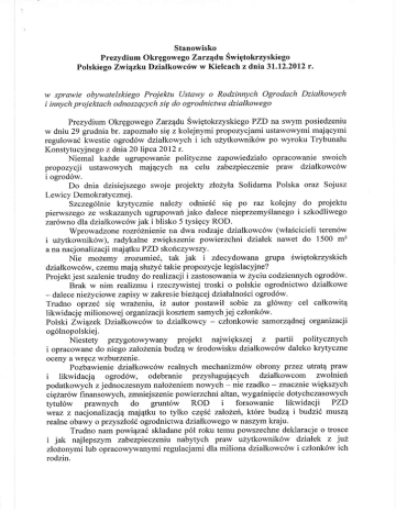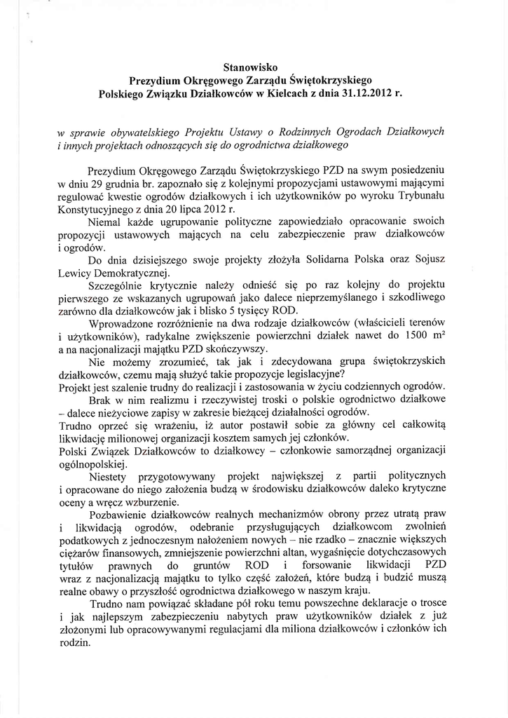 Stanowisko Prezydium Okrggow egoZarz4d u Swigtokrzyskiego Polskiego Zwi4zka Dzialkowc6w w Kielcach z dnia 3L.12.2012r. w sprawie obywatelskiego Projekttt Ustawy o Rodzinnych Ogrodach Dzialkowych i innychprojektach odnoszqcychsig do ogrodnictwa dzialkowego PrezydiumOkrggowegoZaruqduSwigtokrzyskiegoPZD na swym posiedzeniu w dniu 29 grudniabr. zapoznalosig z kolejnymi propozycjamiustawowymi maj4cymi regulowa6 kwestie ogrod6w dzialkowych i ich uzytkownik6w po wyroku Trybunalu Konstytucyjnego z dnia 20 lipca 2012 r. Niemal kaade ugrupowanie polityczne zapowiedziato opracowanie swoich propozycji ustawowych maj4cych na celu zabezpieczenie praw dzialkowc6w i ogrod6w. Do dnia dzisiejszegoswoje projekty zLotyla Solidarna Polska oraz Sojusz Lewicy Demokratycznej. Szczeg6lnie krytycznie nale|y odnies6 sig po raz kolejny do projektu i szkodliwego pierwszegoze wskazanychugruporvaf jako dalecenieprzemySlanego jak ROD. i blisko 5 tysigcy zar6wnodla dzia\kowc6w na dwa rodzaje dzialkowc6w (wlaScicieli teren6w rozr6anietie Wprowadzone i uzytkownik6w), radykalne zwiEk:szeniepowierzchni dziaLeknawet do 1500 m'? a na nacjonalizacji maj4tku PZD skof czywszy. Nie mozemy zrozumiel, tak jak i zdecydowana grupa Swigtokrzyskich dzialkowc6w,czemumaj4 sluzyl talciepropozacjelegislacyjne? Projektjest szalenietrudny do realizacjii zastosowaniaw zyciu codziennychogrod6w. Brak w nim realizmu i rzeczywistej troski o polskie ogrodnictwo dzialkowe - daleceniezyciowe zapisyw zakres;iebieh1cei dzialalnoficiogrod6w. Trudno oprze( sig wraaeni:u, i2 autor postawil sobie za gtr6wny cel calkowit4 likwidacjg milionowej organizacjikosztem samychjej czlonk6w. Polski Zwi1zek Dzialkowc6w to d:ziatkowcy - cztonkowie samorz4dnej organizacii og6lnopolskiej. Niestety przygotowywany projekt najwigkszej z partii politycznych i opracowanedo niego zaloheniabutdz1w Srodowiskudzialkowc6w daleko krytyczne oceny a wrQczw zbutzenie. Pozbawienie dzialkowc6w rr:alnych mechanizm6w obrony przez ttrat4 praw i likwidacj4 ogrod6w, odebranie przysluguj4cych dzialkowcom zwolnieri nowych - nie rzadko - znaczniewigkszych podatkowych zjednoczesnym naLo2,eniem ciqaar6wfinansowych, zmniejszeniepowierzchni altan, wygaSnigciedotychczasowych PZD i forsowanie likwidacji tytut6w prawnych do grunt6w ROD wraz z nacjonalizacj4 maj4tku to l;ylko czESCzaloilen, kt6re budzq i budzid musz4 realne obawy o przyszloS6ogrodnictLwadzialkowegow naszymkraju. Trudno nam powi4za1 sldadanep6l roku temu powszechnedeklaracjeo trosce i jak najlepszym zabezpieczeniu nabytych praw uzytkownik6w dzialek z iuL zloaonymi lub opracowywanymi regulacjami dla miliona dzialkowc6w i czlonk6w ich rodzin. Analiza dotychczasowych propozycji legislacyjnych potwierdza naszym zdaniemjedn4 fundamentaln4kwestig - uwolnienie teren6w ogrod6w dzialkowych. Materialistyczne i inwestycyjne spojrzenie na rodzinne ogrody dzialkowe wybiega dalej niL glos samych dzialkowc6w zatroskanycho swoje prawa i swoje ogrody. W obliczu powylszych zagr<>\efiszczeg6lnegoznaczenianabiera obywatelska inicjatywa ustawodawczaizloilony u MarszalkaSejmuRP Projekt Ustawy o ROD. Dokument wyplywaj4ay ze Srodowiska,kt6re najlepiej zna swoje problemy i specyfikg funkcjonowania ogrod6w. Projekt zabezpieczajEcyprzedewszystkim o96l tytul6w prawnych do grunt6w ogrod6w a tym samym ci4glo56 praw uzytkownikow dzialek. Kompleksowe i szczeg6\,owezasady likwidacji ogrod6w jako przeciwwaga dla zakus6w masowej ich likwidacji. Caly jeden rozdzial Projektu poSwigconyzostal samym dzialkowcom, jako fundamentowi ogrodnictwa dzialkowego. Opracowany Projekt Ustawy poprzedzony konsultacjami o charaktene og6lnopolskim jest kompromisem migdzy oczekiwaniami samorz4d6w - przewahajqcychwlaScicieli teren6w a histori4 i dorobkiem polskich ogrod6w dzialkowych i 115 lat idei ogrodnictwadziatrkowego. Widocznym znakiem poparcia i pelnej aprobaty dla zaproponowanychregulacji obywatelskichniech bgdzie ponad 330 tysigcy podpis6w zlohonychpod Projektem w okresiezaledwie 1,5 miesi4caich zbierunia. O wsparciu inicjatywy obywatelskiej nich Swiadcz4 takle setki list6w skierowanych do wladz centralnych, parlamentarzyst6wi samorz4dowc6w z proib4 o wsparciedla Projektu i jego finalne uchwalenie. Wbrew dotychczasowym propozycjom projekt6w i za\oheh do przepis6w maj4cych regulowa6 ogrodnictwo dzialkowe w naszym kraju wskazac nale|y, iZ Projekt obywatelski jako jedyny (obok projektu SLD) przewiduje zachowanie struktur or ganizacyjny ch. O zachowanie og6lnopolskich struktur wnosz4 sami zainteresowani - dzialkowcy. Sledz4c i obserwuji4c sytuacjg ogrod6w i Zwiqzkl na przestrzeni ostatnichlat nie wyobralaj4 sobie aby mogli by6 pozostawienisami sobie,pozbawieni realnej i silnej reprezentacji.Jak pokazuje miniony czas,tylko jednoSddziatkowc6w posiadaj4cychswoj4 sp6jn4 i zorganizowan?reprezentacjg,uchronila i uchronid mohe dorobek minionych pokoleri uzytkorvnik6w dzialek na kolejne lata. ZaPrczydiumOZSPZD w Kielcach PrezesOZ l-l inz. ZygmuntW6jcik