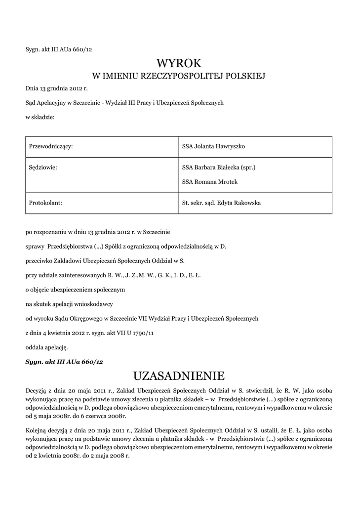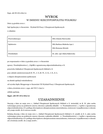 Sygn. akt III AUa 660/12 WYROK W IMIENIU RZECZYPOSPOLITEJ POLSKIEJ Dnia 13 grudnia 2012 r. Sąd Apelacyjny w Szczecinie - Wydział III Pracy i Ubezpieczeń Społecznych w składzie: Przewodniczący: SSA Jolanta Hawryszko Sędziowie: SSA Barbara Białecka (spr.) SSA Romana Mrotek Protokolant: St. sekr. sąd. Edyta Rakowska po rozpoznaniu w dniu 13 grudnia 2012 r. w Szczecinie sprawy Przedsiębiorstwa (...) Spółki z ograniczoną odpowiedzialnością w D. przeciwko Zakładowi Ubezpieczeń Społecznych Oddział w S. przy udziale zainteresowanych R. W., J. Z.,M. W., G. K., I. D., E. Ł. o objęcie ubezpieczeniem społecznym na skutek apelacji wnioskodawcy od wyroku Sądu Okręgowego w Szczecinie VII Wydział Pracy i Ubezpieczeń Społecznych z dnia 4 kwietnia 2012 r. sygn. akt VII U 1790/11 oddala apelację. Sygn. akt III AUa 660/12 UZASADNIENIE Decyzją z dnia 20 maja 2011 r., Zakład Ubezpieczeń Społecznych Oddział w S. stwierdził, że R. W. jako osoba wykonująca pracę na podstawie umowy zlecenia u płatnika składek – w Przedsiębiorstwie (...) spółce z ograniczoną odpowiedzialnością w D. podlega obowiązkowo ubezpieczeniom emerytalnemu, rentowym i wypadkowemu w okresie od 5 maja 2008r. do 6 czerwca 2008r. Kolejną decyzją z dnia 20 maja 2011 r., Zakład Ubezpieczeń Społecznych Oddział w S. ustalił, że E. Ł. jako osoba wykonująca pracę na podstawie umowy zlecenia u płatnika składek - w Przedsiębiorstwie (...) spółce z ograniczoną odpowiedzialnością w D. podlega obowiązkowo ubezpieczeniom emerytalnemu, rentowym i wypadkowemu w okresie od 2 kwietnia 2008r. do 2 maja 2008 r. Decyzjami z dnia 23 maja 2011 r., Zakład Ubezpieczeń Społecznych Oddział w S. stwierdził, że pozostali zainteresowani jako osoby wykonujące pracę na podstawie umowy zlecenia u płatnika składek – w Przedsiębiorstwie (...) spółce z ograniczoną odpowiedzialnością w D. podlegają obowiązkowo ubezpieczeniom emerytalnemu, rentowym i wypadkowemu : I. D. w okresie od 4 maja 2009r. do 30 czerwca 2009r. G. K. w okresie od 16 stycznia 2008r. do 3 marca 2008r., od 31 stycznia 2009r. do 31 stycznia 2009r., od 12 maja 2009r. do 29 maja 2009r., od 1 czerwca 2009r. do 30 czerwca 2009r. M. W. w dniach 8 października 2008r., 28 października 2008r., 15 grudnia 2008r.,i od 12 stycznia 2009r. do 31 grudnia 2009r. J. Z. w okresie od 10 października 2008r. do 30 października 2008r. Uzasadniając powyższe decyzje organ rentowy wskazał, że w wyniku kontroli przeprowadzonej u płatnika ustalono, iż Przedsiębiorstwo (...) spółka z ograniczoną odpowiedzialnością w D. zawarło z zainteresowanymi umowy o dzieło, spełniające w rzeczywistości warunki dotyczące umów zlecenia, które rodziły obowiązek ubezpieczenia zgodnie z art. 13 pkt 2, art. 36 ust. 1, 2 i 4 ustawy z dnia 13 października 1998 r. o systemie ubezpieczeń społecznych. W odwołaniach od powyższych decyzji płatnik, zarzucając organowi rentowemu błędną kwalifikację prawną zawartych umów i w konsekwencji bezpodstawne przyjęcie, że zainteresowani winni być objęci ubezpieczeniem społecznym jako zleceniobiorcy, podczas gdy strony zawarły umowy o dzieło. Podniesiono, że spółka (...) nie jest typową firmą zajmującą się produkcją wyrobów seryjnych, lecz podmiotem produkującym modele, krótkie serie pokazowe. Zdaniem odwołującej istotą umów zawartych z ubezpieczonymi było osiągnięcie przez nie określonego zindywidualizowanego rezultatu, mogącego podlegać ocenie. W odpowiedzi na odwołania organ rentowy wniósł o ich oddalenie w całości oraz o zasądzenie kosztów zastępstwa procesowego według norm przepisanych, podtrzymując argumentację zawartą w uzasadnieniach zaskarżonych decyzji. Wyrokiem z dnia 4 kwietnia 2012 r. Sąd Okręgowy w Szczecinie VII Wydział Pracy i Ubezpieczeń Społecznych oddalił odwołania (punkt I) oraz zasądził od Przedsiębiorstwa (...) spółki z ograniczoną odpowiedzialnością w D. kwotę 360 zł tytułem zwrotu kosztów zastępstwa procesowego na rzecz ZUS (punkt II). Powyższe orzeczenie Sąd Okręgowy oparł o następujące ustalenia faktyczne i rozważania prawne: Przedmiotem działalności Przedsiębiorstwa (...) spółki z ograniczoną odpowiedzialnością w D. jest produkcja, handel i usługi w dziedzinie konfekcji odzieżowej oraz handel artykułami przemysłowymi. Z osobami wykonującymi prace krawieckie, prasowalnicze, naprawcze płatnik zawierał pisemne umowy, określając je mianem umów o dzieło. Przedmiotowe prace wykonywane były najczęściej na terenie zakładu płatnika. Jakość uszytych wyrobów była wyrywkowo kontrolowana przez brygadzistę. Kontrola ta powodowała cofnięcie wyrobu do powtórnego wykonania w przypadku stwierdzenia wadliwego wykonania uszytej rzeczy. Jakość prac związanych z prasowaniem elementów odzieży była weryfikowana w dalszym toku produkcji (szycia). W dniu 5 maja 2008 roku płatnik spółka (...) zawarł z R. W. umowę, której przedmiotem było uszycie zleconej konfekcji w terminie do 6 czerwca 2008 roku. Za wykonanie powyższej pracy przewidziano wynagrodzenie w kwocie 1.000 złotych brutto. W dniach 4 maja 2009 roku, 1 czerwca 2009 roku płatnik spółka (...) zawarł z I. D. umowy, których przedmiotem było uszycie sukienek w terminach kolejno do 31 maja 2009 roku i 30 czerwca 2009 roku. Za wykonanie powyższych prac przewidziano wynagrodzenie w kwocie kolejno 973,43 złotych brutto. 1,168 złotych brutto. Za wykonanie powyższych usług wypłacono I. D. wynagrodzenie zgodnie z przedstawionymi rachunkami: nr 3/05/2009, nr 1/06/2009. W dniach: 16 stycznia 2008r., 31 stycznia 2009r., 12 maja 2009r., 27 maja 2009r., i czerwca 2009r. (dwie umowy) płatnik zawarł z G. K., których przedmiotem było kolejno: uszycie konfekcji, 50 sztuk bluzek, 50 sztuk spodni, szycie spodni, znów uszycie 50 sztuk bluzek w terminach kolejno do: 3 marca 2008 roku, 31 stycznia 2009 roku, 26 maja 2009 roku, 29 maja 2
