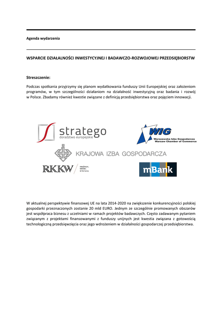 Agenda wydarzenia WSPARCIE DZIAŁALNOŚCI INWESTYCYJNEJ I BADAWCZO-ROZWOJOWEJ PRZEDSIĘBIORSTW Streszczenie: Podczas spotkania przyjrzymy się planom wydatkowania funduszy Unii Europejskiej oraz założeniom programów, w tym szczególności działaniom na działalność inwestycyjną oraz badania i rozwój w Polsce. Zbadamy również kwestie związane z definicją przedsiębiorstwa oraz pojęciem innowacji. W aktualnej perspektywie finansowej UE na lata 2014-2020 na zwiększenie konkurencyjności polskiej gospodarki przeznaczonych zostanie 20 mld EURO. Jednym ze szczególnie promowanych obszarów jest współpraca biznesu z uczelniami w ramach projektów badawczych. Często zadawanym pytaniem związanym z projektami finansowanymi z funduszy unijnych jest kwestia związana z gotowością technologiczną przedsięwzięcia oraz jego wdrożeniem w działalności gospodarczej przedsiębiorstwa. 15 LISTOPADA 2016 r. UL. TRĘBACKA 4, WARSZAWA (siedziba Warszawskiej Izby Gospodarczej) SALA 205 09:30 – 10:00 Rejestracja 10:00 – 10:10 Oficjalne powitanie 10:10 – 10:30 Plany województwa mazowieckiego w zakresie wykorzystania środków UE w 2017 r. Adam Struzik | Marszałek Województwa Mazowieckiego (tbc) 10:30 – 11.00 Oferta Mazowieckiej Jednostki Wdrażania Programów Unijnych dla przedsiębiorstw Mariusz Frankowski | p.o. Dyrektor Mazowieckiej Jednostki Wdrażania Programów Unijnych (tbc) 11:00 – 12:00 Dotacje na prace B+R w latach 2014-2020 Przemysław Gabrysiak | Starszy Konsultant |Stratego 12:00 – 12:15 Przerwa kawowa 12:15 – 13:15 Dofinansowanie projektów inwestycyjnych – aspekty praktyczne Piotr Sękowski | Starszy Konsultant | Stratego 13:15 – 13:45 Rola banku w finansowaniu projektów innowacyjnych Agnieszka Kacprowicz | Ekspert |mBank 13:45 – 14:00 Przygotowanie przedsiębiorstwa do aplikowania o środki unijne Aleksandra Walendziak | Starszy Konsultant | Stratego 14:00 – 14:30 Aspekty prawne procesu inwestycyjnego w kontekście aplikowania o środki UE Aneta Pankowska | Partner |Kancelaria RKKW Kwaśnicki, Wróbel & Partnerzy 14:30 Lunch