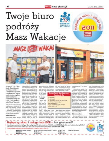 teraz nasz plebiscyt 16 czwartek, 28 lipca 2011 r. FOT. RADEK KOLEŚNIK FOT. RADEK KOLEŚNIK Twoje biuro podróży Masz Wakacje Krzysztof Tuz i Wojciech Stanisławski kochają podróże – zwiedzili naprawdę kawał świata. Swoją pasją postanowili zarazić koszalinian i właśnie dlatego założyli Centrum Podróży Masz Wakacje. Obaj panowie branżę turystyczną znają doskonale. – Od jedenastu lat każdy z nas zajmuje się turystyką – mówi Wojciech Stanisławski. – Sprzedaliśmy tysiące wycieczek zadowolonym klientom, każdą z nich markując własnym nazwiskiem. Co komu w duszy gra Masz ochotę zwiedzić Włochy? Nie byłeś jeszcze w Tropical Islands lub w Dineylandzie? Marzysz o luksusowym hotelu i piciu drinków pod palmami? Może wolisz aktywny wypoczynek: chcesz zobaczyć wiele interesujących miejsc, ponurkować, zasmakować windsurfingu, pożeglować? A może fascynuje cię egzotyka, marzysz o poznaniu Chin, Indii lub Kolumbii? Masz Wakacje z całą pewnością znajdzie dla ciebie najciekawszą ofertę. A jeśli nie znajdzie, to ją „uszyje”. – W naszej bazie są tysiące ofert przeróżnych wycieczek – zapewnia Krzysztof Tuz, współwłaściciel firmy. – Wszystkie są pewne i w znakomitej większości sprawdzone przez nas osobiście, każdy na pewno znajdzie coś interesującego. Bywa jednak, że klient nie ma ochoty na tradycyjną wycieczkę – przyznaje. – Wówczas możemy znaleźć dla niego po- łączenia lotnicze do wybranego jacy ludzie zajmują się najmłodmiejsca, zarezerwować hotel, wy- szymi. Klientom proponujemy jenająć samochód, polecić przewod- dynie takie obozy, na które sami wyników i tak dalej – gwarantuje nasz syłamy własne dzieci – dodaje. rozmówca. – Bo dla nas najważCentrum Podróży Masz Wakacje s.c. niejszy jest klient. Stanisławski, Tuz Dla dzieciaka i starszaka ul. Połczyńska 1 75-802 Koszalin tel. 94 311 58 25; 795 128 108; 608 877 840 e-mail: [email protected] www.maszwakacje.pl czynne: poniedziałek-piątek, godz. 9-17 sobota, godz. 10-14 Oprócz tradycyjnych wycieczek, Masz Wakacje ma w swojej ofercie również obozy i kolonie dla dzieci i młodzieży. – Nasza oferta w tym względzie jest bardzo wyselekcjonowana – podkreśla Tuz. – Znamy osobiście wszystkie ośrodki, w których kwaterowane są dzieci, podobnie kadrę – doskonale wiemy, Masz Wakacje oferuje również kolonie z rodzicami – wyjazdy, podczas których dziecko ma zapewnioną całodobową opiekę wychowawców, ale czas może również spędzać z najbliższymi, którzy zakwaterowani są w tym samym ośrodku. Podobnie sprawa wygląda z wypoczynkiem zimowym – Centrum Podróży proponuje tzw. przedszkola narciarskie. – Są to wyjazdy dla całych rodzin: podczas gdy dorośli szusują po stokach, maluchy mają zajęcia w szkółce narciarskiej, organizowane również są wspólne atrakcje: kuligi, ogniska, dyskoteki. Świetna sprawa – uśmiecha się. – A z racji tego, że dysponujemy najnowocześniejszymi systemami rezerwacji, jesteśmy w stanie zaoferować najniższe ceny na rynku i wśród tysięcy promocji skutecznie wyłuskać te najbardziej korzystne – zapewnia Krzysztof Tuz. Cały świat w zakładce Ogromną siłą Centrum Podróży Masz Wakacje są serwisy interne- towe. – Na naszej stronie można znaleźć wszystko, co podróżnik wiedzieć powinien – podkreśla Stanisławski. – Są tu opisane wszystkie nasze oferty wycieczek, możliwości transportu, rodzaje połączeń lotniczych również z Niemiec – wylicza. – Istnieje również możliwość zaplanowania i zarezerwowania wycieczki przez internet. Na naszej stronie dostępny jest dosłownie cały świat. Jednak na swojej stronie internetowej, prócz kierunków podróży, Masz Wakacje oferuje znacznie więcej. – Znajdą tu Państwo także informacje o apartamentach, którymi dysponujemy, o ubezpieczeniach podróżnych oraz opisy przeróżnych wycieczek, na których byliśmy my, nasi przyjaciele i klienci – informuje Krzysztof Tuz. – Jest tu także wiele interesujących i ważnych porad dla turystów. 6211K01BQ