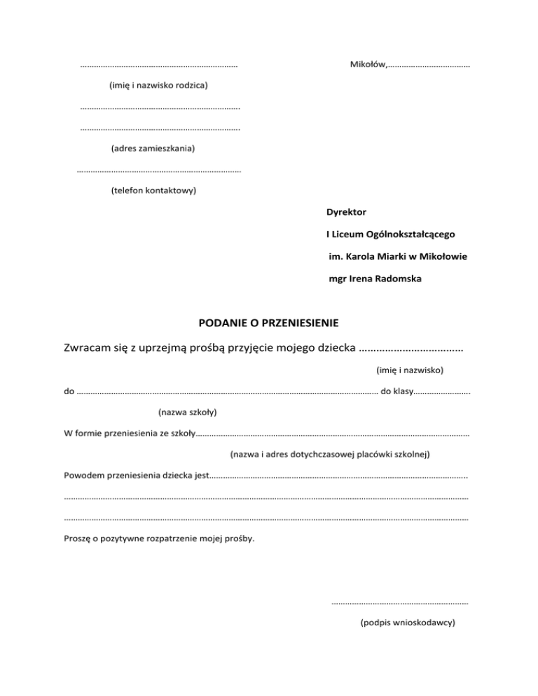 …………………………………………………………… Mikołów,……………………………… (imię i nazwisko rodzica) ……………………………………………………………. ……………………………………………………………. (adres zamieszkania) ……………………………………………………………… (telefon kontaktowy) Dyrektor I Liceum Ogólnokształcącego im. Karola Miarki w Mikołowie mgr Irena Radomska PODANIE O PRZENIESIENIE Zwracam się z uprzejmą prośbą przyjęcie mojego dziecka ……………………………… (imię i nazwisko) do …………………………………………………………………………………………………………………… do klasy……………………. (nazwa szkoły) W formie przeniesienia ze szkoły………………………………………………………………………………………………………… (nazwa i adres dotychczasowej placówki szkolnej) Powodem przeniesienia dziecka jest………………………………………………………………………………………………….. …………………………………………………………………………………………………………………………………………………………… …………………………………………………………………………………………………………………………………………………………… Proszę o pozytywne rozpatrzenie mojej prośby. …………………………………………………… (podpis wnioskodawcy) …………………………………………………………… Mikołów,……………………………… (imię i nazwisko rodzica) ……………………………………………………………. ……………………………………………………………. (adres zamieszkania) ……………………………………………………………… (telefon kontaktowy) Dyrektor I Liceum Ogólnokształcącego im. Karola Miarki w Mikołowie mgr Irena Radomska PODANIE O PRZENIESIENIE Zwracam się z uprzejmą prośbą o przeniesienie mojego dziecka ……………………… (imię i nazwisko) z klasy o profilu ……………………………… do klasy o profilu…………………………………… Powodem przeniesienia dziecka jest………………………………………………………………… ………………………………………………………………………………………………………………………… ………………………………………………………………………………………………………………………… Proszę o pozytywne rozpatrzenie mojej prośby. …………………………………………………… (podpis wnioskodawcy)