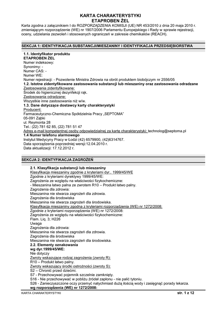KARTA CHARAKTERYSTYKI ETAPROBEN ŻEL Karta zgodna z załącznikiem I do ROZPORZĄDZENIA KOMISJI (UE) NR 453/2010 z dnia 20 maja 2010 r. zmieniającym rozporządzenie (WE) nr 1907/2006 Parlamentu Europejskiego i Rady w sprawie rejestracji, oceny, udzielania zezwoleń i stosowanych ograniczeń w zakresie chemikaliów (REACH). SEKCJA 1: IDENTYFIKACJA SUBSTANCJI/MIESZANINY I IDENTYFIKACJA PRZEDSIĘBIORSTWA 1.1. Identyfikator produktu ETAPROBEN ŻEL Numer indeksowy: Synonimy: Numer CAS: Numer WE: Numer rejestracji: - Pozwolenie Ministra Zdrowia na obrót produktem biobójczym nr 2556/05 1.2. Istotne zidentyfikowane zastosowania substancji lub mieszaniny oraz zastosowania odradzane Zastosowania zidentyfikowane: Środek do higienicznej dezynfekcji rąk. Zastosowania odradzane: Wszystkie inne zastosowania niż w/w. 1.3. Dane dotyczące dostawcy karty charakterystyki Producent: Farmaceutyczno-Chemiczna Spółdzielnia Pracy „SEPTOMA” 05-091 Ząbki ul. Reymonta 28 Tel.: (22) 781 62 85, (22) 781 51 47 Adres e-mail kompetentnej osoby odpowiedzialnej za kartę charakterystyki: [email protected] 1.4 Numer telefonu alarmowego Instytut Medycyny Pracy w Łodzi (42) 6579900, (42)6314767. Data sporządzenia poprzedniej wersji:12.04.2010 r. Data aktualizacji: 17.12.2012 r. SEKCJA 2: IDENTYFIKACJA ZAGROŻEŃ 2.1. Klasyfikacja substancji lub mieszaniny Klasyfikacja mieszaniny zgodnie z kryteriami dyr.. 1999/45/WE Zgodnie z kryteriami dyrektywy 1999/45/WE: Zagrożenia ze względu na właściwości fizykochemiczne: - Mieszanina łatwo palna ze zwrotem R10 – Produkt łatwo palny. Zagrożenia dla zdrowia: Mieszanina nie stwarza zagrożeń dla zdrowia. Zagrożenia dla środowiska Mieszanina nie stwarza zagrożeń dla środowiska. Klasyfikacja mieszaniny zgodna z kryteriami rozporządzenia (WE) nr 1272/2008: Zgodnie z kryteriami rozporządzenia (WE) nr 1272/2008: Zagrożenia ze względu na właściwości fizykochemiczne: Flam. Liq. 3; H226 Uwaga Zagrożenia dla zdrowia: Mieszanina nie stwarza zagrożeń dla zdrowia. Zagrożenia dla środowiska Mieszanina nie stwarza zagrożeń dla środowiska. 2.2. Elementy oznakowania wg dyr.1999/45/WE: Nie dotyczy Zwroty wskazujące rodzaj zagrożenia (zwroty R): R10 – Produkt łatwo palny. Zwroty wskazujący środki ostrożności (zwroty S): S2 – Chronić przed dziećmi. S7 - Przechowywać pojemnik szczelnie zamknięty. S16 - Nie przechowywać w pobliżu źródeł zapłonu - nie palić tytoniu. S26 - Zanieczyszczone oczy przemyć natychmiast dużą ilością wody i zasięgnąć porady lekarza. wg rozporządzenia (WE) nr 1272/2008: KARTA CHARAKTERYSTYKI str. 1 z 12 KARTA CHARAKTERYSTYKI ETAPROBEN ŻEL Karta zgodna z załącznikiem I do ROZPORZĄDZENIA KOMISJI (UE) NR 453/2010 z dnia 20 maja 2010 r. zmieniającym rozporządzenie (WE) nr 1907/2006 Parlamentu Europejskiego i Rady w sprawie rejestracji, oceny, udzielania zezwoleń i stosowanych ograniczeń w zakresie chemikaliów (REACH). SEKCJA 2: IDENTYFIKACJA ZAGROŻEŃ Flam. Liq. 3 Uwaga Zwroty wskazujące rodzaj zagrożenia (zwroty H): H226 - Łatwopalna ciecz i pary. Zwroty wskazujące środki ostrożności (zwroty P): P102 - Chronić przed dziećmi. P210 – Przechowywać z dala od źródeł ciepła/iskrzenia/otwartego ognia/gorących powierzchni. Palenie wzbronione. P233 - Przechowywać pojemnik szczelnie zamknięty.. P280 – Stosować rękawice ochronne/ochronę oczu/ochronę twarzy. P305 + P351 + P338 - W PRZYPADKU DOSTANIA SIĘ DO OCZU: Ostrożnie płukać wodą przez kilka minut. Wyjąć soczewki kontaktowe, jeżeli są i można je łatwo usunąć. Nadal płukać. P313- Zasięgnąć porady/zgłosić się pod opiekę lekarza. 2.3. Rezultaty oceny PBT i vPvB. Nie ma danych. Informacje dodatkowe: Zanieczyszczone oczy przemyć natychmiast dużą ilością wody i zasięgnąć porady lekarza. W przypadku rozlania zmyć dużą ilością wody SEKCJA 3: SKŁAD/INFORMACJA O SKŁADNIKACH 3.1. Substancje Nie dotyczy 3.2. Mieszaniny Alkohol etylowy Zawartość: 52% Numer indeksowy: 603-002-00-5 Numer CAS: 64-17-5 Numer WE: 200-578-6 Numer rejestracji: Klasyfikacja zgodna z kryteriami dyr. 67/548/WE: F; R11 Klasyfikacja zgodna z kryteriami rozporządzenia (WE) 1272/2008 Flam. Liq. 2; H225 Niebezpieczeństwo Alkohol izopropylowy Zawartość: 10% Numer indeksowy: 603-117-00-0 Numer CAS: 67-63-1 Numer WE: 200-661-7 Numer rejestracji: Klasyfikacja zgodna z kryteriami dyr. 67/548/WE: KARTA CHARAKTERYSTYKI str. 2 z 12 KARTA CHARAKTERYSTYKI ETAPROBEN ŻEL Karta zgodna z załącznikiem I do ROZPORZĄDZENIA KOMISJI (UE) NR 453/2010 z dnia 20 maja 2010 r. zmieniającym rozporządzenie (WE) nr 1907/2006 Parlamentu Europejskiego i Rady w sprawie rejestracji, oceny, udzielania zezwoleń i stosowanych ograniczeń w zakresie chemikaliów (REACH). SEKCJA 3: SKŁAD/INFORMACJA O SKŁADNIKACH F; R11 Xi; R36 R67 Klasyfikacja zgodna z kryteriami rozporządzenia (WE) 1272/2008 Flam. Liq. 2; H225 Niebezpieczeństwo Alkohol benzylowy Zawartość: 1% Numer indeksowy: 603-057-00-5 Numer CAS: 100-51-6 Numer WE: 202-859-9 Numer rejestracji: Klasyfikacja zgodna z kryteriami dyr. 67/548/WE: Eye Irrit. 2; H319 STOT SE 3; H336 Xn; R20/22 Klasyfikacja zgodna z kryteriami rozporządzenia (WE) 1272/2008: Acute Tox. 4(*); H332 Acute Tox. 4(*); H302 Uwaga Gliceryna Zawartość: 3% Numer indeksowy: Numer CAS: 56-81-5 Numer WE: 200-289-5 Numer rejestracji: Klasyfikacja zgodna z kryteriami dyr. 67/548/WE: Substancja nie sklasyfikowana jako niebezpieczna wg kryteriów tej dyrektywy. Klasyfikacja zgodna z kryteriami rozporządzenia (WE) 1272/2008: Substancja nie sklasyfikowana jako niebezpieczna wg kryteriów tego rozporządzenia. W sekcji 16 zamieszczono znaczenie zwrotów H i R. SEKCJA 4: ŚRODKI PIERWSZEJ POMOCY 4.1. Opis środków pierwszej pomocy Wdychanie W przypadku wystąpienia bólów i zawrotów głowy, osobę poszkodowaną wyprowadzić na świeżę powietrze. Zapewnić ciepło i spokój. Zasięgnąć porady lekarza w razie potrzeby. Kontakt ze skórą Prod
