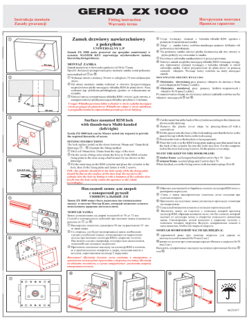 GERDA Z X 1000 Instrukcja montażu Zasady gwarancji Fitting instruction Warranty terms Zamek drzwiowy nawierzchniowy z pokrętłem UNIWERSALNY L/P Zamek ZX 1000 może pracować (na specjalne zamówienie) w systemie MASTER KEY zapewniając użytkownikowi żądaną hierarchię dostępu klucza. MONTAŻ ZAMKA Z am ek m ontow ać w drzw iach o grubości o d 3 8 d o 72 mm . Sposób i kolejność postępow ania przy m ontażu zam ka został pokazany na rysunkach od © do © . © W ykonać otw ór o średnicy 30 m m w odległości 55 m m od kraw ędzi drzwi. © O d strony m ontażu zam ka w ykonać w otw orze fazęp o zw alającą n a przyłożenie płytki m ocującej w k ład k ę R IM do p łata drzwi. F azę w ykonać (np. pilnikiem półokrągłym ) zgodnie ze w skazaniam i na rysunku. © N ałożyć tarczę zew n ętrzn ąn a w kładkę R IM i w łożyć ją d o otw oru, a następnie nałożyć p ły tk ęm o c u jącą w k ład k ęip rz y k ręcić 2 śrubami. H H C T pyK U H H M O H T a ^ a n p a n n n a rap aH T n n © U ciąć w ystający elem ent z bębenka w kładki R IM zgodnie z podanym w ym iarem na rysunku. © Zdjąć z zam ka listw y ozdobno-m askujące poprzez delikatne ich podw ażenie śrubokrętem . © N a podstaw ę zam ka założyć pły tk ę dystansow ą tak aby otw ory w płytce pokryły się z otw oram i w zamku. © S zczelin ęw zabieraku zam ka u staw ić w p o zy c ji poziom ej. © N ałożyć zam ek na pły tk ę m o cu jącą w k ład k ę R IM zw racając uw agę, aby w prow adzić elem ent w ystający z bębenka w kładki w otw ór zabieraka zamka. C ałość przym ocow ać do p łata drzw i za po m o cą czterech wkrętów . W cisnąć listw y ozdobne n a śruby m ocujące zamek. MOCOW ANIE OBEJM Y RYGLI DO: © Ościeżnicy drewnianej przy pom ocy w krętów do drew na z łbem sześciokątnym 8 x 7 0 m m (2 sztuki). © Ościeżnicy metalowej przy pom ocy k ołków rozporow ych i w krętów 8x70 m m (2 sztuki). P o zam ocow aniu obejm y do ościeżnicy nałożyć nakładki ozdobne n a łby w krętów m ocujących © lub © . Uwaga! Wkładka powinna lekko wchodzić w otwór a płytka mocująca równo przylegać do płata drzwi. Wkładki nie wbijać w otwór młotkiem, w przypadku trudności odpowiednio powiększyć otwór lubfazę. Surface mounted RIM lock with thumb-turn Multi-handed (left/right) Gerda ZX 1000 lock can be Master suited (on request) to provide the required hierarchy of access. FITTING INSTRUCTIONS The lock surface install on the doors betw een 38m m end 72m m thick. D raw ings © - © illustrate the fitting m ethod. © D rill a 0 30m m hole 55m m from the edge o f the door. 0,5-2,5 mm ____ U P © O n the inside (fitting side) rebate the h ole to fit the R IM cylinder fixing plate to the door using a half-round file (as show n on the drawing). © F it the outer ring on the R IM cylinder and place the cylinder in the hole, then fit the fixing plate and fasten it w ith 2 screws. © C u tth e m etal bar atth e back o fth e cylinder according to the dim ension show n on the drawing. © R em ove the plastic cover strips by praising th em o ff w ith a screwdriver. © F itth e sp acero n to th e base o fth e lo ck m ak in g s u re th a tth e holes in th e spacer line u p w ith the holes in the lock casing. © P osition the lock so th e keyhole is facing upw ards. © Place the lock ov er the R IM fixing plate m aking sure that m etal b ar at the b ack o f the cylinder fits into the lock's key hole. F ix the com plete lo c k to the door leafu sin g 4 screws. F it the plastic cover strips. TO FIT THE KEEP TO THE DOOR FRAME: © timberframe u se h ex ag o n h e ad tim b erscrew s 8 g x 7 0 2pcs. © armour frame use raw l plugs an d 2 screw s 8g x 70. W hen finished, co v erth e fixing screw s w ith d ecorativeplugs © or ©. (NB.: the cylinder shouldfit in the hole easily while the fixingplate should lie fla t on the surface o f the door leaf. Do not force the cylinder into the hole by hitting it with a hammer, i f the cylinder does not f i t into the hole easily widen the aperture or the rebate accordingly.) H a K ^ a ^ H O H ęaM O K ^ h ^B epen C nOBOpOTHOH pyH K O H YHHBEPCA^bHMH ^ \n 3aMOK ZX 1000 MO^eT ó m t ł Bbi no.iHeH (nO cneuH&ntHOMy 3aKa3y) b CHCTeMe MacTep K ^ w h , KOTOpbrn no3BO.3HeT K^neHTy ncnO.ib3OBaTb npapxnro aocryna KAMHa. MOHTA^ 3AMKA 3aMOK ycTaHaBHHBaTt Ha ^Bepax toh^ hhoh ot 38 £ 0 72 mm . CnocoS h noouepe^HOCTb ^encTBHH npH MOHTa^e 3aMKa noKa3aHa Ha pHcyHKe OT © £0 © . © BmcBepnHTb OTBeTCTHe £HaMeTpoM 30 mm Ha paccToaHHH 55 mm ot Kpaa £BepH. © C o ciopoHbi, r£e SyąeT MOHTHpoBartca 3aM0K HeoSxo£HM0 c ^ e n a rt yrnySneHHe (na3bi), no3Bonarorn;He Ha 3aKpenneHHe Kontu;a npH MOHTa^e UHnHH^pa R IM k ^BepHOMy nonoTHy. n a 3 mo^ ho c ^ e n a rt (HanpHMep, nonyKpyraMM HanHntHHKOM, ho^ obkoh) KaK n0Ka3aH0 Ha pHcyHKe. © npH no^H Tt BHemHroro HaKna^Ky Ha uHnHH^p R IM h Bno^HTt ee b npHroroBneHHoe OTBepcTHe b £BepH, coe^HHaa BMecTe c KontuoM, yKpennara^HM HHnHH^p 2 mypynaMH. BnuMOHue! ^uMUH^p donw en nezKo exoóumb e omeepcmue, a Kpenewnoe Konbąopoeno npuneeamb k deepnoMy nonomny. ^unuH ^p ne eóueamb MonomKoM, e cnyuae ęamp^dnenua yeenuuumb rnupuny omeepcmua unu na3a. © 0 6 p e3 arb BMCTara^HH H3 SapaSaHa sneM enr uHnHH^pa R IM tohho c pa3MepaMH Ha pncyHKe. © C hstb c 3aMKa MacKHpoBOHHbie nnacraHbi nerKO noflfleBaa npn nOMOfflH OTBepTKH. © npHno^HTb Ha no^CTaBKy 3aMKa ^HCTacoByra npoKna^Ky coBMernąa HX OTBepCTHHMH. © CyBanbHMH MexaHH3M yCTaBHTb B n03HHHH ropH3OHTanbHOH. © H ano^H Tt 3aM0K Ha nnacTHHy c noMorn;tro Koropon KpeneTca UHnHH^p RIM , oSparn;aa BHHMaHHe Ha to , hto S m sneMeHT, KoropMH BMCTaeT H3 UHnHH^pa no n an b OTBepcTHe cyBantHoro MexaHH3Ma 3aMKa. CMOHTHpoBaTt uenMH KOMnneKT k ^BepHOMy nonoTHy c noMorn;tro ueTMpex mypynoB. BcyHyTt ^eKopaTHBHMe nnaHKH b na3M 3aMKa TaK, htoS m ohh 3aKpmnH mypynm. MOHTA^ BO3BPATHOH HACTH qH.THH£PA K: © ^epeBaHHOH paMe npH noMO^H mypynoB £ n a £epeBa co mecTHyrontHOH mnanKOH 
