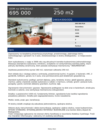 DOM na SPRZEDAŻ 695 000 Łapy 250 m2 2465/4300/ODS 695 000 PLN Secondary Brick 1426 2006 2 5 Perfect Opis Zapraszamy na bezpłatną prezentację przytulnego, przestronnego, piętrowego domu wolnostojącego z garażem na 3 auta, zlokalizowanego w okolicy Białegostoku - w miejscowości Łapy. Dom wybudowany z cegły w 2006 roku wg aktualnych trendów budownictwa jednorodzinnego. Elewacja zewnętrzna wykonana z klinkieru, ocieplenie 12-centymetrową warstwą.wełny. Dach pokryty dachówką ceramiczną. Dom posiada wentylacje mechaniczną " REKUPERATOR". Użytkowa powierzchnia wynosi 182 m2, natomiast całkowita 250 m2. Dom składa się z: dużego salonu z antresolą, przestronnej kuchni, 4 sypialni, 2 łazienek z WC, 2 garderób, kotłowni, garażu na 3 auta, oraz pomieszczenia pod działalność gospodarczą. Standard wykończenia: podłogi: parkiet dębowy, gres, terakota; ściany: gładź gipsowa, glazura, marmur, jedna z łazienek została wykonana w całości z marmuru, schody: granit i poręcze kute, parapety: granit, kominek obłożony granitem, kuchnia: dąb. Ogrzewanie nieruchomości: gazowe. Ogrzewanie podłogowe na dole oraz w łazienkach, atrakcyjny kominek w salonie, oraz wentylacja mechaniczna (rekuperator). Działka: o powierzchni 1426 m2, fundamenty klinkier, ogrodzenie kute (wzdłuż ogrodzenia posadzony jałowiec). Działka jest zagospodarowana, liczne nasadzenia. Media: woda, prąd, gaz, kanalizacja. W okolicy działki znajduje się zabudowa jednorodzinna, spokojna okolica. Główne atuty nieruchomości: dobra komunikacja, spokojna i piękna okolica, nowe budownictwo, WYSOKI STANDARD, WYSOKIEJ JAKOŚCI MATERIAŁY BUDOWLANE oraz bardzo dobry dojazd do Białegostoku. Treść niniejszego ogłoszenia nie stanowi oferty handlowej w rozumieniu Kodeksu Cywilnego. Treść ma charakter informacyjny i zalecamy ich osobistą weryfikację. Dobry Dom Dobry Dom tel. 690 692 915 email: [email protected] Dobry Dom Powered by TCPDF (www.tcpdf.org)