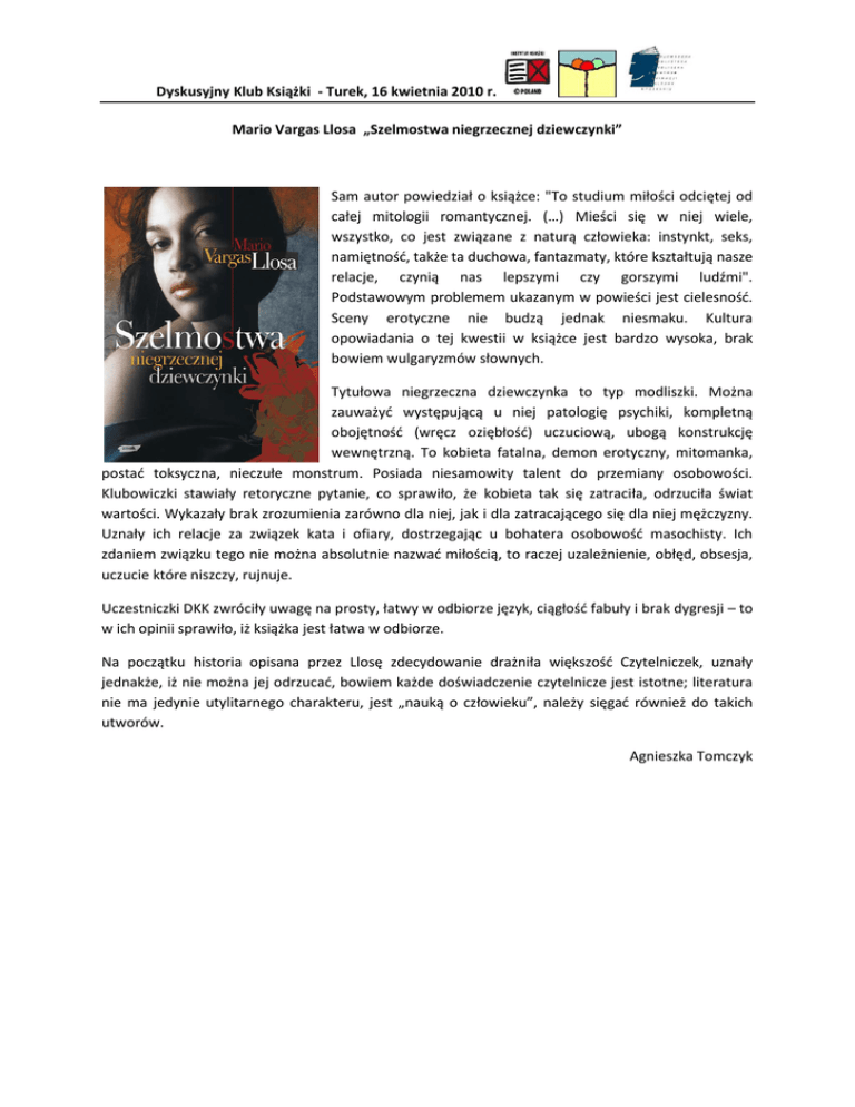 Dyskusyjny Klub Książki - Turek, 16 kwietnia 2010 r. Mario Vargas Llosa „Szelmostwa niegrzecznej dziewczynki” Sam autor powiedział o książce: "To studium miłości odciętej od całej mitologii romantycznej. (…) Mieści się w niej wiele, wszystko, co jest związane z naturą człowieka: instynkt, seks, namiętność, także ta duchowa, fantazmaty, które kształtują nasze relacje, czynią nas lepszymi czy gorszymi ludźmi". Podstawowym problemem ukazanym w powieści jest cielesność. Sceny erotyczne nie budzą jednak niesmaku. Kultura opowiadania o tej kwestii w książce jest bardzo wysoka, brak bowiem wulgaryzmów słownych. Tytułowa niegrzeczna dziewczynka to typ modliszki. Można zauważyć występującą u niej patologię psychiki, kompletną obojętność (wręcz oziębłość) uczuciową, ubogą konstrukcję wewnętrzną. To kobieta fatalna, demon erotyczny, mitomanka, postać toksyczna, nieczułe monstrum. Posiada niesamowity talent do przemiany osobowości. Klubowiczki stawiały retoryczne pytanie, co sprawiło, że kobieta tak się zatraciła, odrzuciła świat wartości. Wykazały brak zrozumienia zarówno dla niej, jak i dla zatracającego się dla niej mężczyzny. Uznały ich relacje za związek kata i ofiary, dostrzegając u bohatera osobowość masochisty. Ich zdaniem związku tego nie można absolutnie nazwać miłością, to raczej uzależnienie, obłęd, obsesja, uczucie które niszczy, rujnuje. Uczestniczki DKK zwróciły uwagę na prosty, łatwy w odbiorze język, ciągłość fabuły i brak dygresji – to w ich opinii sprawiło, iż książka jest łatwa w odbiorze. Na początku historia opisana przez Llosę zdecydowanie drażniła większość Czytelniczek, uznały jednakże, iż nie można jej odrzucać, bowiem każde doświadczenie czytelnicze jest istotne; literatura nie ma jedynie utylitarnego charakteru, jest „nauką o człowieku”, należy sięgać również do takich utworów. Agnieszka Tomczyk