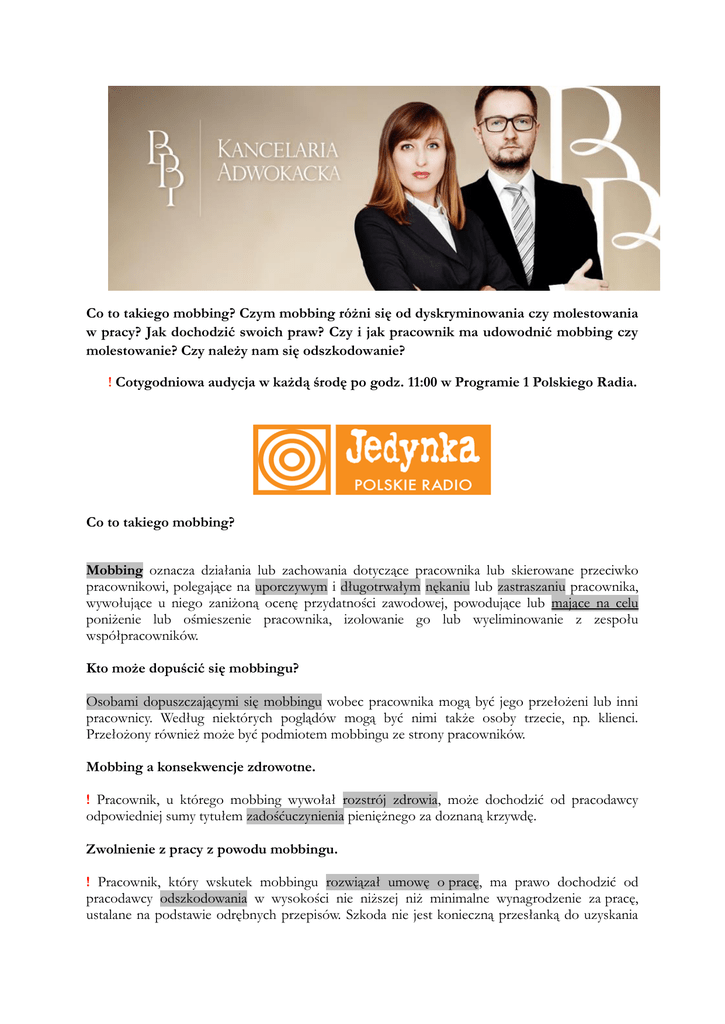 Co to takiego mobbing? Czym mobbing różni się od dyskryminowania czy molestowania w pracy? Jak dochodzić swoich praw? Czy i jak pracownik ma udowodnić mobbing czy molestowanie? Czy należy nam się odszkodowanie? ! Cotygodniowa audycja w każdą środę po godz. 11:00 w Programie 1 Polskiego Radia. Co to takiego mobbing? Mobbing oznacza działania lub zachowania dotyczące pracownika lub skierowane przeciwko pracownikowi, polegające na uporczywym i długotrwałym nękaniu lub zastraszaniu pracownika, wywołujące u niego zaniżoną ocenę przydatności zawodowej, powodujące lub mające na celu poniżenie lub ośmieszenie pracownika, izolowanie go lub wyeliminowanie z zespołu współpracowników. Kto może dopuścić się mobbingu? Osobami dopuszczającymi się mobbingu wobec pracownika mogą być jego przełożeni lub inni pracownicy. Według niektórych poglądów mogą być nimi także osoby trzecie, np. klienci. Przełożony również może być podmiotem mobbingu ze strony pracowników. Mobbing a konsekwencje zdrowotne. ! Pracownik, u którego mobbing wywołał rozstrój zdrowia, może dochodzić od pracodawcy odpowiedniej sumy tytułem zadośćuczynienia pieniężnego za doznaną krzywdę. Zwolnienie z pracy z powodu mobbingu. ! Pracownik, który wskutek mobbingu rozwiązał umowę o pracę, ma prawo dochodzić od pracodawcy odszkodowania w wysokości nie niższej niż minimalne wynagrodzenie za pracę, ustalane na podstawie odrębnych przepisów. Szkoda nie jest konieczną przesłanką do uzyskania odszkodowania. Nierozwiązanie przez pracownika umowy o pracę na podstawie przepisów o mobbingu nie stanowi przeszkody do dochodzenia roszczeń o odszkodowanie z tego tytułu mobbingu na podstawie przepisów kodeksu cywilnego. Oświadczenie pracownika o rozwiązaniu umowy o pracę powinno nastąpić na piśmie z podaniem przyczyny, uzasadniającej rozwiązanie umowy. Niezachowanie tej formy nie powoduje nieważności rozwiązania umowy, bo żaden przepis nie wprowadza tej sankcji. Jest to więc wymóg formy dla celów dowodowych. Ustawowe przesłanki mobbingu muszą być spełnione łącznie i powinny być wykazane przez pracownika. Na pracowniku spoczywa też ciężar udowodnienia, że wynikiem nękania był rozstrój zdrowia. Kodeks nie określa terminu złożenia oświadczenia woli przez pracownika. Co to takiego dyskryminacja w pracy? Z dyskryminacją w pracy mamy do czynienia gdy pracownicy są różnicowani bez uzasadnienia w zakresie: nawiązania i rozwiązania stosunku pracy, warunków zatrudnienia, awansowania oraz dostępu do szkolenia w celu podnoszenia kwalifikacji zawodowych, zatrudniania na czas określony lub nieokreślony albo w pełnym lub w niepełnym wymiarze czasu pracy, w szczególności ze względu na: płeć, wiek, niepełnosprawność, rasę, religię, narodowość, przekonania polityczne, przynależność związkową, pochodzenie etniczne, wyznanie, orientację seksualną. Kiedy pracodawca nie narusza zasad równego traktowania? Za naruszenie zasady równego traktowania w zatrudnieniu, którego skutkiem jest m.in. odmowa nawiązania lub rozwiązanie stosunku pracy, niekorzystne ukształtowanie wynagrodzenia za pracę lub innych warunków zatrudnienia albo pominięcie przy awansowaniu lub przyznawaniu innych świadczeń związanych z pracą pominięcie przy typowaniu do udziału w szkoleniach podnoszących kwalifikacje zawodowe nie jest traktowana sytuacja gdy pracodawca udowodni, że kierował się obiektywnymi powodami. Dlatego że, za zasad równego traktowania w zatrudnieniu nie naruszają działania, proporcjonalne do osiągnięcia zgodnego z prawem celu różnicowania sytuacji pracownika, polegające na: niezatrudnianiu pracownika, jeżeli rodzaj pracy lub warunki jej wykonywania powodują, że przyczyna lub przyczyny są rzeczywistym i decydującym wymaganiem zawodowym stawianym pracownikowi; wypowiedzeniu pracownikowi warunków zatrudnienia w zakresie wymiaru czasu pracy, jeżeli jest to uzasadnione np. złą sytuacją finansową pracodawcy; stosowaniu środków, które różnicują sytuację prawną pracownika, ze względu na ochronę rodzicielstwa lub niepełnosprawność; stosowaniu kryterium stażu pracy przy ustalaniu warunków zatrudniania i zwalniania pracowników, zasad wynagradzania i awansowania oraz dostępu do szkolenia w celu podnoszenia kwalifikacji zawodowych, co uzasadnia odmienne traktowanie pracowników ze względu na wiek. Jakie zachowania to molestowanie? Molestowaniem jest każde niepożądane zachowanie o charakterze seksualnym lub odnoszące się do płci pracownika, którego celem lub skutkiem jest naruszenie godności pracownika, w szczególności stworzenie wobec niego zastraszającej, wrogiej, poniżającej, upokarzającej lub uwłaczającej atmosfery; na zachowanie to mogą się składać fizyczne, werbalne lub pozawerbalne elementy.