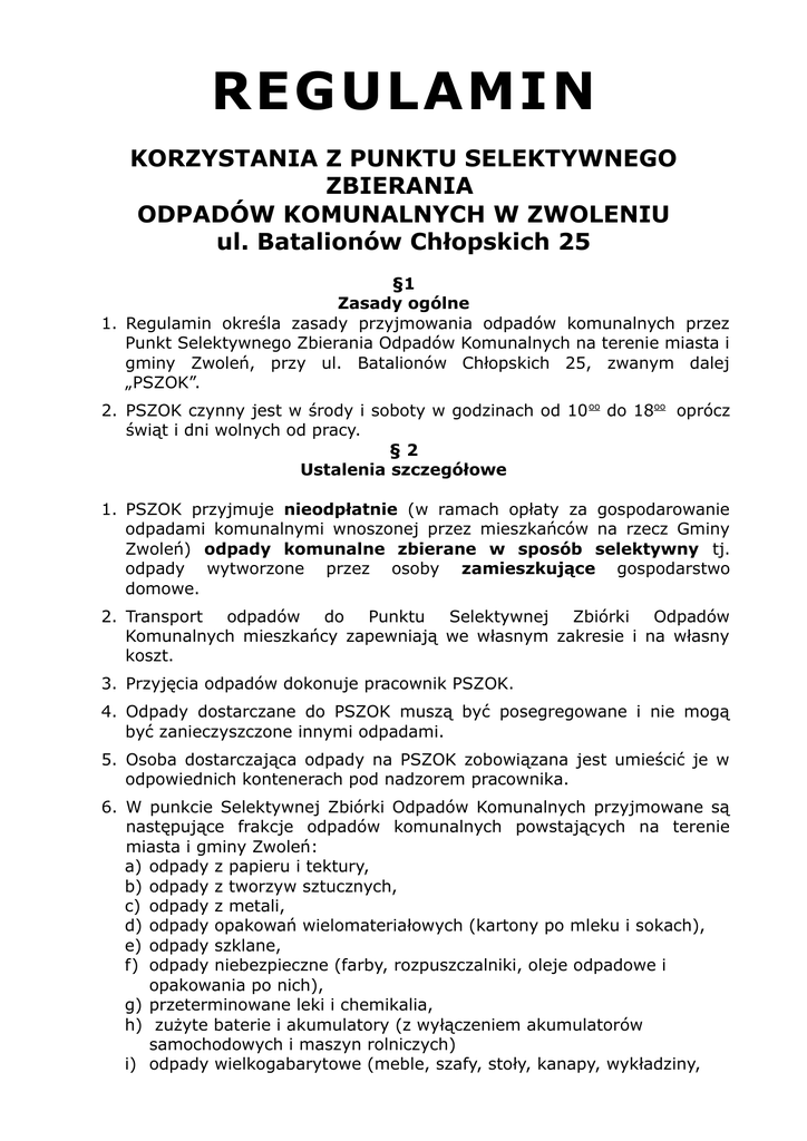 REGULAMIN KORZYSTANIA Z PUNKTU SELEKTYWNEGO ZBIERANIA ODPADÓW KOMUNALNYCH W ZWOLENIU ul. Batalionów Chłopskich 25 §1 Zasady ogólne 1. Regulamin określa zasady przyjmowania odpadów komunalnych przez Punkt Selektywnego Zbierania Odpadów Komunalnych na terenie miasta i gminy Zwoleń, przy ul. Batalionów Chłopskich 25, zwanym dalej „PSZOK”. 2. PSZOK czynny jest w środy i soboty w godzinach od 10 oo do 18oo oprócz świąt i dni wolnych od pracy. §2 Ustalenia szczegółowe 1. PSZOK przyjmuje nieodpłatnie (w ramach opłaty za gospodarowanie odpadami komunalnymi wnoszonej przez mieszkańców na rzecz Gminy Zwoleń) odpady komunalne zbierane w sposób selektywny tj. odpady wytworzone przez osoby zamieszkujące gospodarstwo domowe. 2. Transport odpadów do Punktu Selektywnej Zbiórki Odpadów Komunalnych mieszkańcy zapewniają we własnym zakresie i na własny koszt. 3. Przyjęcia odpadów dokonuje pracownik PSZOK. 4. Odpady dostarczane do PSZOK muszą być posegregowane i nie mogą być zanieczyszczone innymi odpadami. 5. Osoba dostarczająca odpady na PSZOK zobowiązana jest umieścić je w odpowiednich kontenerach pod nadzorem pracownika. 6. W punkcie Selektywnej Zbiórki Odpadów Komunalnych przyjmowane są następujące frakcje odpadów komunalnych powstających na terenie miasta i gminy Zwoleń: a) odpady z papieru i tektury, b) odpady z tworzyw sztucznych, c) odpady z metali, d) odpady opakowań wielomateriałowych (kartony po mleku i sokach), e) odpady szklane, f) odpady niebezpieczne (farby, rozpuszczalniki, oleje odpadowe i opakowania po nich), g) przeterminowane leki i chemikalia, h) zużyte baterie i akumulatory (z wyłączeniem akumulatorów samochodowych i maszyn rolniczych) i) odpady wielkogabarytowe (meble, szafy, stoły, kanapy, wykładziny, dywany, krzesła, fotele itp.) j) zużyty sprzęt elektryczny i elektroniczny (sprzęt RTV i AGD), k) komunalne odpady budowlane i rozbiórkowe (powstałe w wyniku prowadzenia drobnych robót nie wymagających pozwolenia na budowę ani zgłoszenia zamiaru prowadzenia robót do starosty) za wyjątkiem odpadów zawierających azbest (np. eternit), papę, smołę l) zużyte opony – pochodzące z pojazdów użytkowanych w gospodarstwie domowym tj. z samochodów osobowych, motocykli, motorowerów, rowerów, wózków rowerowych i inwalidzkich oraz przyczep do tych pojazdów, m)odpady zielone. 7. Do PSZOK nie będą przyjmowane następujące rodzaje odpadów: a) materiały izolacyjne: papa, styropian budowlany (np. z ociepleń budynków), wełna mineralna, b) zmieszane odpady komunalne, c) części samochodowe, d) szkło okienne i zbrojone, 8. Prowadzący PSZOK odmówi przyjęcia odpadów niespełniających wymogów niniejszego regulaminu, w szczególności: a) odpadów dostarczonych w sposób nieselektywny, b) odpadów pochodzących od podmiotów prowadzących działalność, świadczących usługi w zakresie budowy, rozbiórki, remontu obiektów, c) odpadów zielonych, które z uwagi na skład lub stan, nie nadają się do kompostowania, d) odpadów zużytych opon pochodzących z pojazdów innych niż wymienione w pkt. 7 l, 9. W przypadku odmowy przyjęcia odpadów, osoba dostarczająca odpady jest zobowiązana do ich natychmiastowego zabrania oraz zagospodarowania w sposób zgodny z wymogami przepisów ochrony środowiska. 10. Obsługa PSZOK nie wyjmuje przywiezionych odpadów z pojazdu, wskazuje osobie dostarczającej odpady miejsce, w którym należy je umieścić. §3 Postanowienia końcowe 1. Wszelkie informacje o pracy punktu można uzyskać na miejscu od pracownika PSZOK lub pod numerem telefonu 48 383 01 01. 2. Regulamin korzystania z Punktu Selektywnego Zbierania Odpadów Komunalnych jest dostępny w punkcie oraz na stronie internetowej Urzędu Miejskiego w zakładce „Gospodarka Odpadami”. 3. Regulamin obowiązuje od dnia 1 lipca 2013 roku.