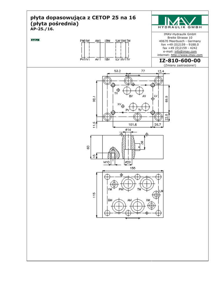 płyta dopasowująca z CETOP 25 na 16 (płyta pośrednia) AP-25./16. IMAV-Hydraulik GmbH Breite Strasse 10 40670 Meerbusch - Germany fon +49 (0)2159 - 9188.0 fax +49 (0)2159 - 4242 e-mail: [email protected] internet: http://www.imav.com IZ-810-600-00 (Zmiany zastrzeżone!) płyta dopasowująca z CETOP 25 na 16 (płyta pośrednia) AP-25./16. IMAV-Hydraulik GmbH Breite Strasse 10 40670 Meerbusch - Germany fon +49 (0)2159 - 9188.0 fax +49 (0)2159 - 4242 e-mail: [email protected] internet: http://www.imav.com Przykład zamówienia: AP - 25S/16S IZ-810-600-00 (Zmiany zastrzeżone!) Klucz typu: wersja urządzenia płyta dopasowująca z ukł. otworów DIN 24340 forma A wielkość konstrukcyjna i materiał dopasowanie z CETOP 8 na CETOP 7 25A/16A = Alu (F37) 25S/16S = stal (9SMnPb28K lub GGG-40) Dane techniczne ciśnienie nominalne: 210 bar (A) 350 bar (S) ciężar: 3,1 / 6,3 kg (A/S) Do zakresu dostawy należą: 4 szt. pierścieni uszczelniających 28,17 x 3,53 3 szt. pierścieni uszczelniających 14,00 x 2,65