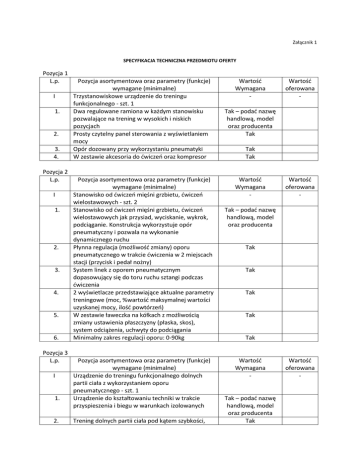 Załącznik 1 SPECYFIKACJA TECHNICZNA PRZEDMIOTU OFERTY Pozycja 1 L.p. I 1. 2. 3. 4. Pozycja 2 L.p. I 1. 2. 3. 4. 5. 6. Pozycja 3 L.p. I 1. 2. Pozycja asortymentowa oraz parametry (funkcje) wymagane (minimalne) Trzystanowiskowe urządzenie do treningu funkcjonalnego - szt. 1 Dwa regulowane ramiona w każdym stanowisku pozwalające na trening w wysokich i niskich pozycjach Prosty czytelny panel sterowania z wyświetlaniem mocy Opór dozowany przy wykorzystaniu pneumatyki W zestawie akcesoria do ćwiczeń oraz kompresor Pozycja asortymentowa oraz parametry (funkcje) wymagane (minimalne) Stanowisko od ćwiczeń mięśni grzbietu, ćwiczeń wielostawowych - szt. 2 Stanowisko od ćwiczeń mięśni grzbietu, ćwiczeń wielostawowych jak przysiad, wyciskanie, wykrok, podciąganie. Konstrukcja wykorzystuje opór pneumatyczny i pozwala na wykonanie dynamicznego ruchu Płynna regulacja (możliwość zmiany) oporu pneumatycznego w trakcie ćwiczenia w 2 miejscach stacji (przycisk i pedał nożny) System linek z oporem pneumatycznym dopasowujący się do toru ruchu sztangi podczas ćwiczenia 2 wyświetlacze przedstawiające aktualne parametry treningowe (moc, %wartość maksymalnej wartości uzyskanej mocy, ilość powtórzeń) W zestawie ławeczka na kółkach z możliwością zmiany ustawienia płaszczyzny (płaska, skos), system odciążenia, uchwyty do podciągania Minimalny zakres regulacji oporu: 0-90kg Pozycja asortymentowa oraz parametry (funkcje) wymagane (minimalne) Urządzenie do treningu funkcjonalnego dolnych partii ciała z wykorzystaniem oporu pneumatycznego - szt. 1 Urządzenie do kształtowaniu techniki w trakcie przyspieszenia i biegu w warunkach izolowanych Trening dolnych partii ciała pod kątem szybkości, Wartość Wymagana - Wartość oferowana - Tak – podać nazwę handlową, model oraz producenta Tak Tak Tak Wartość Wymagana - Wartość oferowana - Tak – podać nazwę handlową, model oraz producenta Tak Tak Tak Tak Tak Wartość Wymagana - Tak – podać nazwę handlową, model oraz producenta Tak Wartość oferowana - 3. 4. Pozycja 4 L.p. I 1. 2. 3. 4. Pozycja 5 L.p. I 1. 2. 3. 4. 5. 6. 7. Pozycja 6 L.p. I 1. 2. 3. 4. przyspieszenia, mocy eksplozywnej Wyświetlacz POWER z podglądem generowanej mocy. Podłączenie pod kompresor Pozycja asortymentowa oraz parametry (funkcje) wymagane (minimalne) Urządzenie do treningu funkcjonalnego dolnych partii ciała z wykorzystaniem oporu pneumatycznego - szt. 1 Urządzenie umożliwia selektywne ćwiczenie mięśni obręczy biodrowej w każdej płaszczyźnie dla potrzeb kształtowania siły, mocy, wytrzymałości Trening dolnych partii ciała pod kątem szybkości, przyspieszenia, mocy eksplozywnej Wyświetlacz podglądem parametrów ćwiczenia Podłączenie pod kompresor Pozycja asortymentowa oraz parametry (funkcje) wymagane (minimalne) Urządzenie do treningu funkcjonalnego dolnych partii ciała z wykorzystaniem oporu pneumatycznego - szt. 1 Urządzenie do treningu funkcjonalnego dolnych partii ciała z wykorzystaniem oporu pneumatycznego Trening dolnych partii ciała pod kątem szybkości, przyspieszenia, mocy eksplozywnej Regulowana na wysokość podstawa Wyświetlacz podglądem parametrów ćwiczenia Podłączenie pod kompresor Wymiary max. 1727x1270x1016 mm Waga max 98 kg Pozycja asortymentowa oraz parametry (funkcje) wymagane (minimalne) Urządzenie do treningu funkcjonalnego górnych partii ciała z wykorzystaniem oporu pneumatycznego - szt. 1 Urządzenie pozwala na połączenie złożonego ruchu wyciskania klatki piersiowej w jednym ćwiczeniu Trening górnych partii ciała pod kątem szybkości, przyspieszenia, mocy eksplozywnej Wyświetlacz POWER z podglądem generowanej mocy Różnicowanie ruchu prawej i lewej strony ciała Tak Tak Wartość Wymagana - Wartość oferowana - Tak – podać nazwę handlową, model oraz producenta Tak Tak Tak Wartość Wymagana - Wartość oferowana - Tak – podać nazwę handlową, model oraz producenta Tak Tak Tak Tak Tak Tak Wartość Wymagana - Tak – podać nazwę handlową, model oraz producenta Tak Tak Tak Wartość oferowana - 5. 6. 7. Pozycja 7 L.p. I 1. 2. 3. 4. 5. 6. 7. Pozycja 8 L.p. I 1. 2. 3. 4. 5. 6. 7. Pozycja 9 L.p. I 1. podczas ćwiczenia Podłączenie pod kompresor Wymiary max. 1930x1168x1524 mm Waga max. 85kg Pozycja asortymentowa oraz parametry (funkcje) wymagane (minimalne) Urządzenie do treningu funkcjonalnego górnych partii ciała z wykorzystaniem oporu pneumatycznego - szt. 1 Urządzenie pozwala wykonywać w optymalnej formie ćwiczenia przyciągania dla mięśni pleców w pozycji siedzącej Trening górnych partii ciała pod kątem szybkości, przyspieszenia, mocy eksplozywnej Urządzenie wyposażone jest w regulowaną poduszkę na klatkę piersiową Wyświetlacz podglądem parametrów ćwiczenia Podłączenie pod kompresor Wymiary max. 1981x1143x1219 mm Waga max 82kg Pozycja asortymentowa oraz parametry (funkcje) wymagane (minimalne) Urządzenie do treningu funkcjonalnego dolnych partii ciała z wykorzystaniem oporu pneumatycznego - szt. 1 Urządzenie umożliwia optymalne kształtowanie mięśni dwugłowych w izolowanej pozycji w ustalonym zakresie ruchu z wyborem pracy jednonóż lub obunóż Trening dolnych partii ciała pod kątem szybkości, przyspieszenia, mocy eksplozywnej Wyświetlacz podglądem parametrów ćwiczenia Możliwość korygowania dysbalansu pomiędzy stronami ciała i grupami mięśniowymi Podłączenie pod kompresor Wymiary max. 838x889x1778mm Waga max 69 kg Pozycja asortymentowa oraz parametry (funkcje) wymagane (minimalne) Urządzenie do treningu funkcjonalnego dolnych partii ciała z wykorzystaniem oporu pneumatycznego - szt. 1 Urządzenie do treningu funkcjonalnego dolnych partii ciała z wykorzystaniem oporu pneumatycznego, umożliwia ćwiczenie osobom o Tak Tak Tak Wartość Wymagana - Wartość oferowana - Tak – podać nazwę handlową, model oraz producenta Tak Tak Tak Tak Tak Tak Wartość Wymagana - Wartość oferowana - 