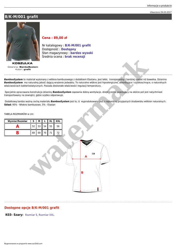 Informacje o produkcie Utworzono 04-03-2017 B/K-M/001 grafit Cena : 89,00 zł er m ar k Nr katalogowy : B/K-M/001 grafit Dostępność : Dostępny Stan magazynowy : bardzo wysoki Średnia ocena : brak recenzji BambooSystem to materiał wykonany z włókna bambusowego z dodatkiem Elastanu. Jest lekki, transparentny i bardziej miękki niż bawełna. Dzianina BambooSystem ma naturalną jakość dającą wrażenie jedwabiu. To naturalne włókno jest hipoalergiczne, absorbujące i szybkoschnące, o naturalnych właściwościach bakteriostatycznych. Posiada doskonałe właściwości regulacji temperatury. Specjalnie opracowana konstrukcja dzianiny BambooSystem zapewnia dobrą wentylacje, dzięki czemu powstający na skórze pot jest natychmiast transportowany na zewnątrz, gdzie szybko odparowuje. Dodatkową bardzo ważną cechą materiału BambooSystem jest to, iż wyprodukowany jest z najbardziej przyjaznych środowisku włókien naturalnych. Skład: 95% - Włokno bambusowe, 5% - Elastan TABELA ROZMIARÓW w cm: Wymiar/Rozmiar M L 52 53 54 68 69 70 XL XXL 55 56 71 72 w at A B S Dostępne opcje B/K-M/001 grafit K03- Szary: Rozmiar S, Rozmiar XXL. Wygenerowano w programie www.oscGold.com