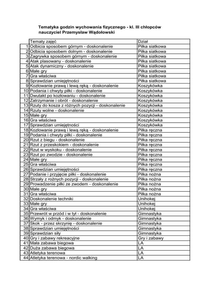 Tematyka godzin wychowania fizycznego - kl. III chłopców nauczyciel Przemysław Wądołowski 1 2 3 4 5 6 7 8 9 10 11 12 13 14 15 16 17 18 19 20 21 22 23 24 25 26 27 28 29 30 31 32 33 34 35 36 37 38 39 40 41 42 43 44 Tematy zajęć Odbicia sposobem górnym - doskonalenie Odbicia sposobem dolnym - doskonalenie Zagrywka sposobem górnym - doskonalenie Atak plasowany - doskonalenie Atak dynamiczny - doskonalenie Małe gry Gra właściwa Sprawdzian umiejętności Kozłowanie prawą i lewą ręką - doskonalenie Podania i chwyty piłki - doskonalenie Dwutakt po kozłowaniu - doskonalenie Zatrzymanie i obrót - doskonalenie Rzuty do kosza z różnych pozycji - doskonalenie Rzuty wolne - doskonalenie Małe gry Gra właściwa Sprawdzian umiejętności Kozłowanie prawą i lewą ręką - doskonalenie Podania i chwyty piłki - doskonalenie Rzut z biegu - doskonalenie Rzut z przeskokiem - doskonalenie Rzut w wyskoku - doskonalenie Rzut po zwodzie - doskonalenie Małe gry Gra właściwa Sprawdzian umiejętności Podanie i przyjęcie piłki - doskonalenie Strzały z rożnych pozycji - doskonalenie Prowadzenie piłki ze zwodem - doskonalenie Małe gry Gra właściwa Doskonalenie techniki Małe gry Gra właściwa Przewrót w przód i w tył - doskonalenie Wymyk i odmyk - doskonalenie Skok - przez skrzynię - doskonalenie Sprawdzian umiejętności Sprawdzian siły Gry i zabawy rekreacyjne Mała zabawa biegowa Duża zabawa biegowa Atletyka terenowa Atletyka terenowa - nordic walking Dział Piłka siatkowa Piłka siatkowa Piłka siatkowa Piłka siatkowa Piłka siatkowa Piłka siatkowa Piłka siatkowa Piłka siatkowa Koszykówka Koszykówka Koszykówka Koszykówka Koszykówka Koszykówka Koszykówka Koszykówka Koszykówka Piłka ręczna Piłka ręczna Piłka ręczna Piłka ręczna Piłka ręczna Piłka ręczna Piłka ręczna Piłka ręczna Piłka ręczna Piłka nożna Piłka nożna Piłka nożna Piłka nożna Piłka nożna Unihokej Unihokej Unihokej Gimnastyka Gimnastyka Gimnastyka Gimnastyka Gimnastyka Gry i zabawy LA LA LA LA 45 46 47 48 49 50 Biegi sprinterskie - 100 m Biegi średnie - 400 m Biegi średnie - 1500 m Nauka jazdy na łyżwach Doskonalenie jazdy na łyżwach Gry i zabawy na lodowisku LA LA LA Łyżwiarstwo Łyżwiarstwo Łyżwiarstwo